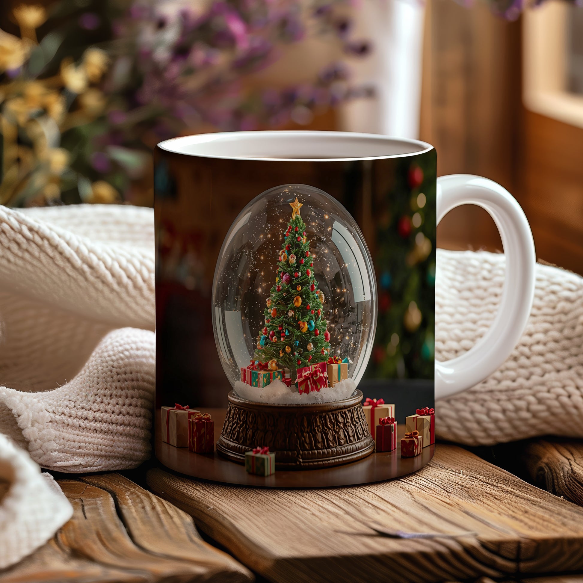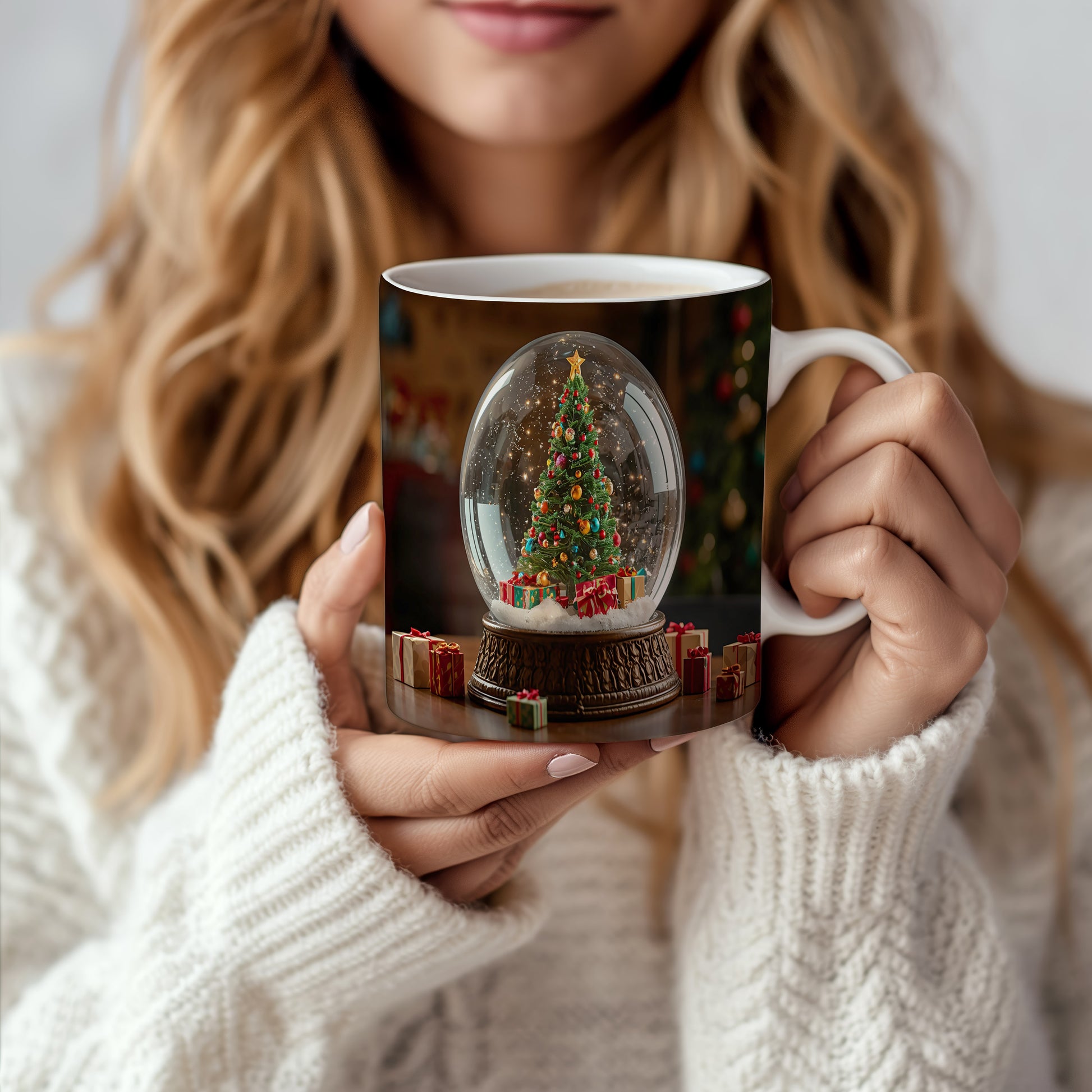 Na hrnku je vyobrazen sněhový glóbus s vánočním stromečkem a dárky, obklopený jemnými světýlky. Tmavé pozadí dodává motivu útulnou atmosféru. Hrnek 330ml – vhodný do myčky i mikrovlnky.