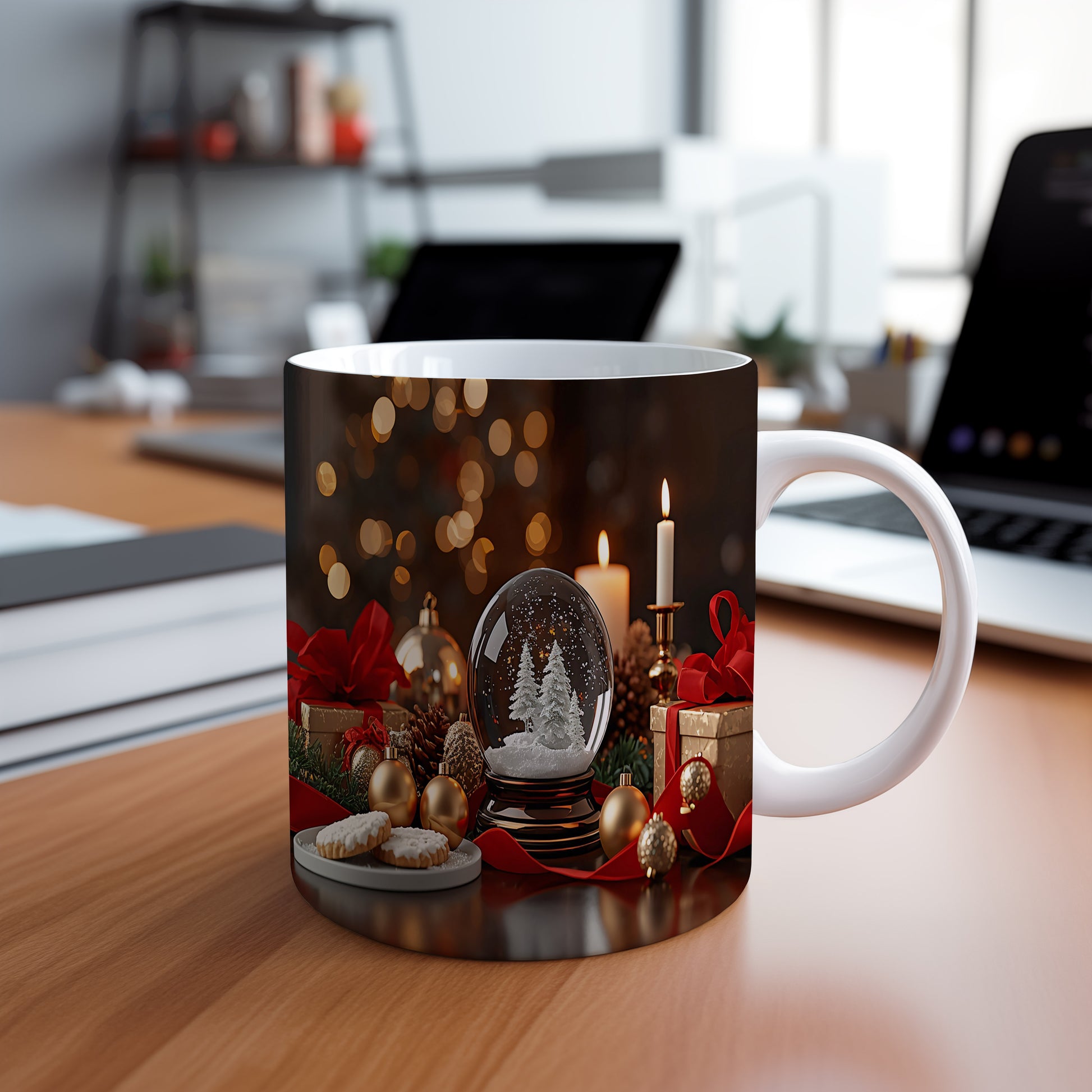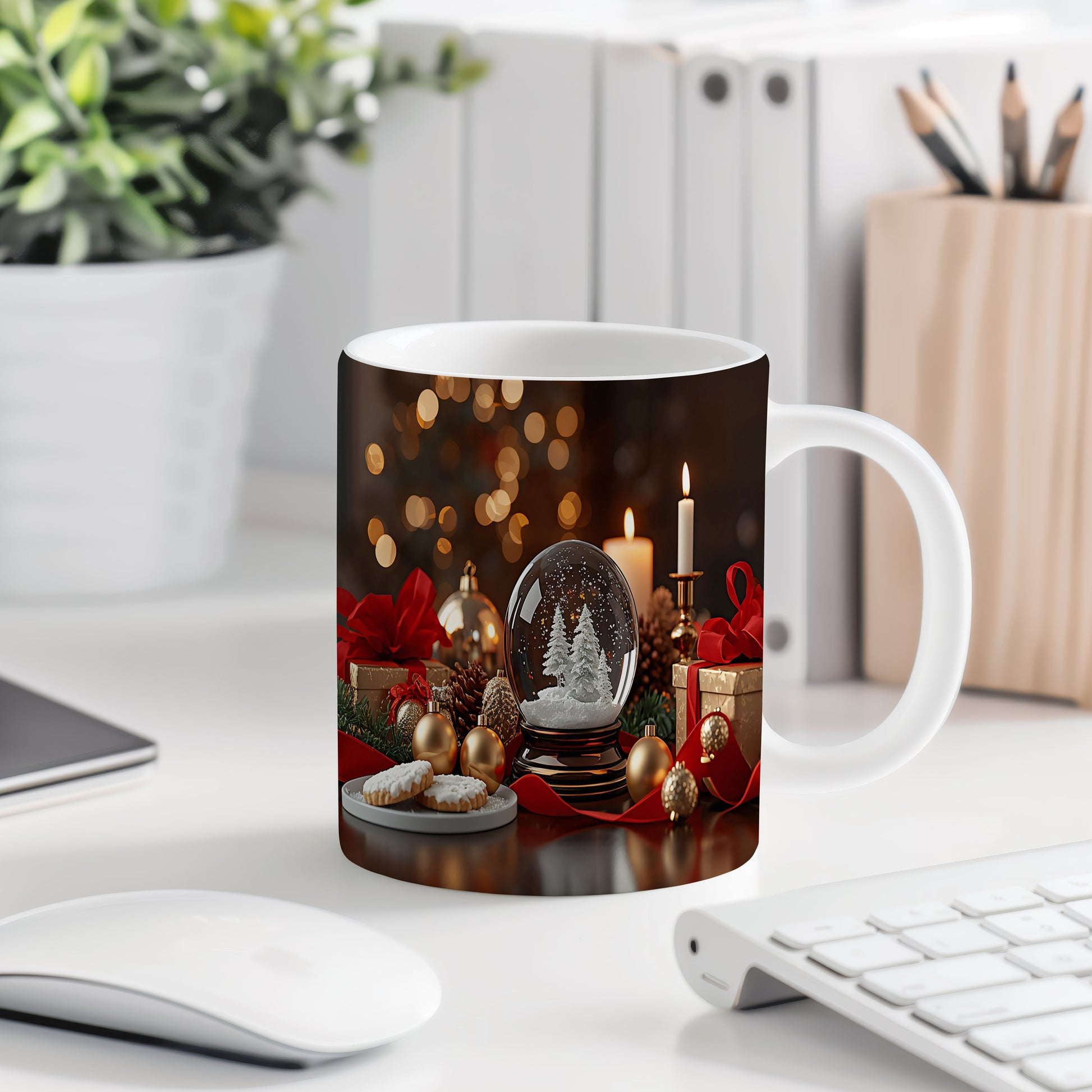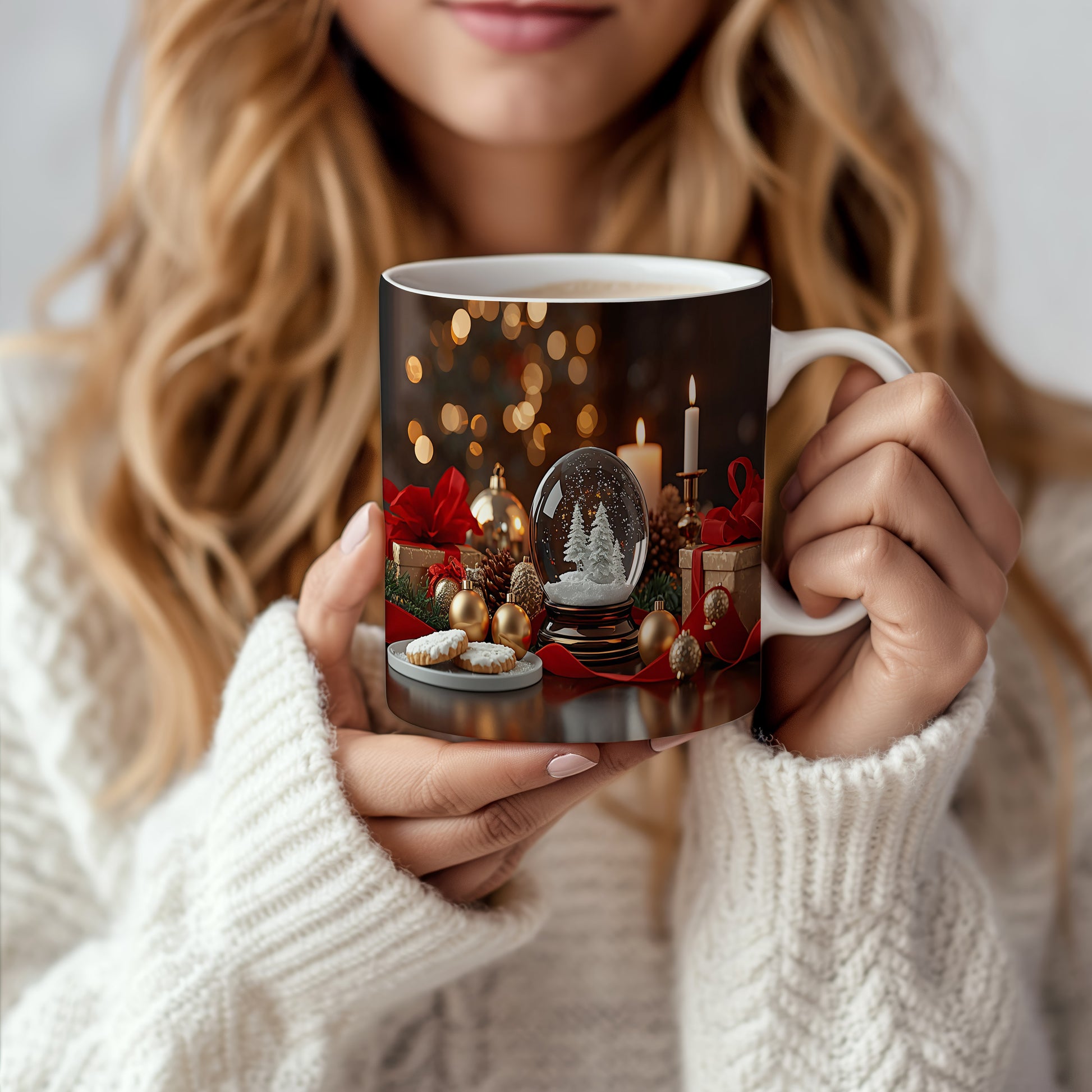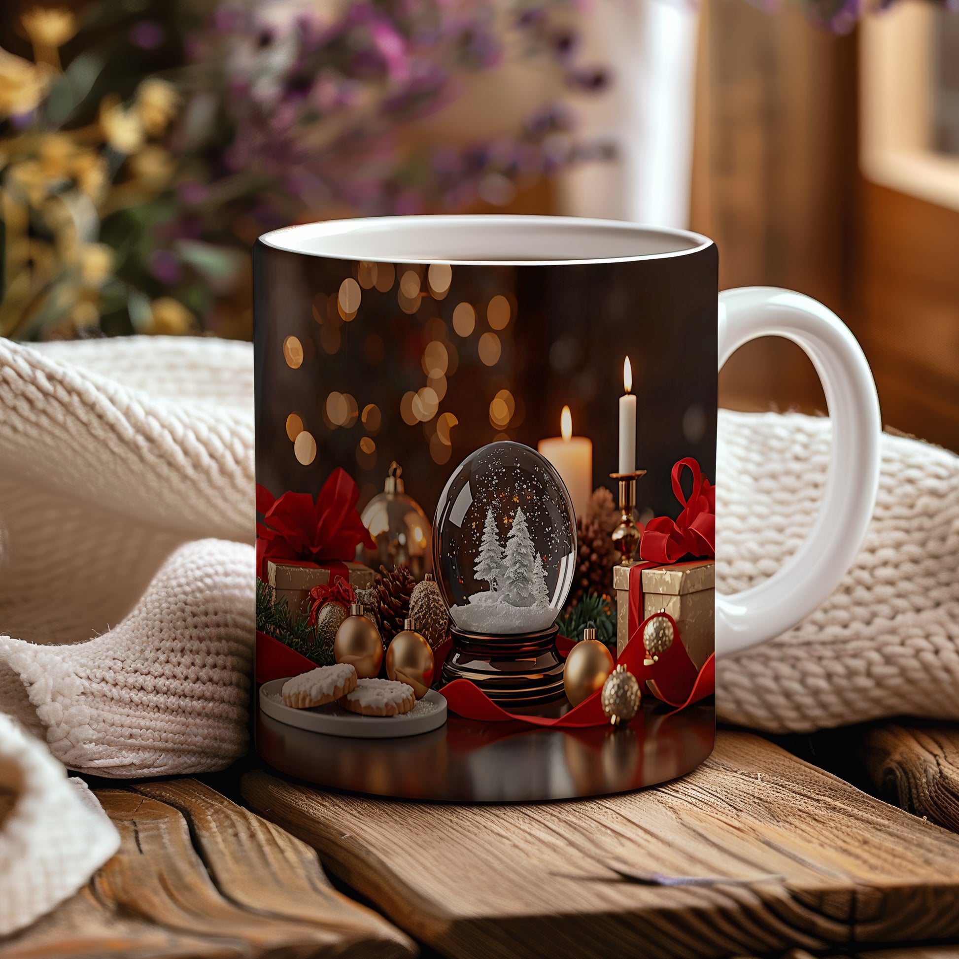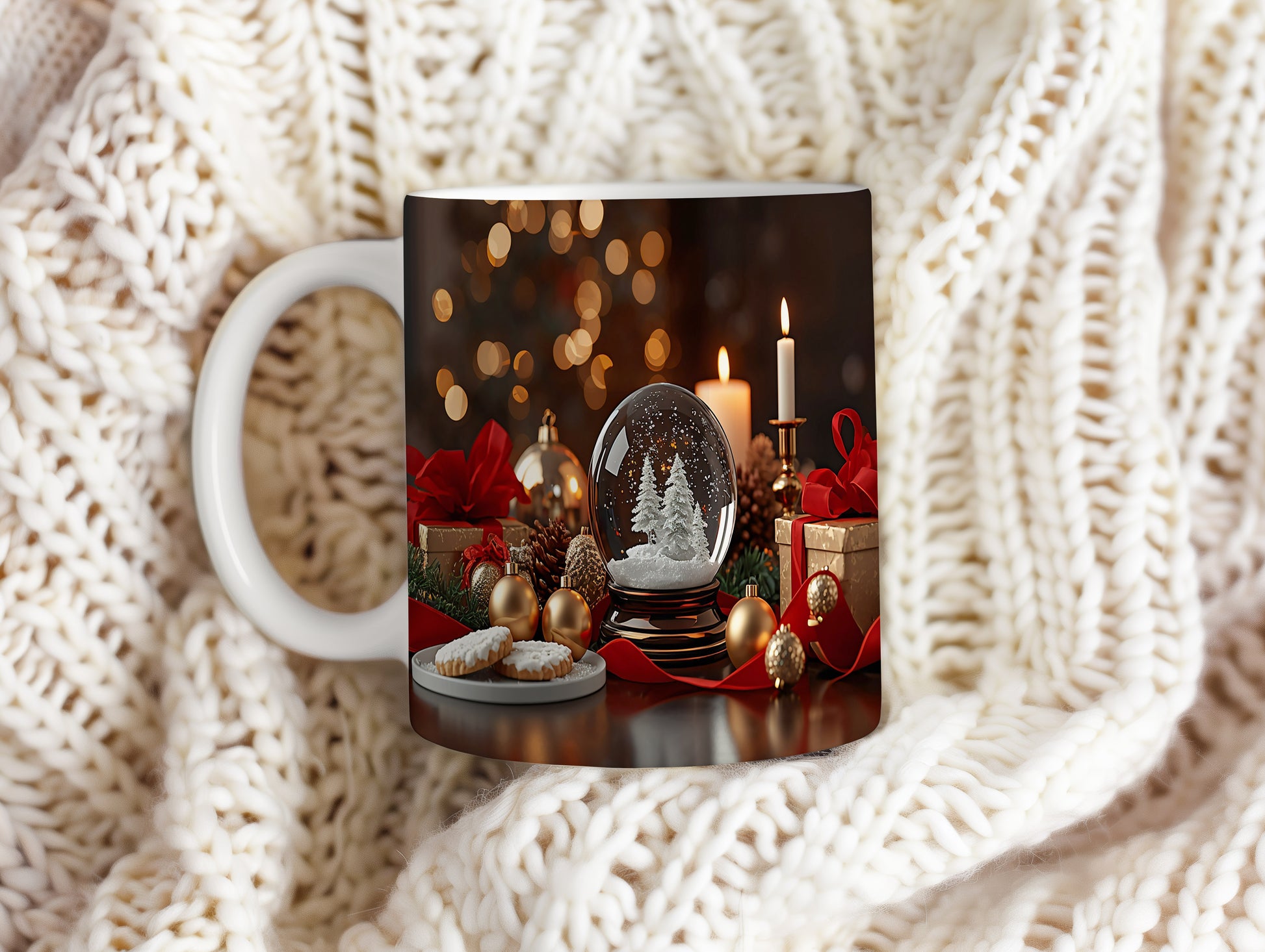 Hrnek zdobí kouzelná sněhová koule s vánočními stromky, obklopená svíčkami a zlatými ozdobami. Temné pozadí dodává sváteční atmosféru. Hrnek 330ml – vhodný do myčky i mikrovlnky.