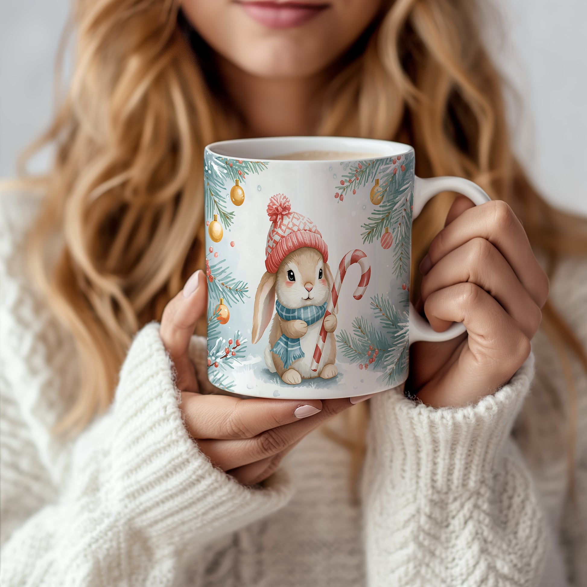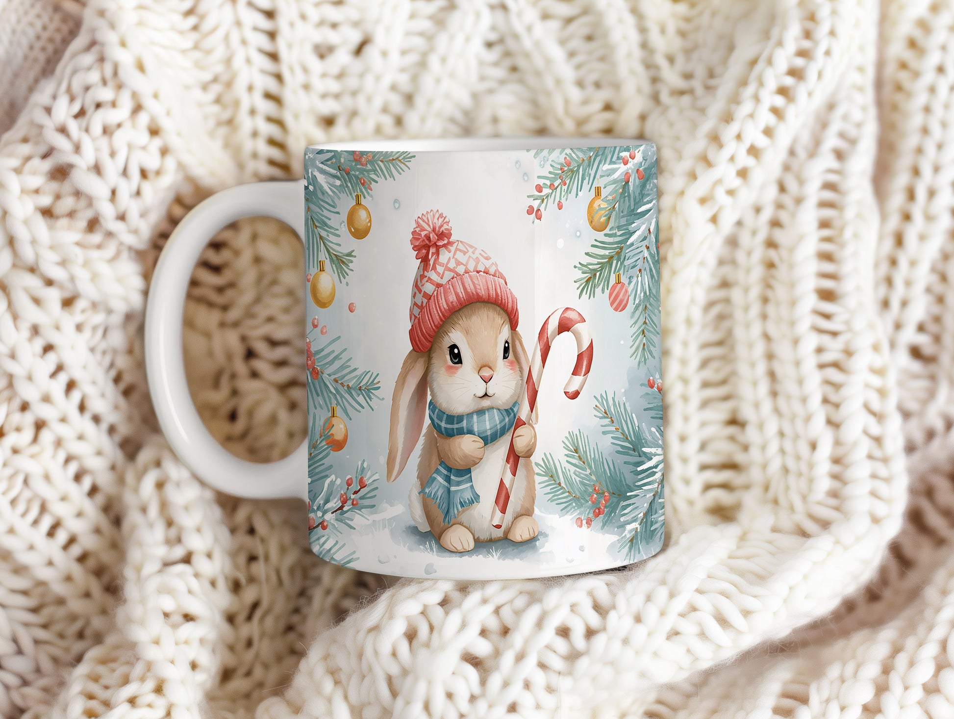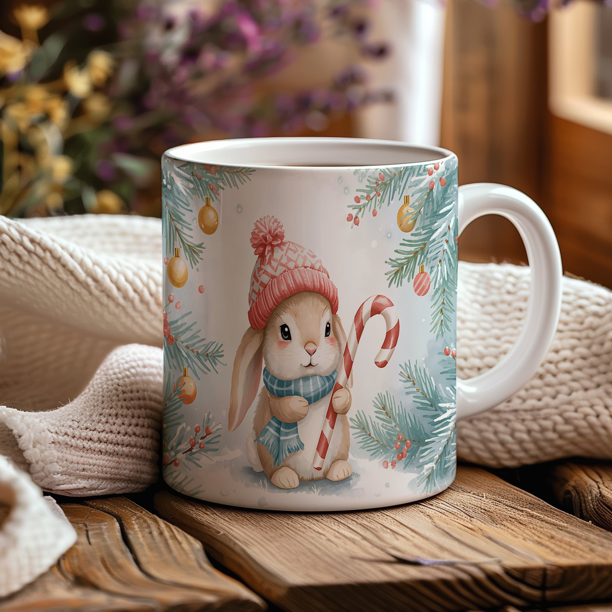 Roztomilý králíček v čepici a šále drží cukrovou hůlku, obklopený větvičkami a ozdobami. Jemné pastelové barvy navozují sváteční atmosféru. Hrnek 330ml – vhodný do myčky i mikrovlnky.