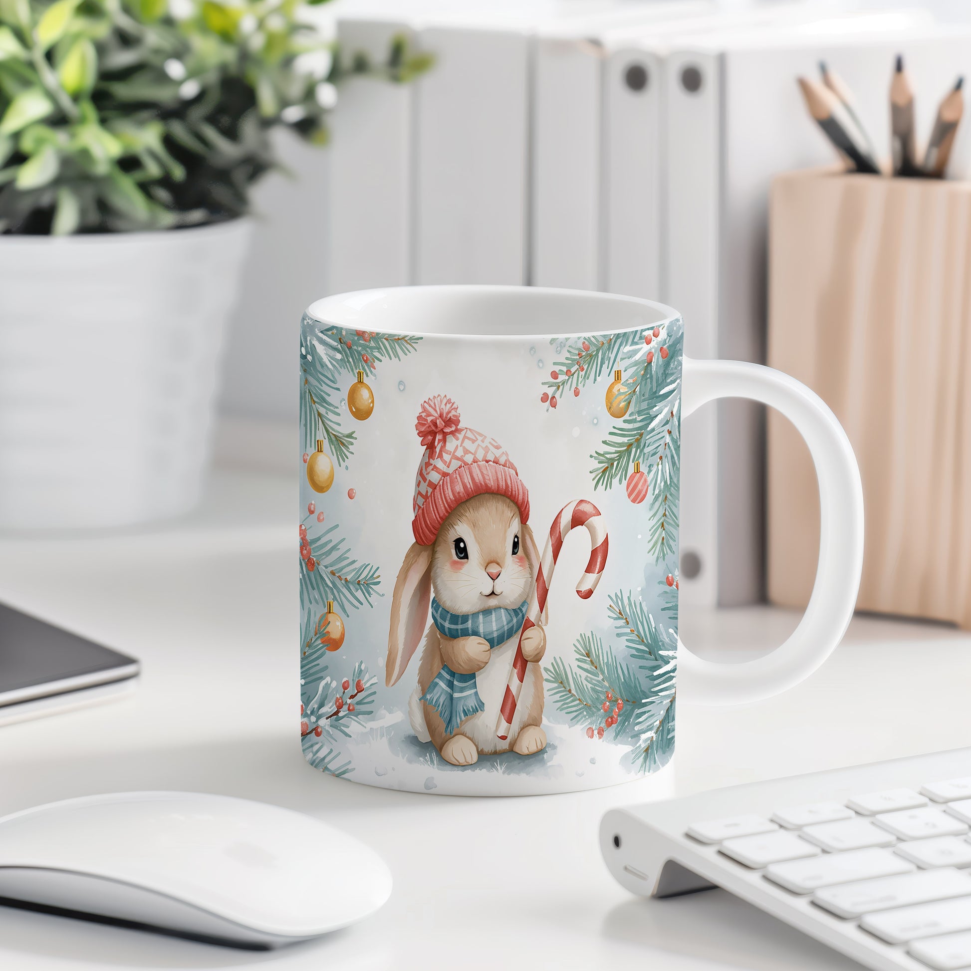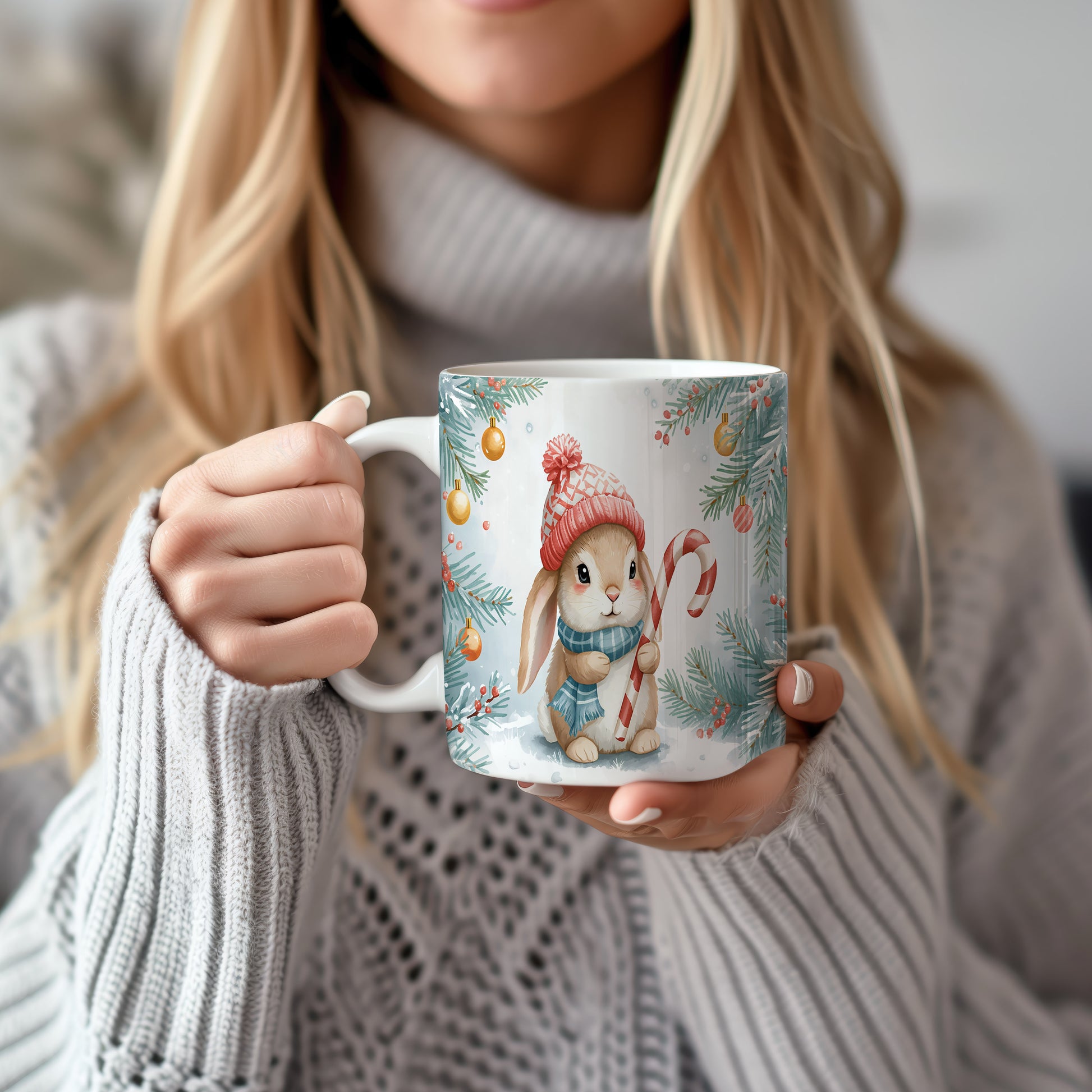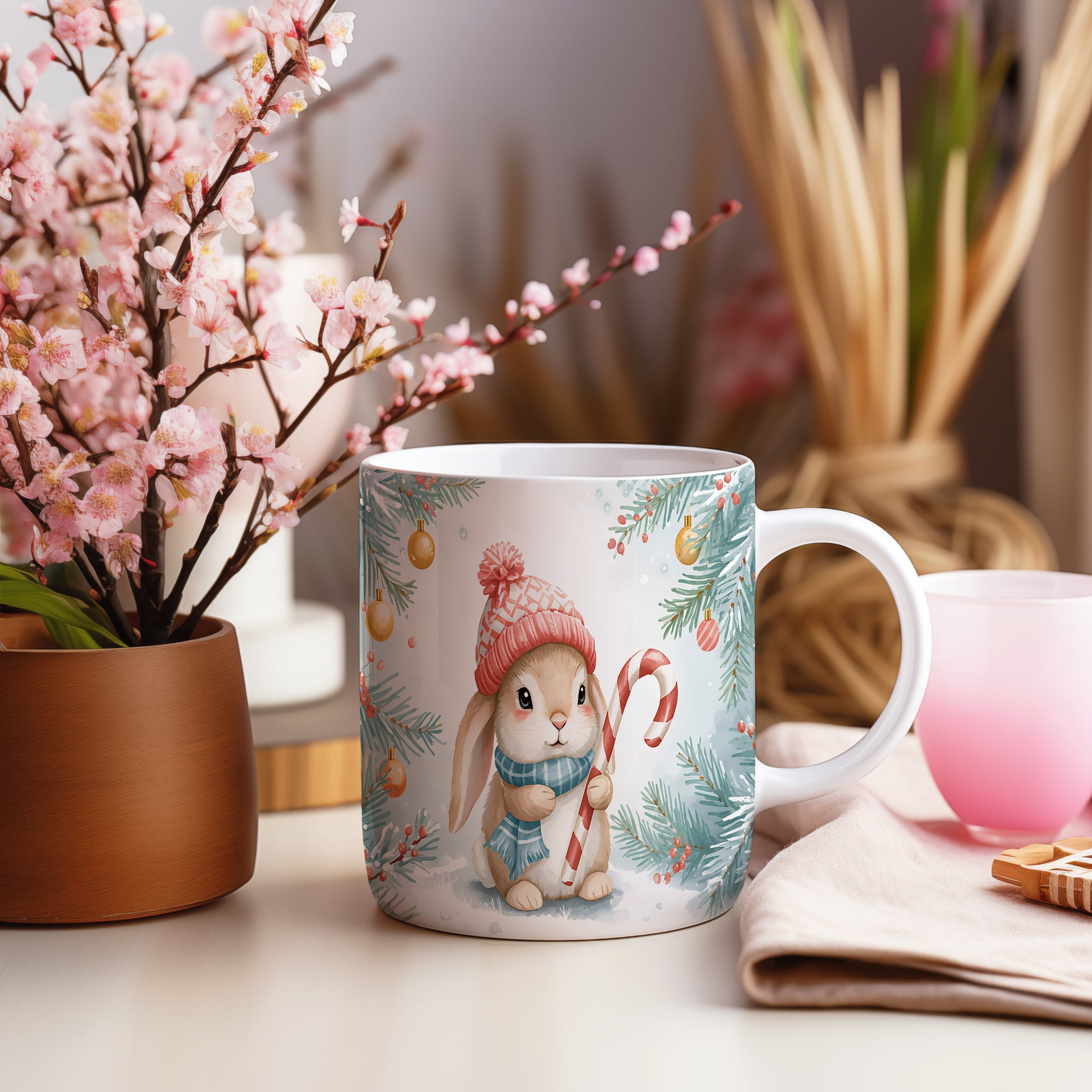 Roztomilý králíček v čepici a šále drží cukrovou hůlku, obklopený větvičkami a ozdobami. Jemné pastelové barvy navozují sváteční atmosféru. Hrnek 330ml – vhodný do myčky i mikrovlnky.