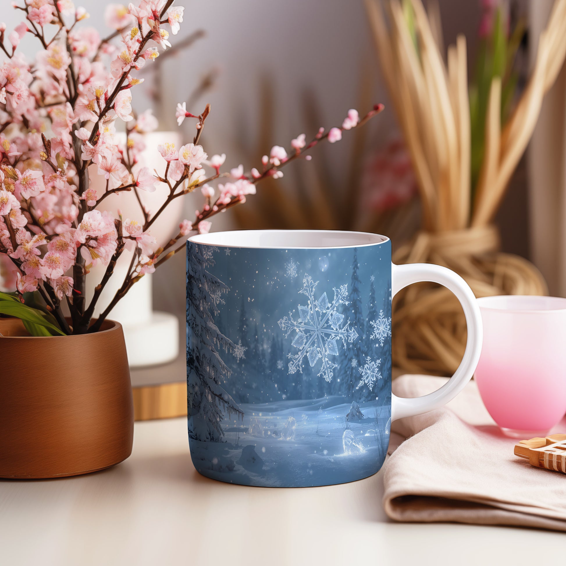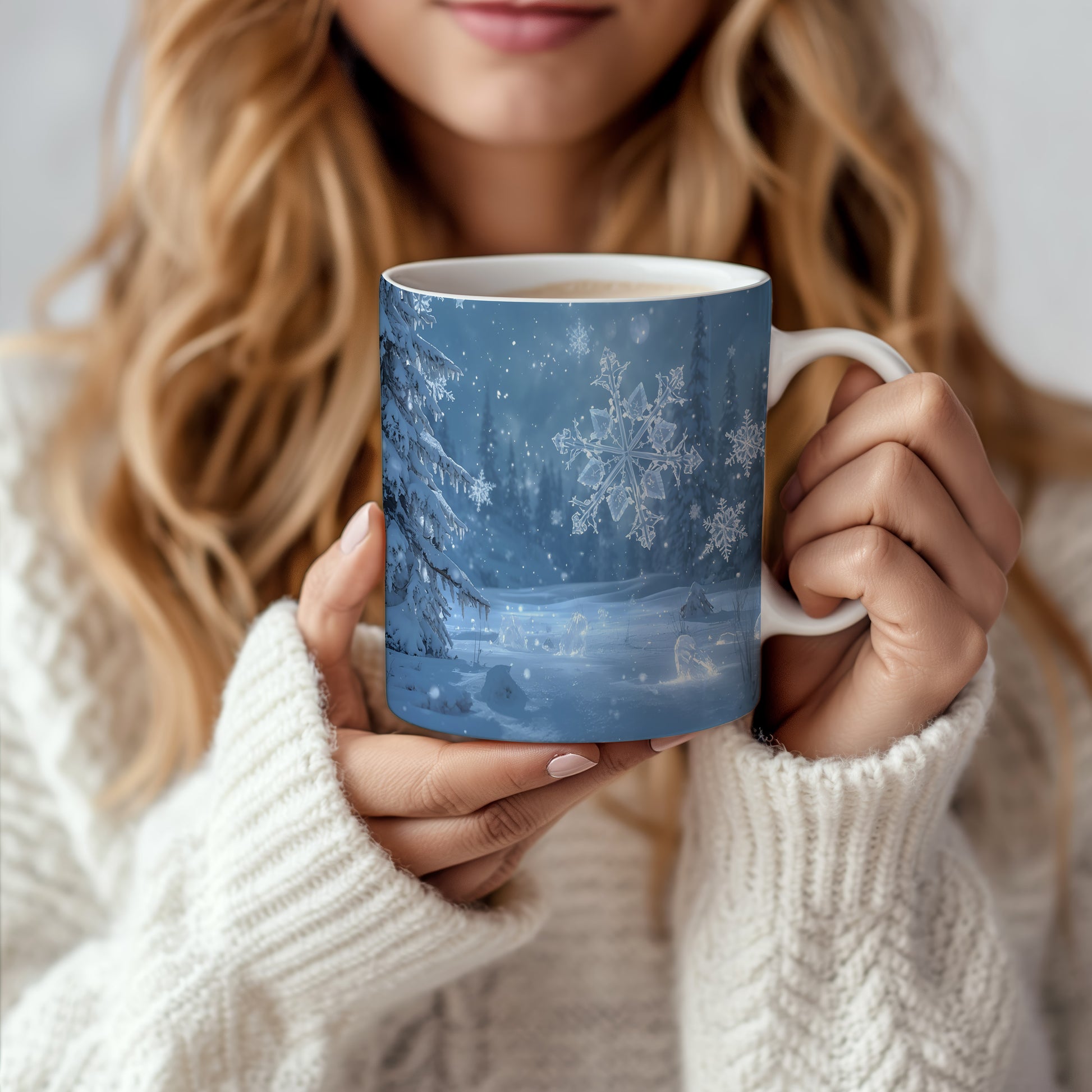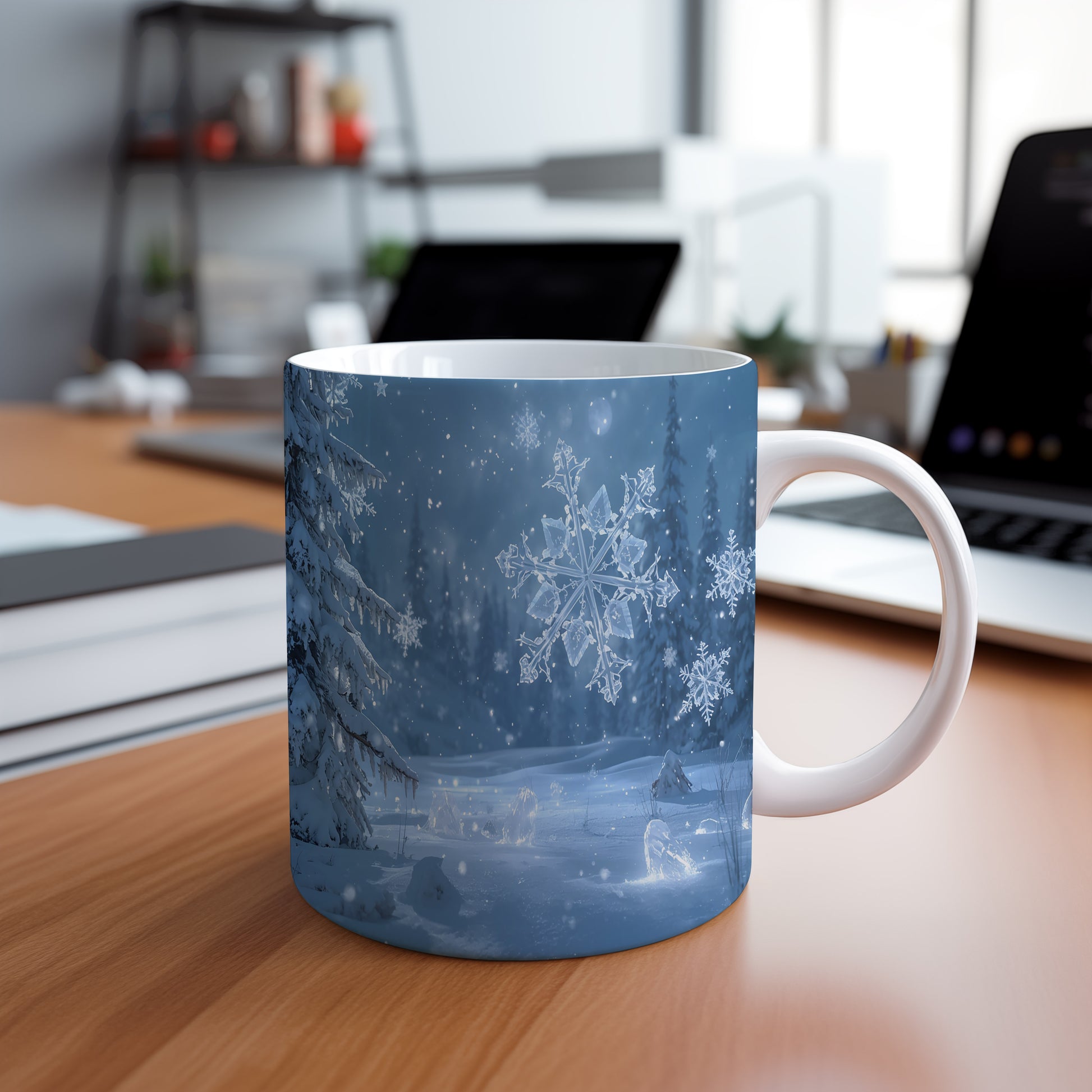 Hrnek s vánočním motivem – ledové vločky v lese