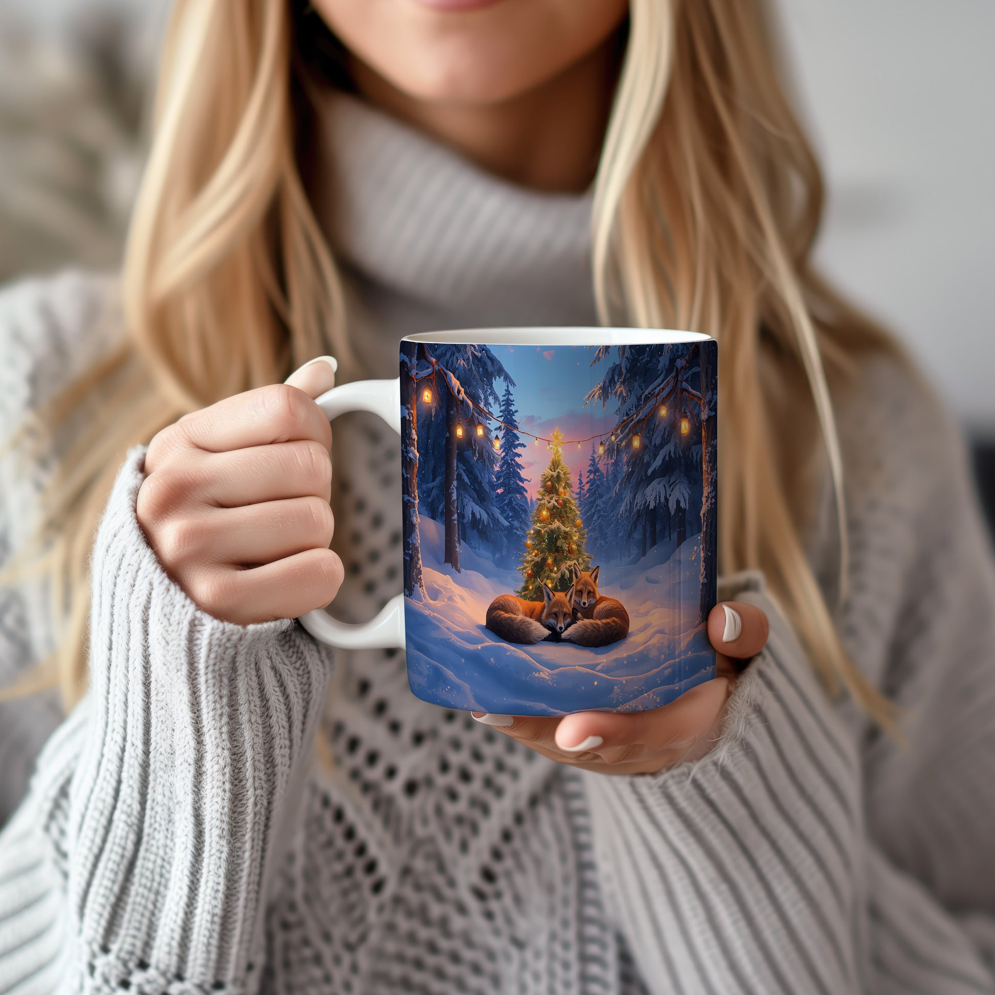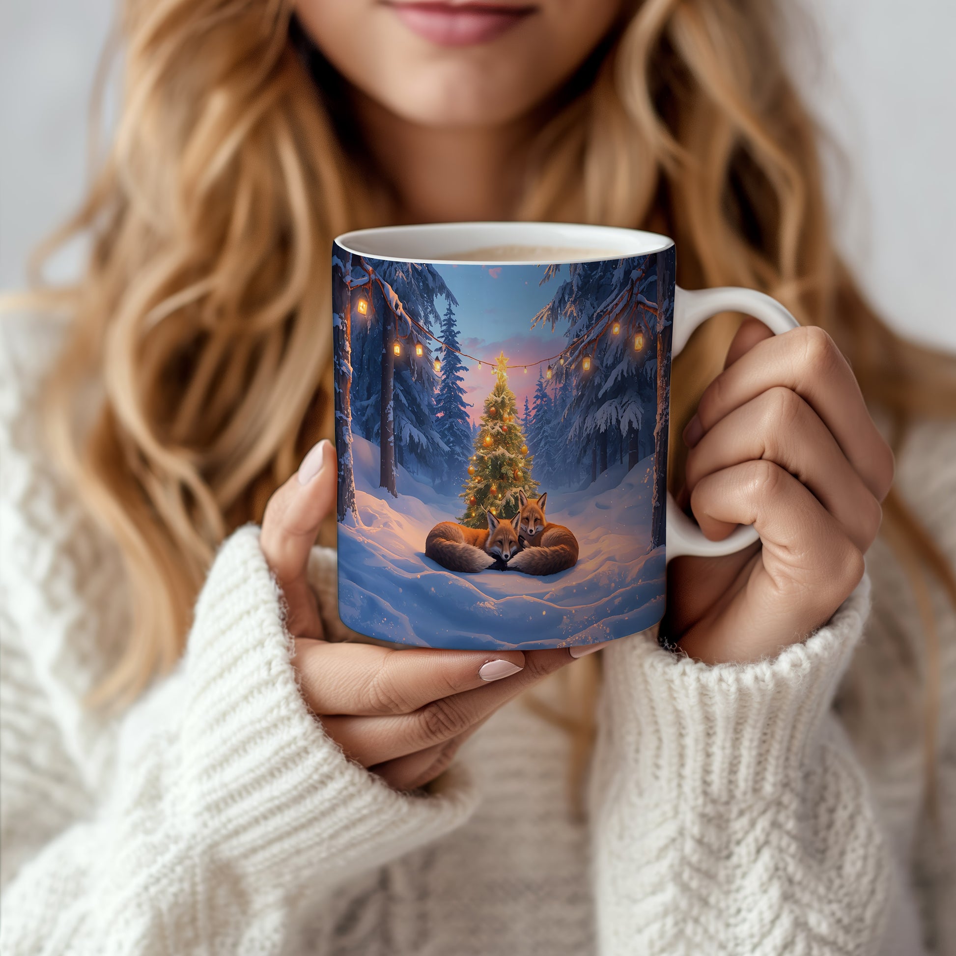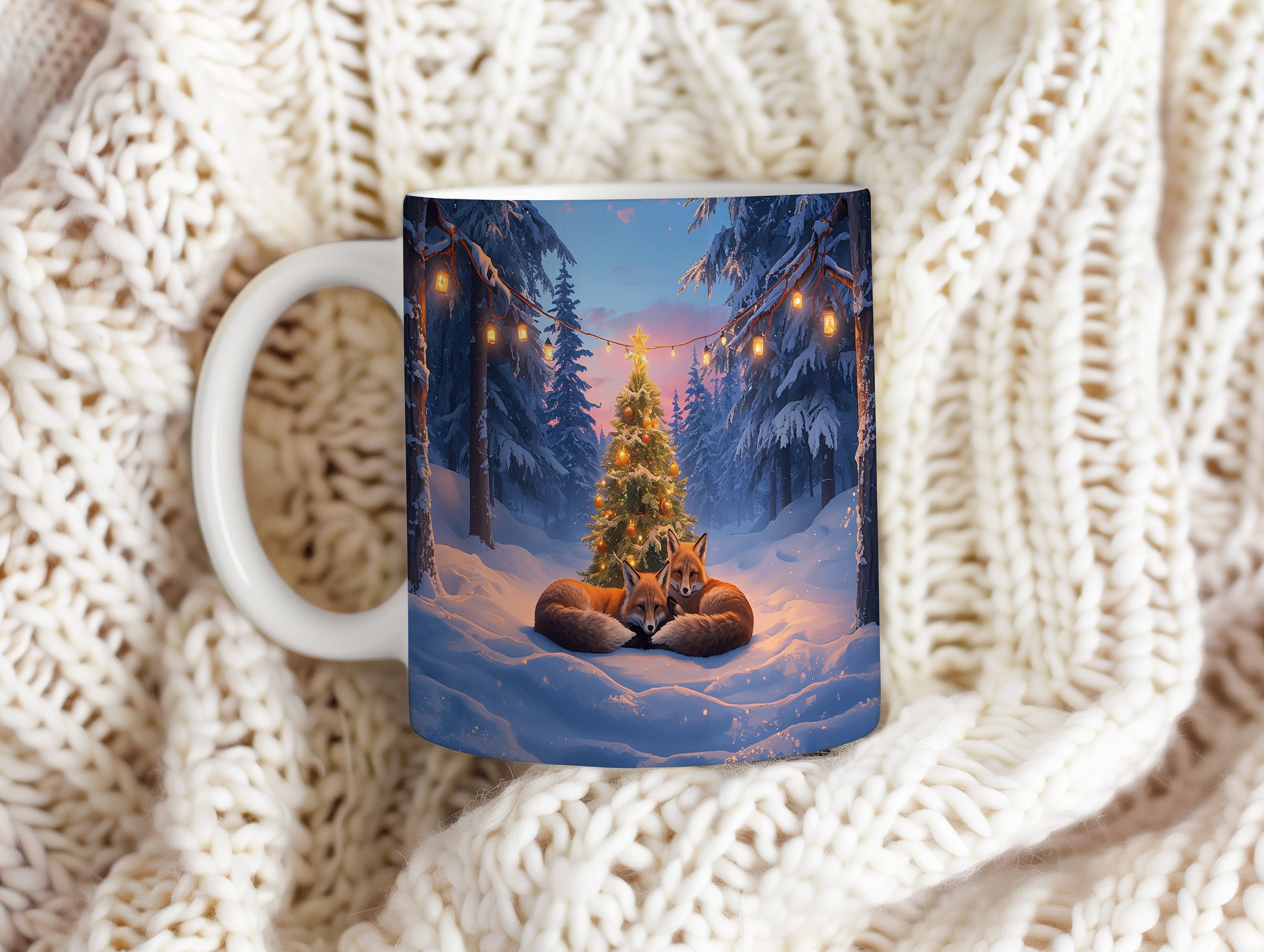 Na hrnku jsou dvě lišky ležící v zasněženém lese s ozdobeným vánočním stromkem a světýlky. Atmosféra je klidná a kouzelná. Hrnek 330ml – vhodný do myčky i mikrovlnky.