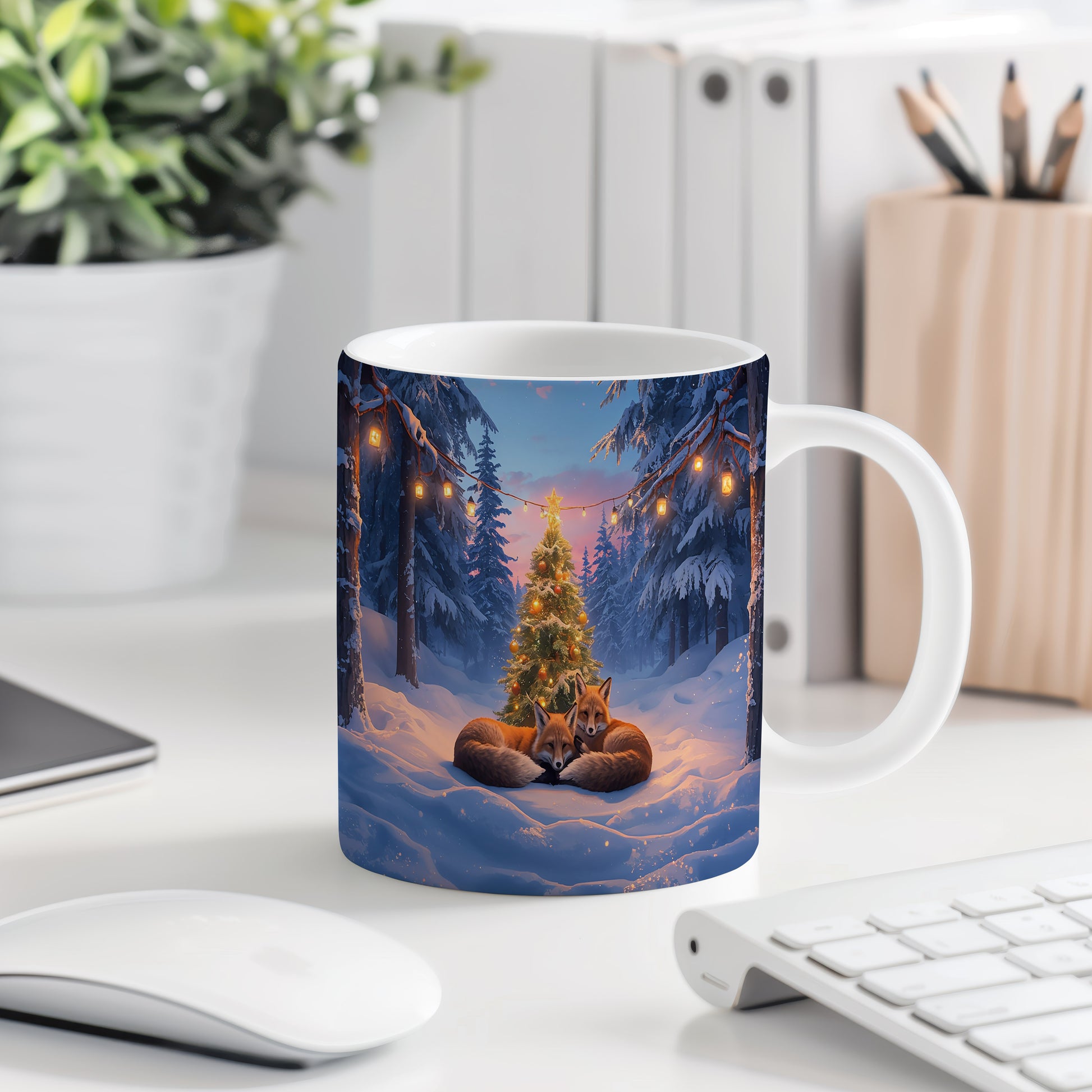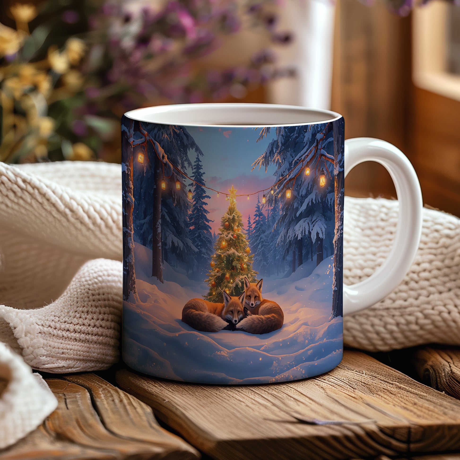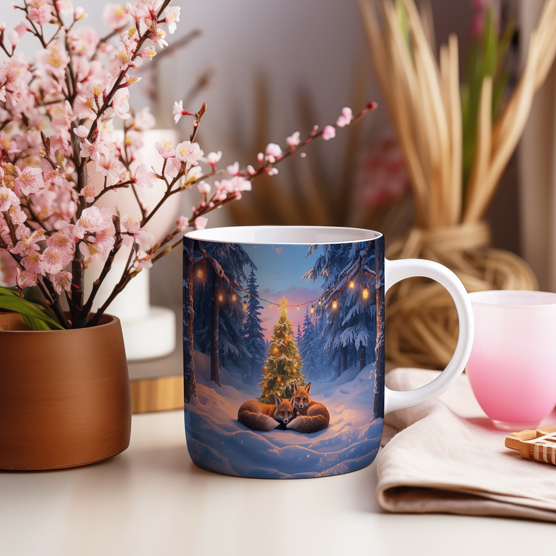 Na hrnku jsou dvě lišky ležící v zasněženém lese s ozdobeným vánočním stromkem a světýlky. Atmosféra je klidná a kouzelná. Hrnek 330ml – vhodný do myčky i mikrovlnky.