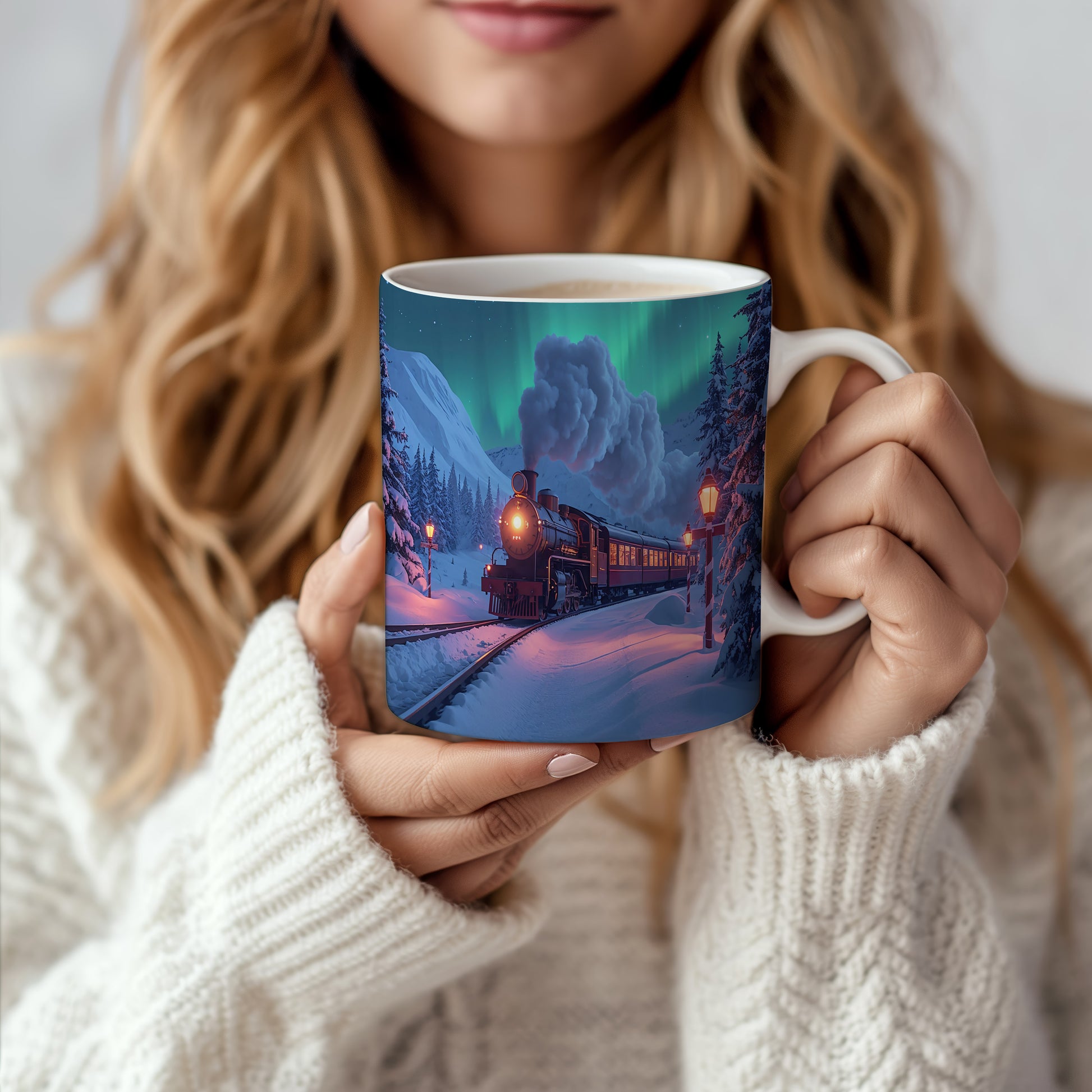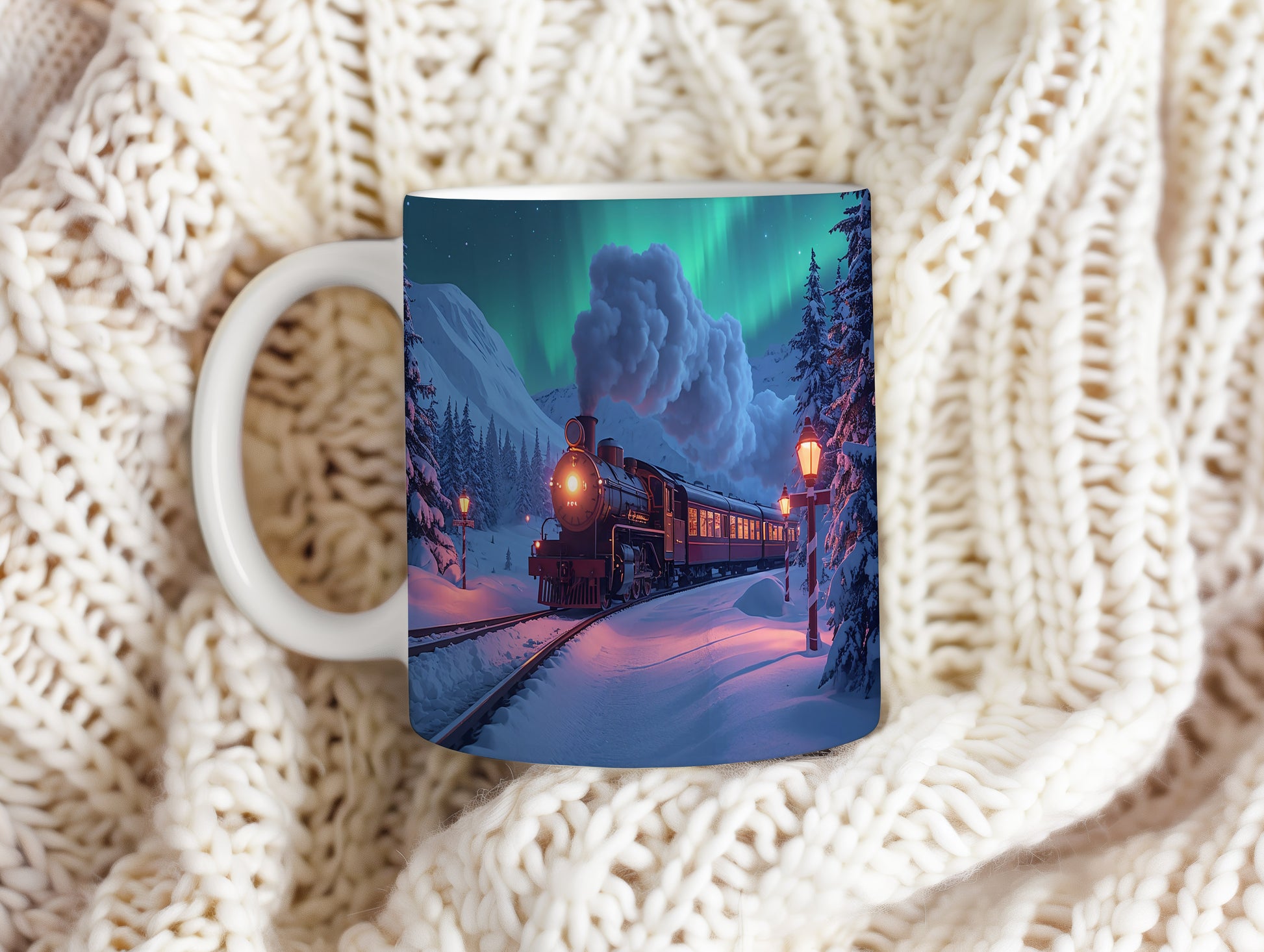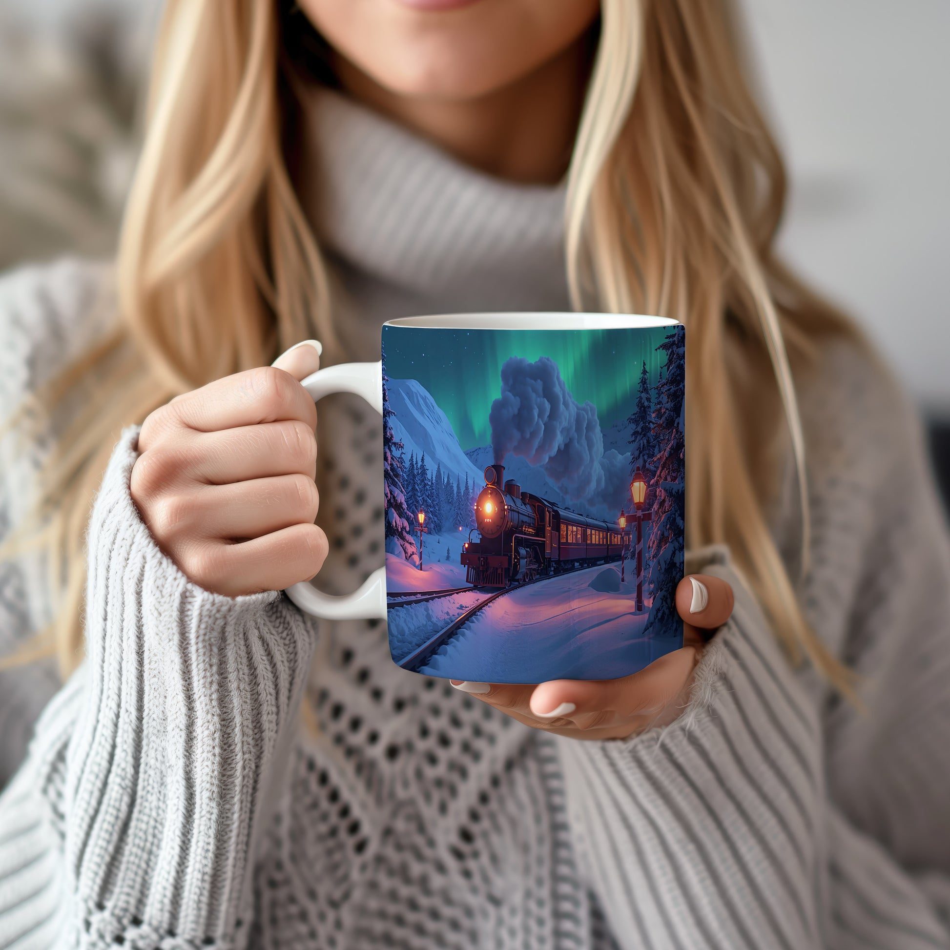 Hrnek s vánočním motivem – noční vlak v horách – sníh, vlak, polární záře