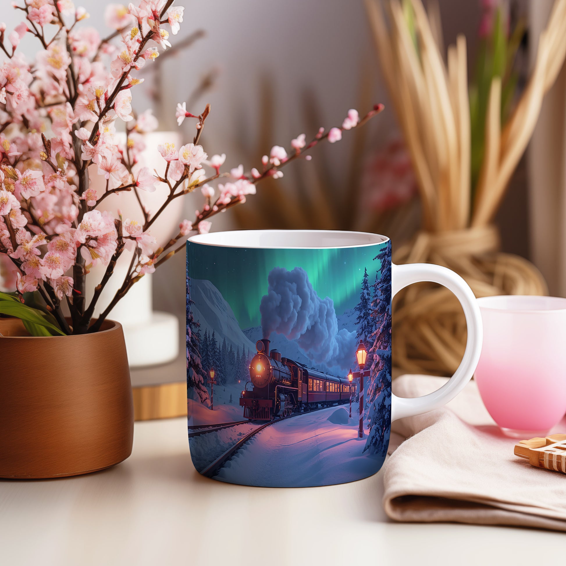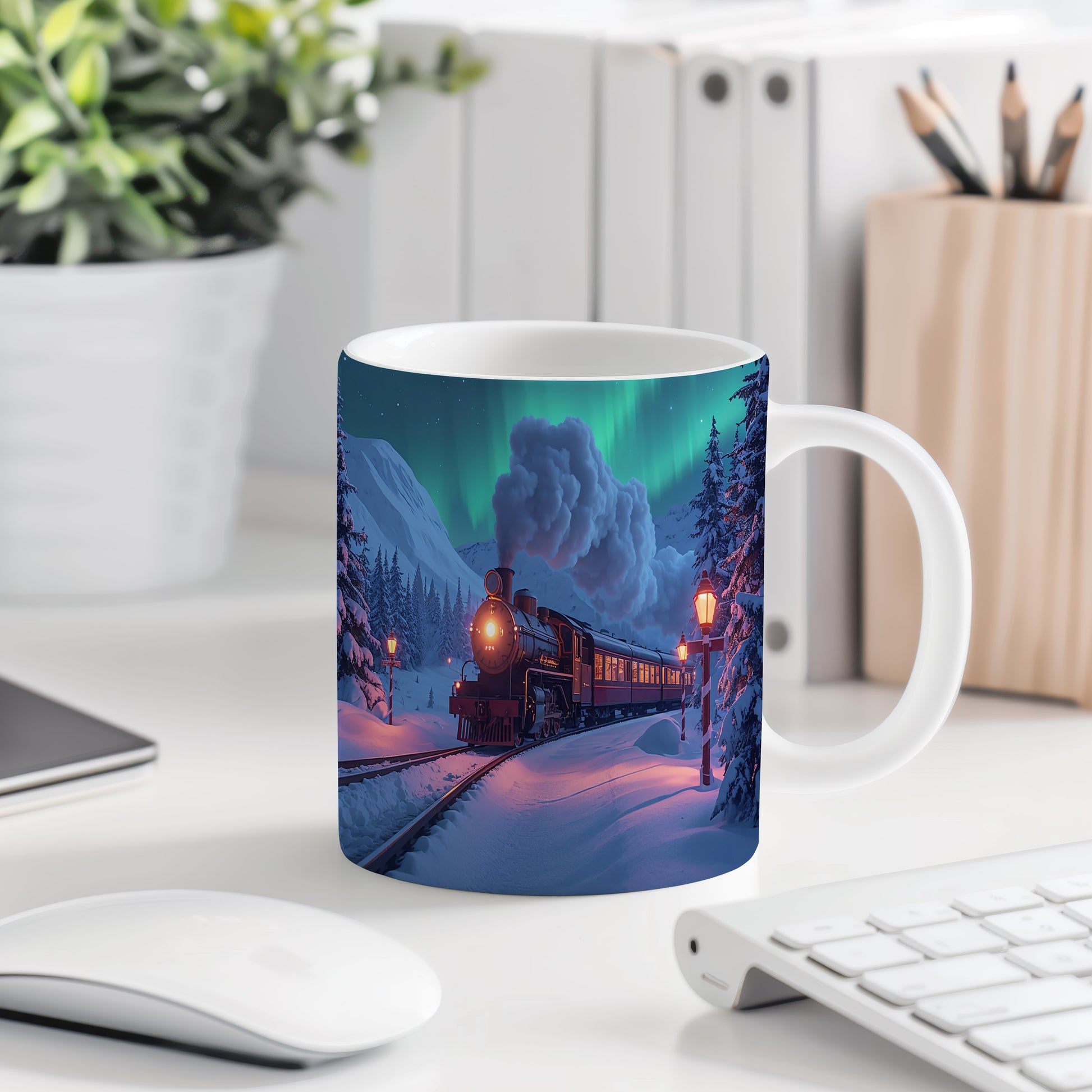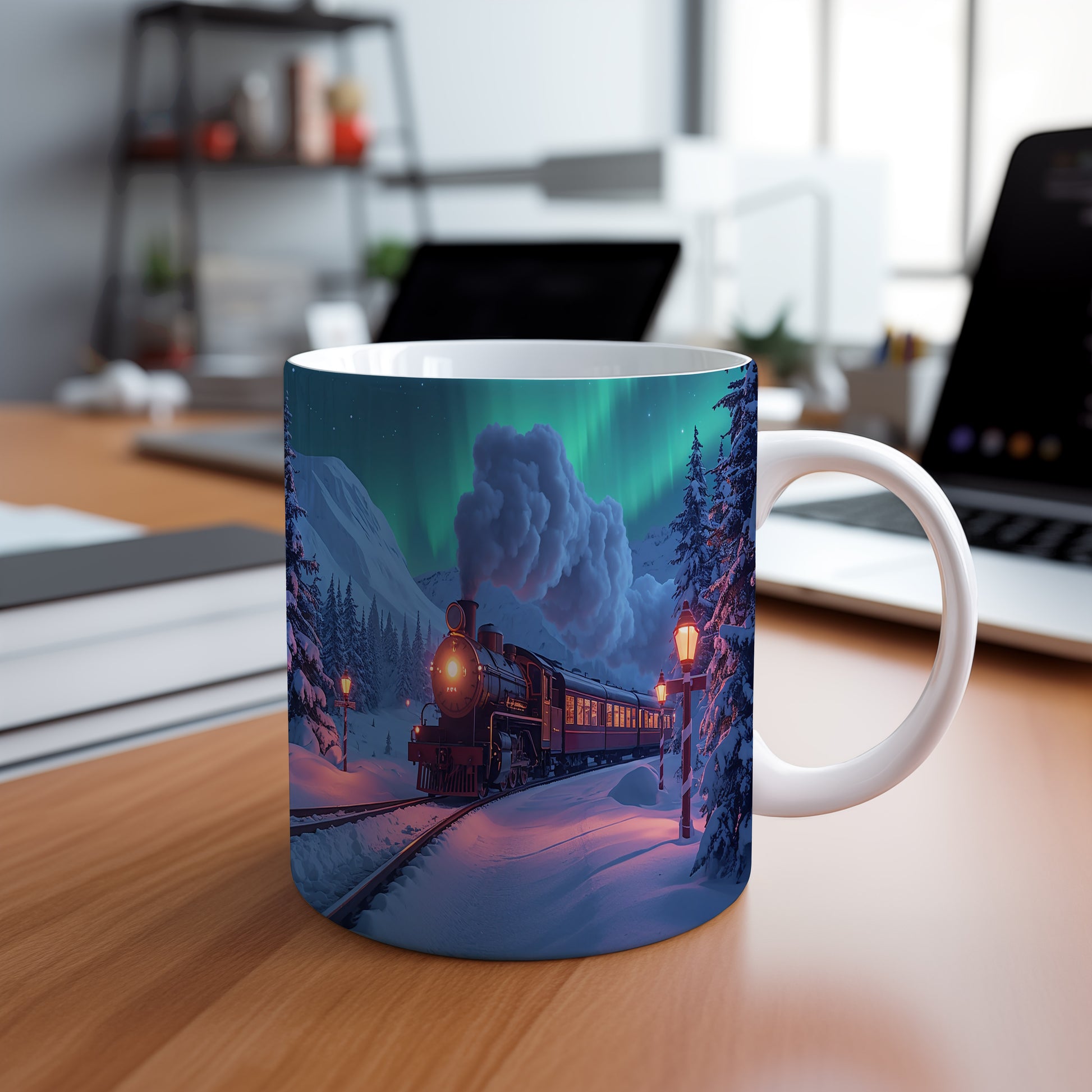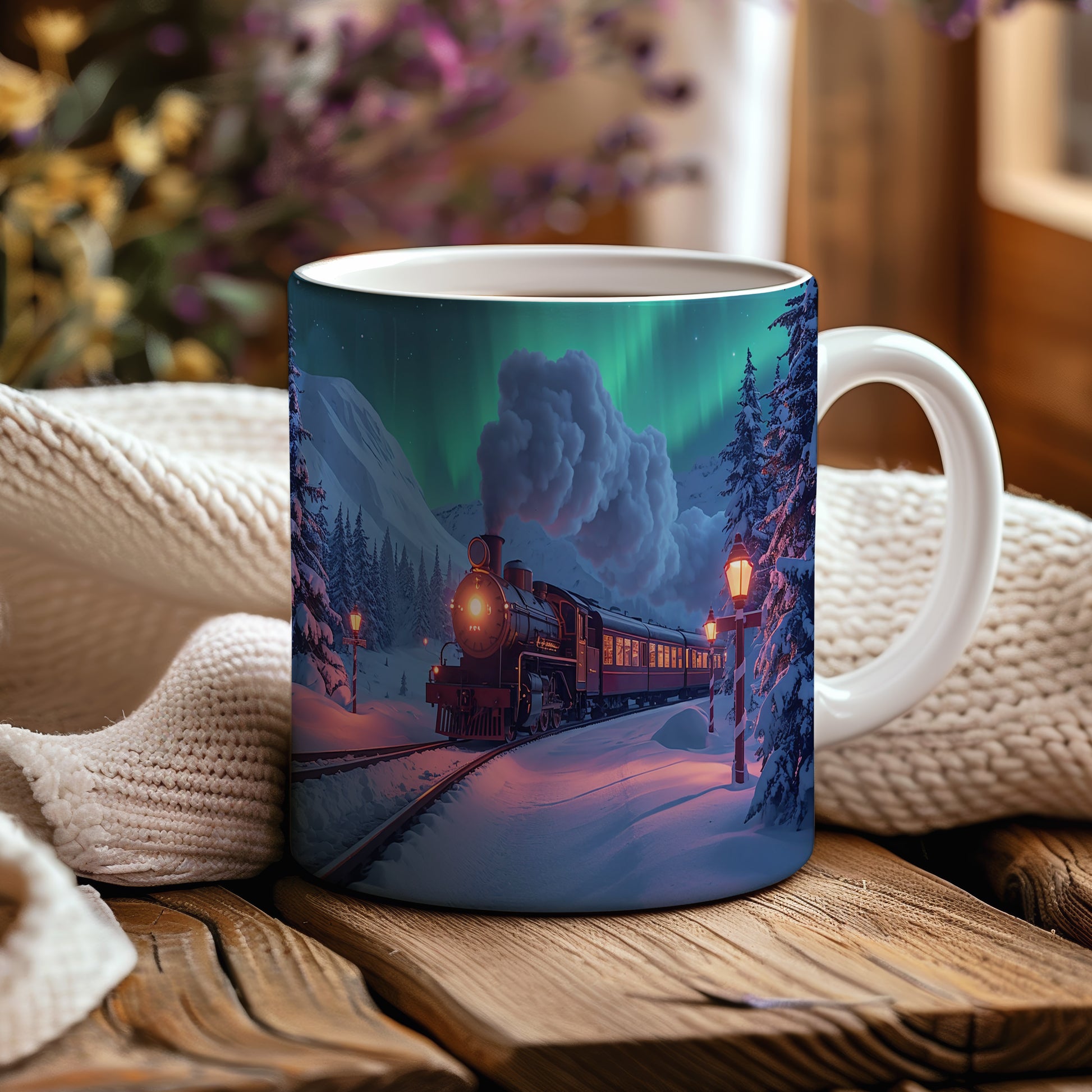 Hrnek s vánočním motivem – noční vlak v horách – sníh, vlak, polární záře