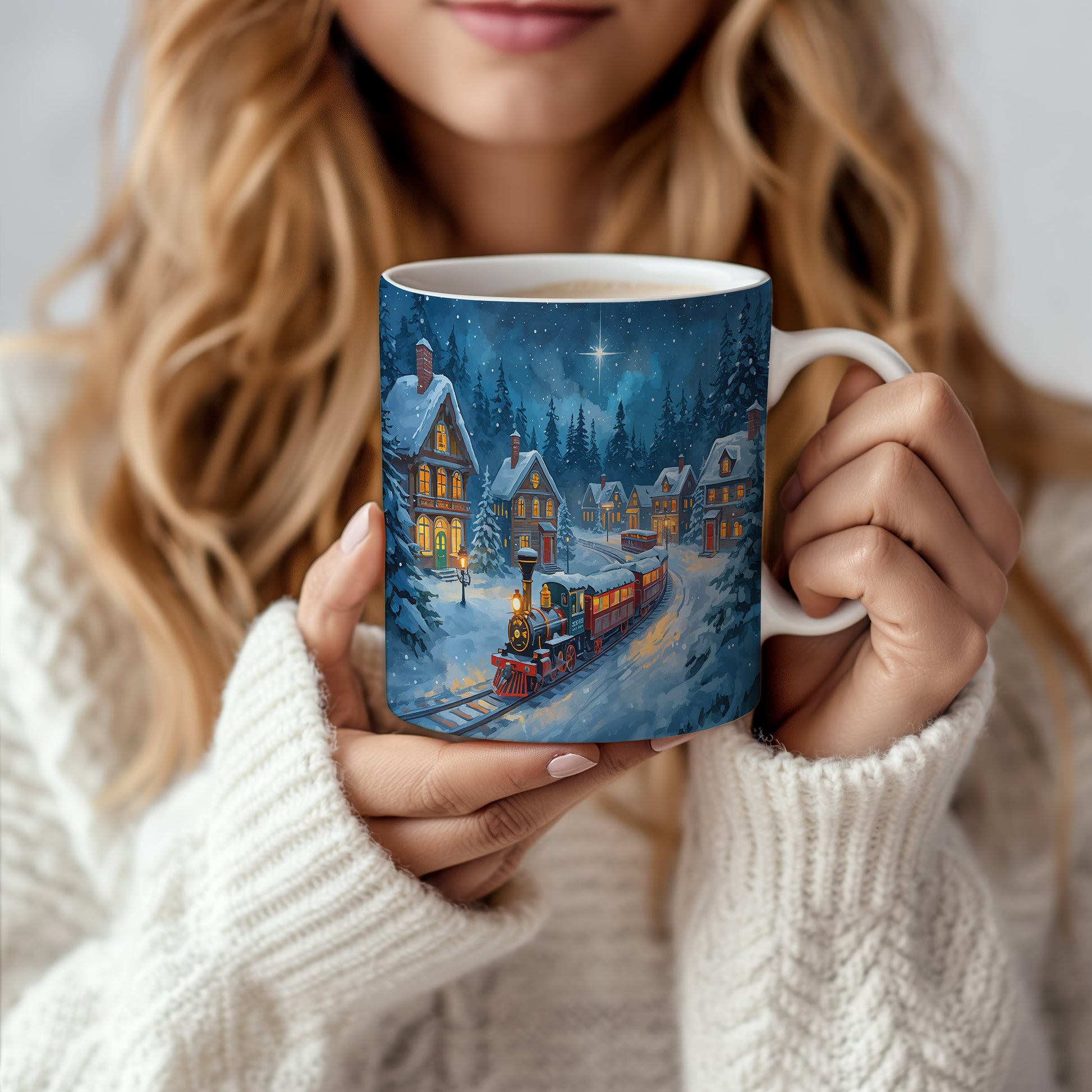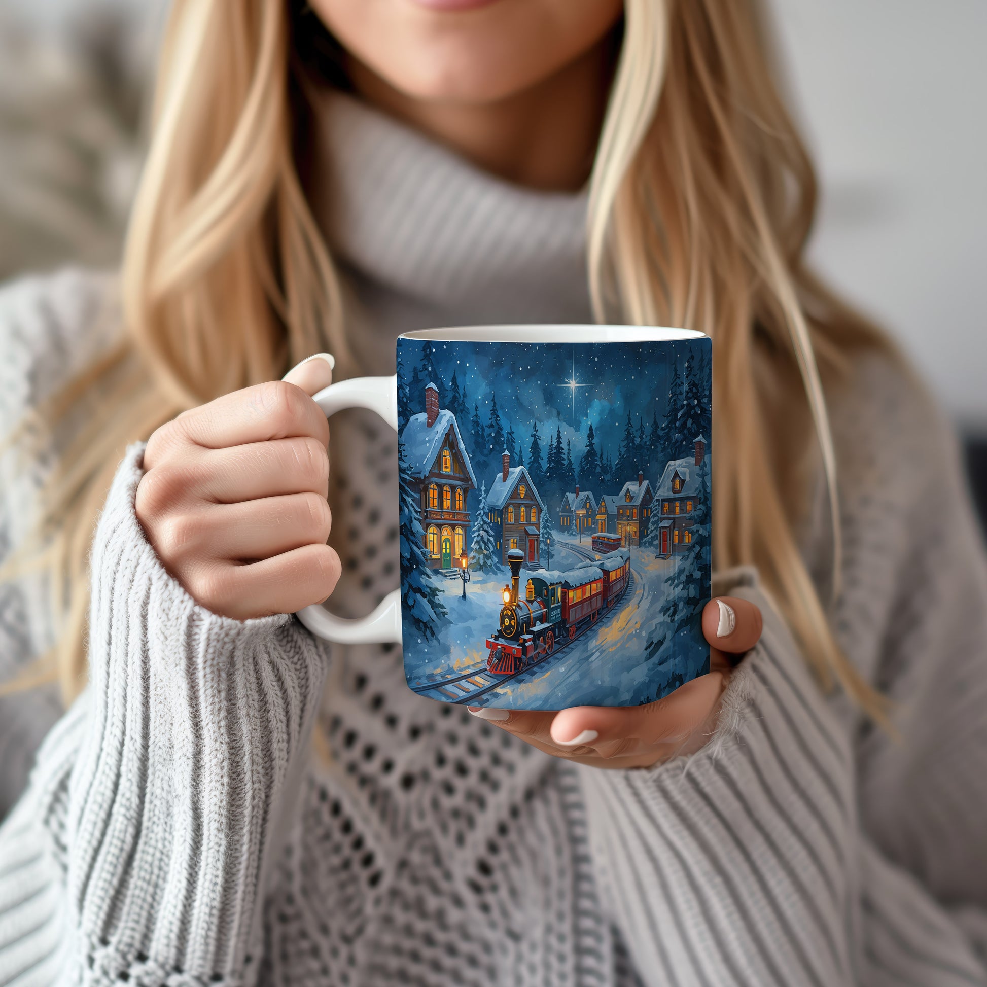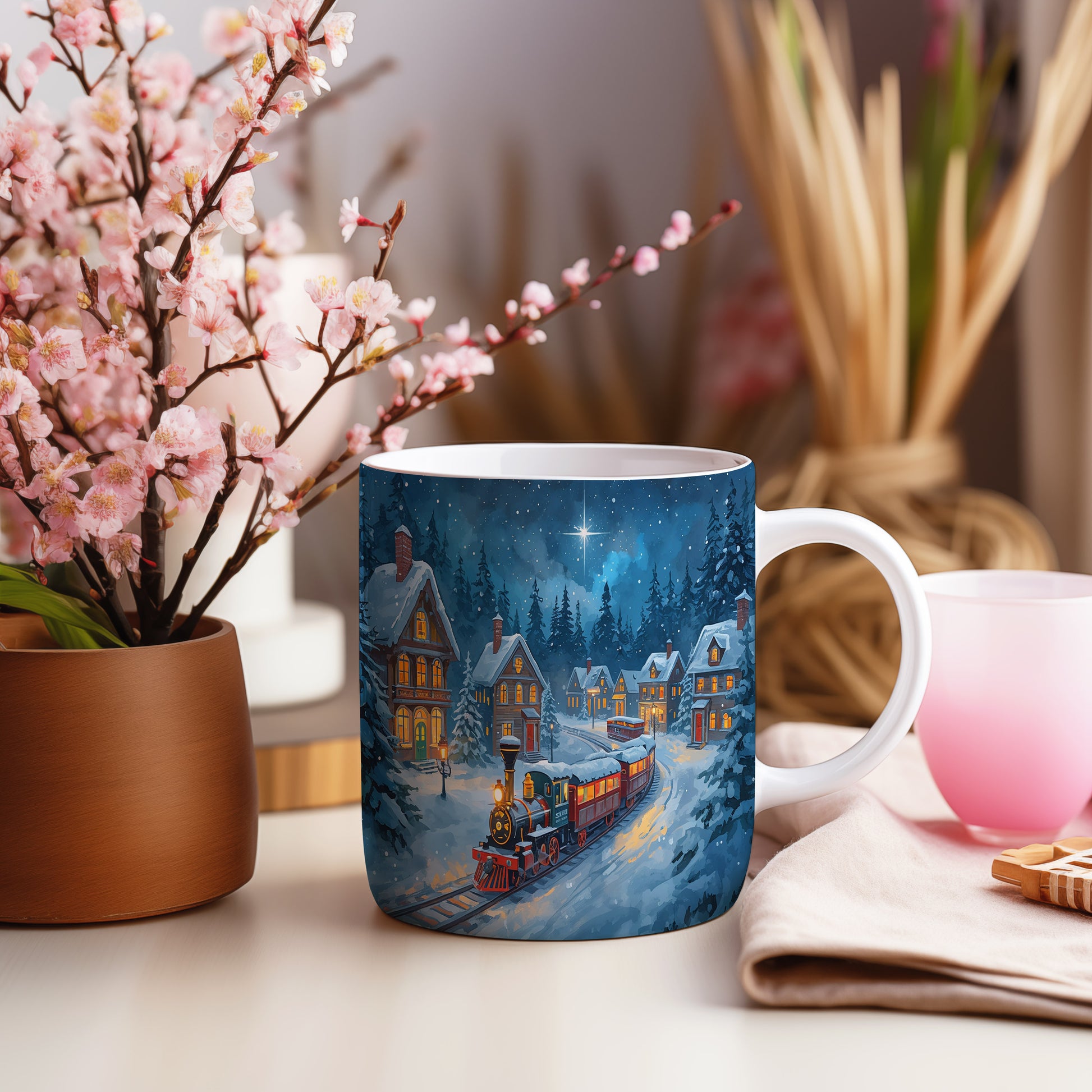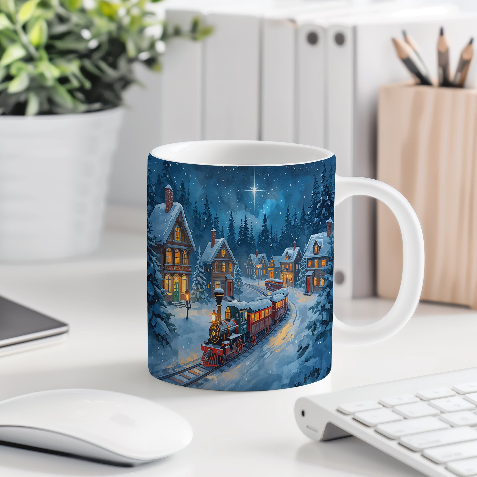 Hrnek s vánočním motivem – noční vlaková scéna – sníh, vlak, domy