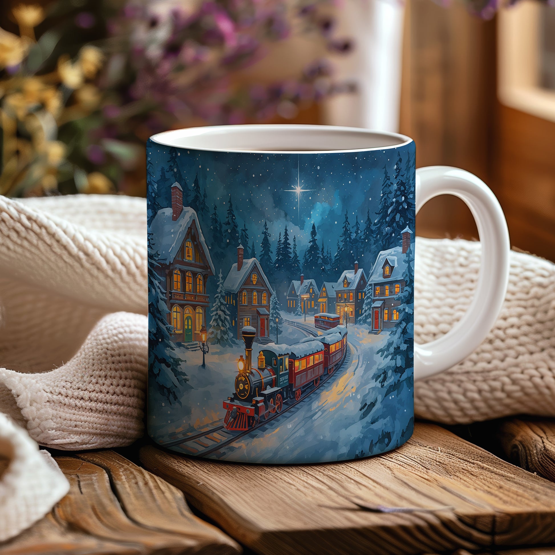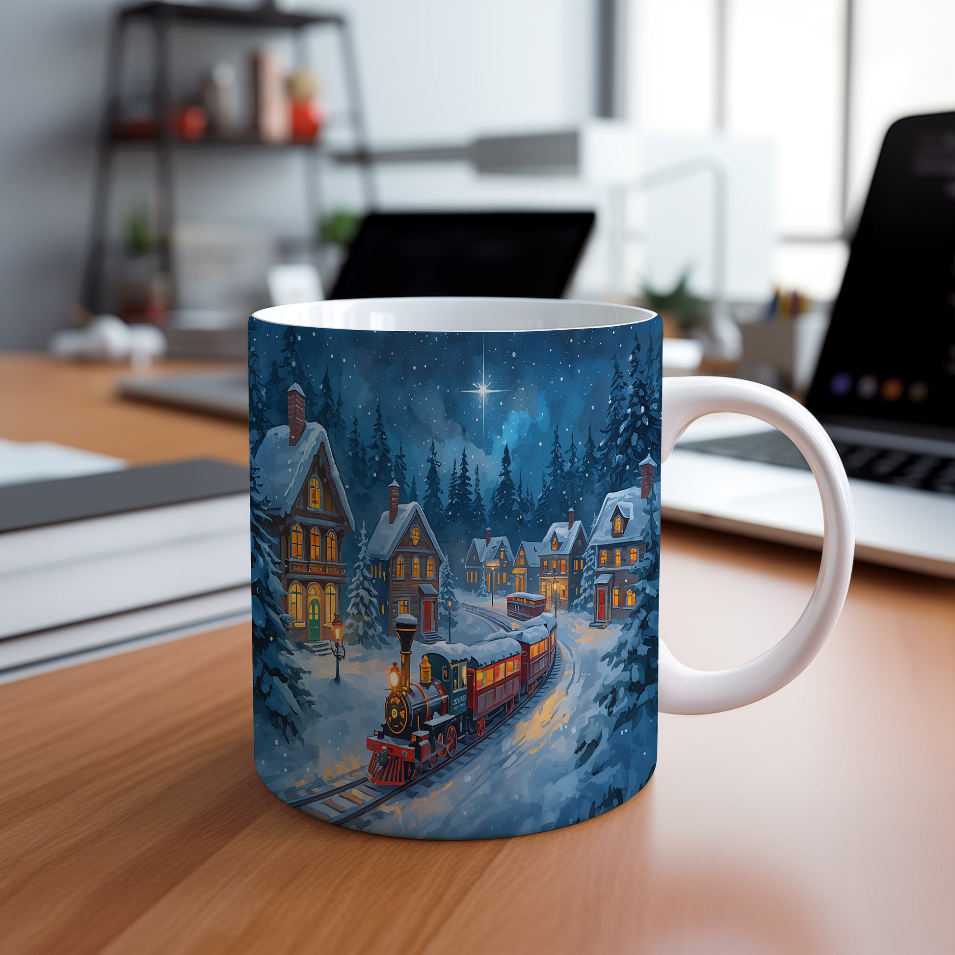 Tmavě modrá zimní krajina s parním vlakem projíždějícím mezi zasněženými domy vytváří klidnou atmosféru. Hrnek 330ml – vhodný do myčky i mikrovlnky.