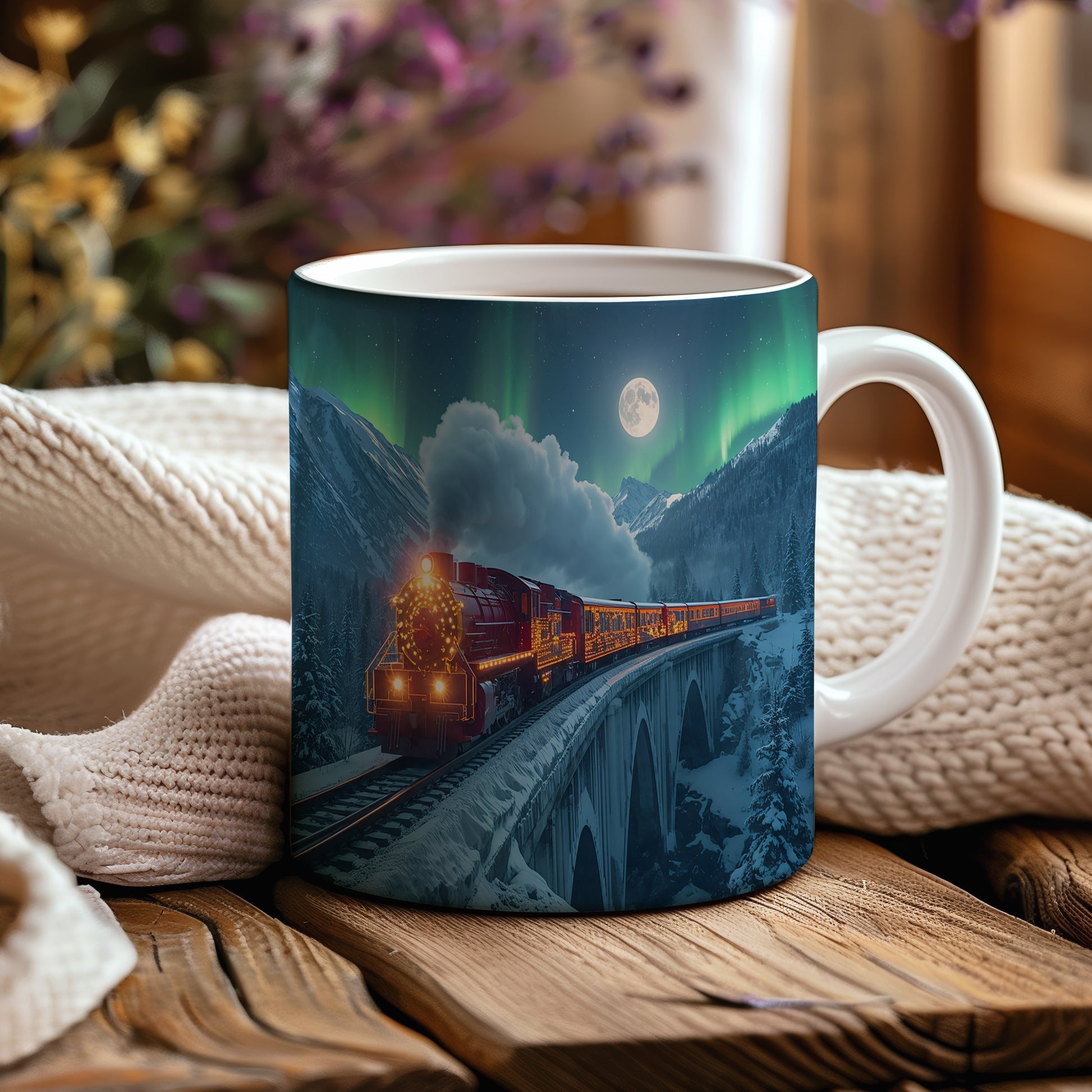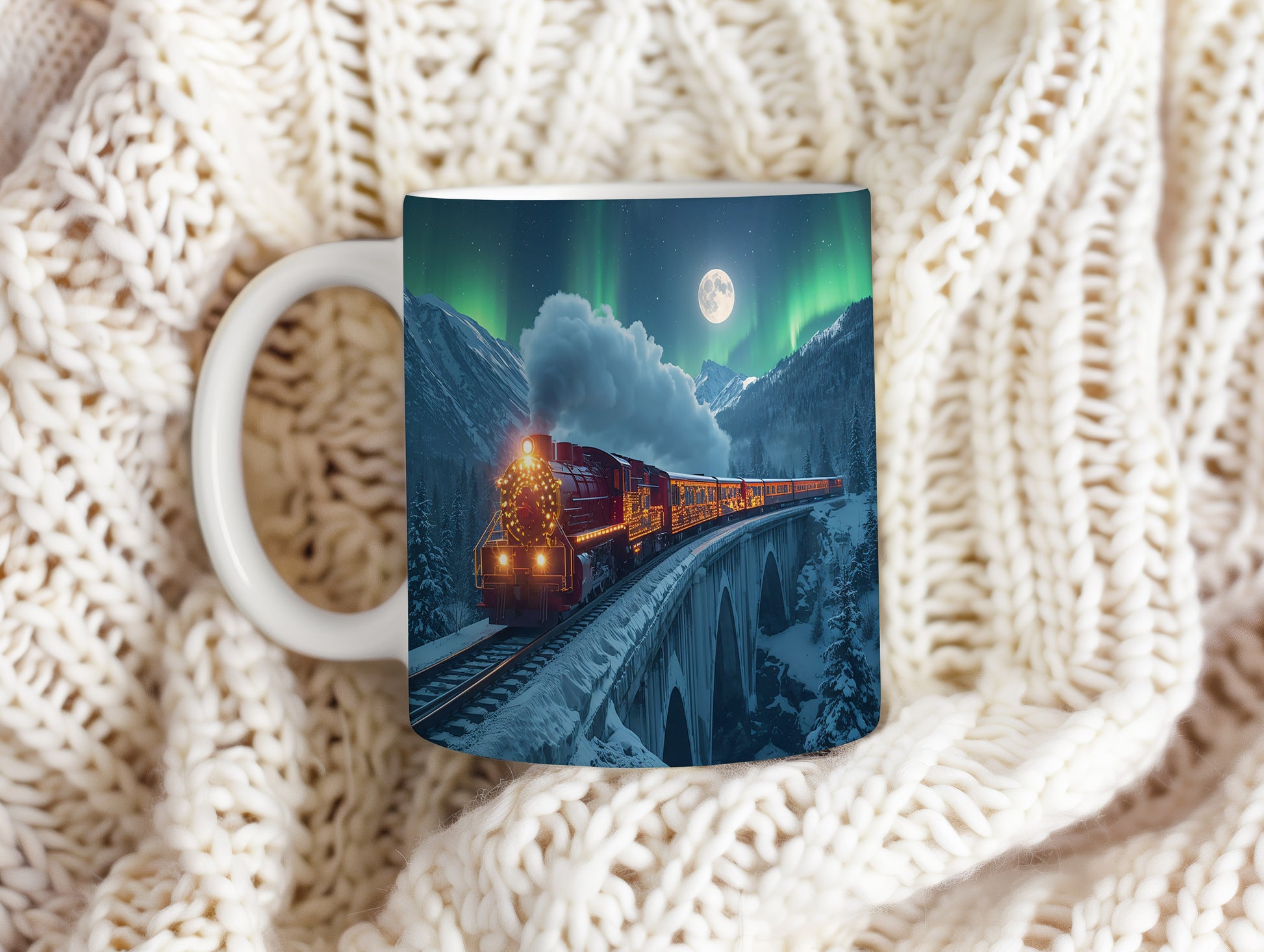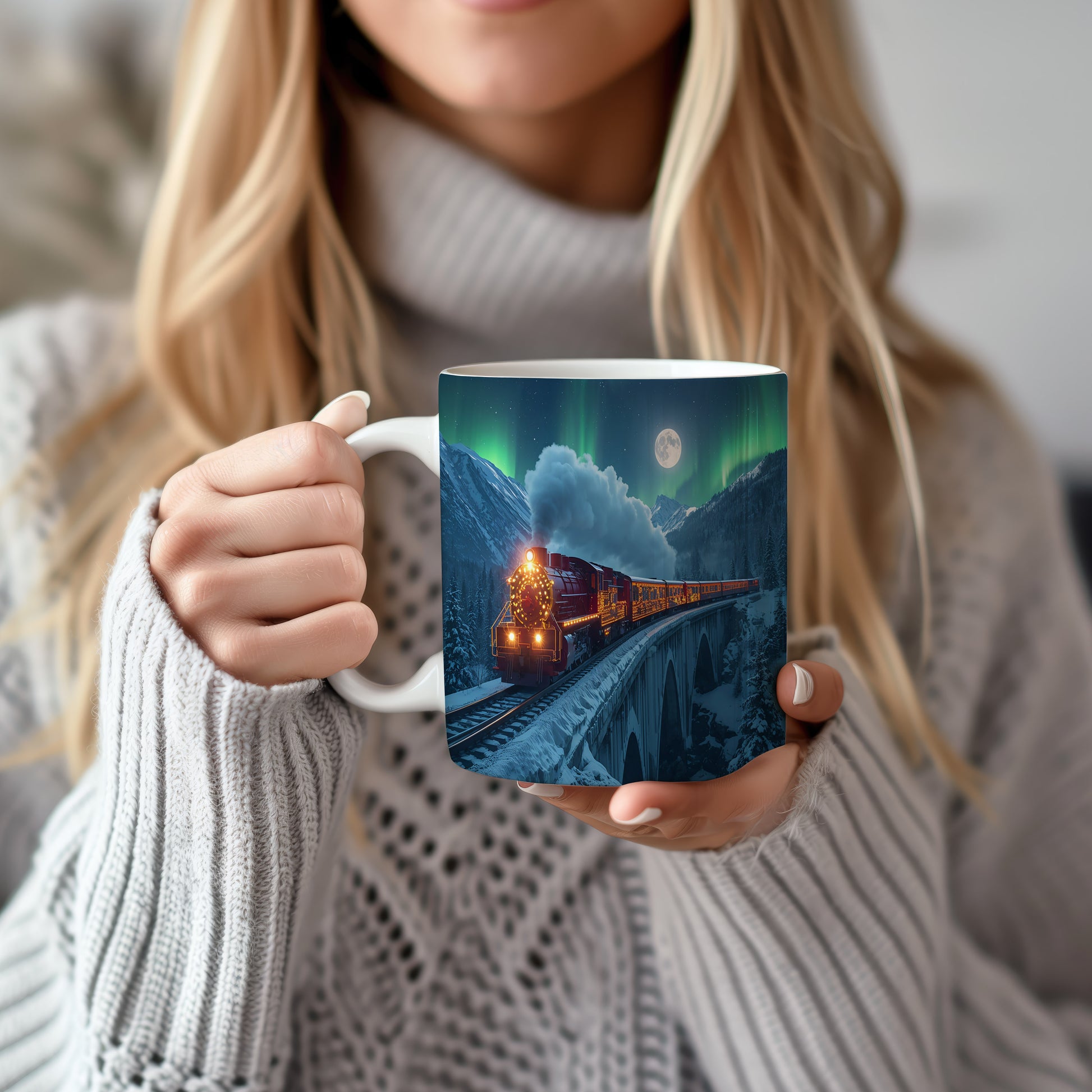 Hrnek s vánočním motivem – parní lokomotiva pod polární září
