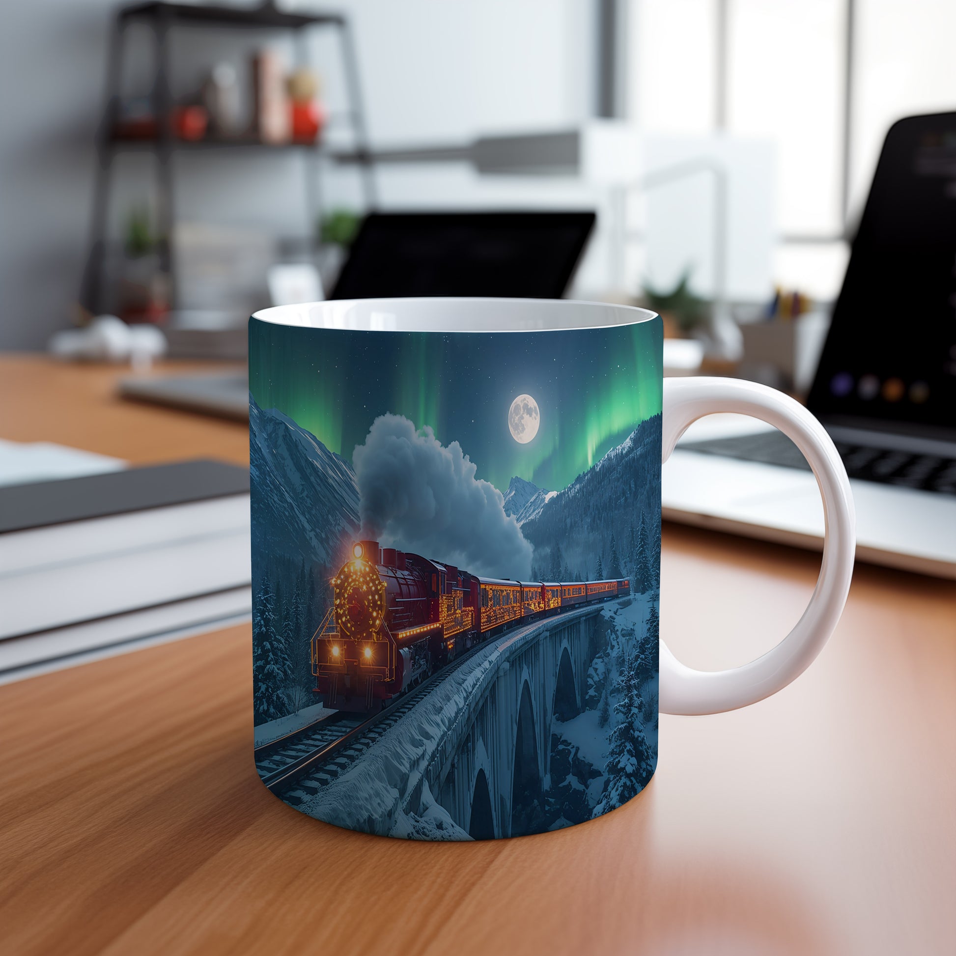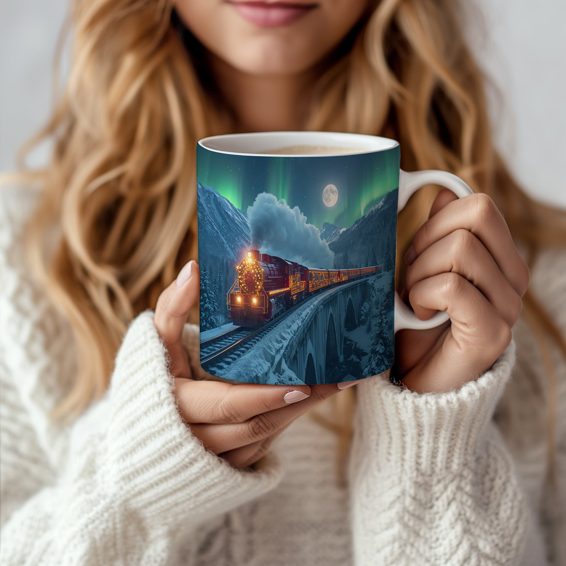 Tmavě modrá noc s polární září a měsícem vytváří kouzelnou atmosféru. Parní lokomotiva osvětlená světýlky projíždí zasněženou krajinou. Hrnek 330ml – vhodný do myčky i mikrovlnky.