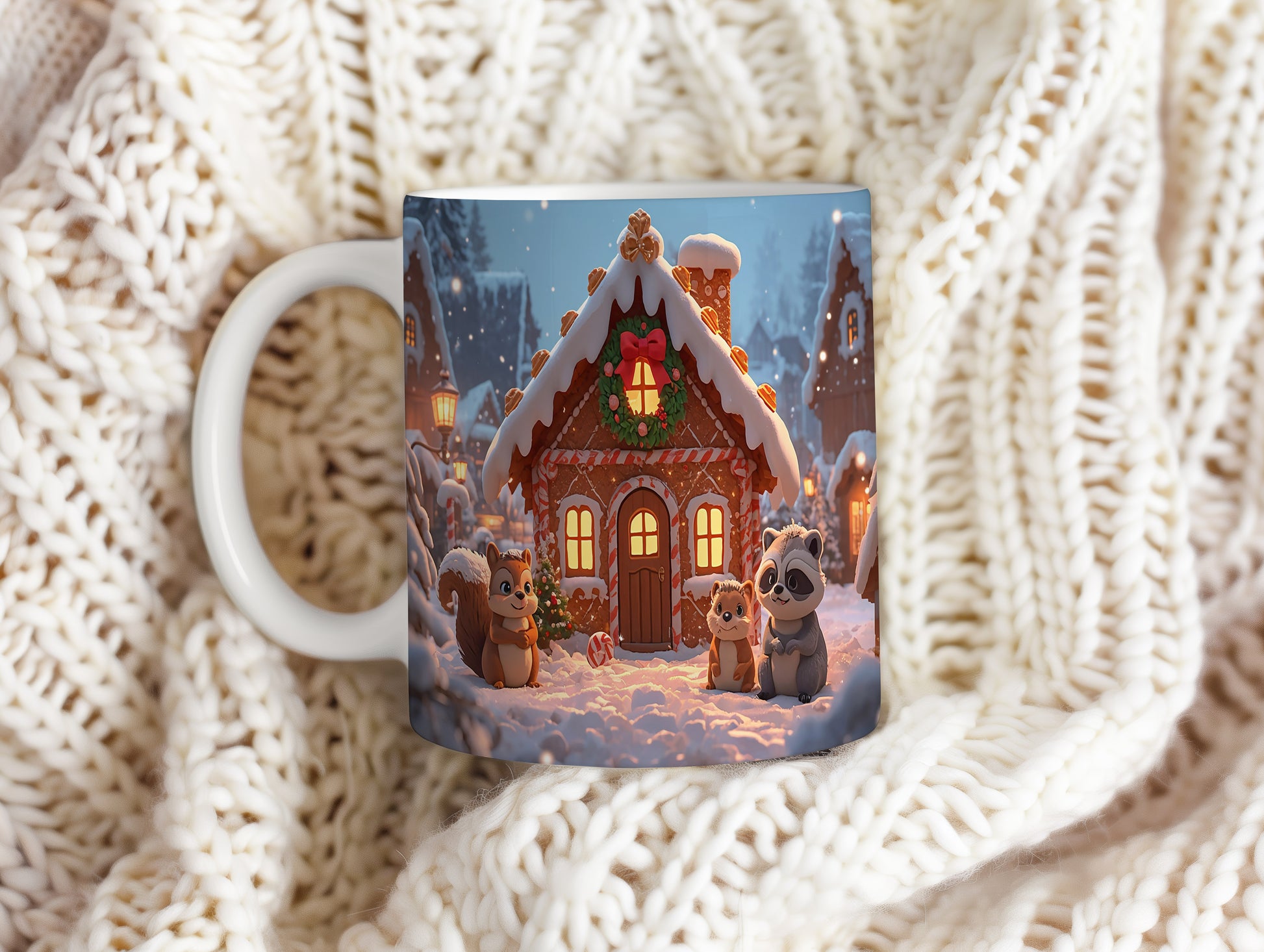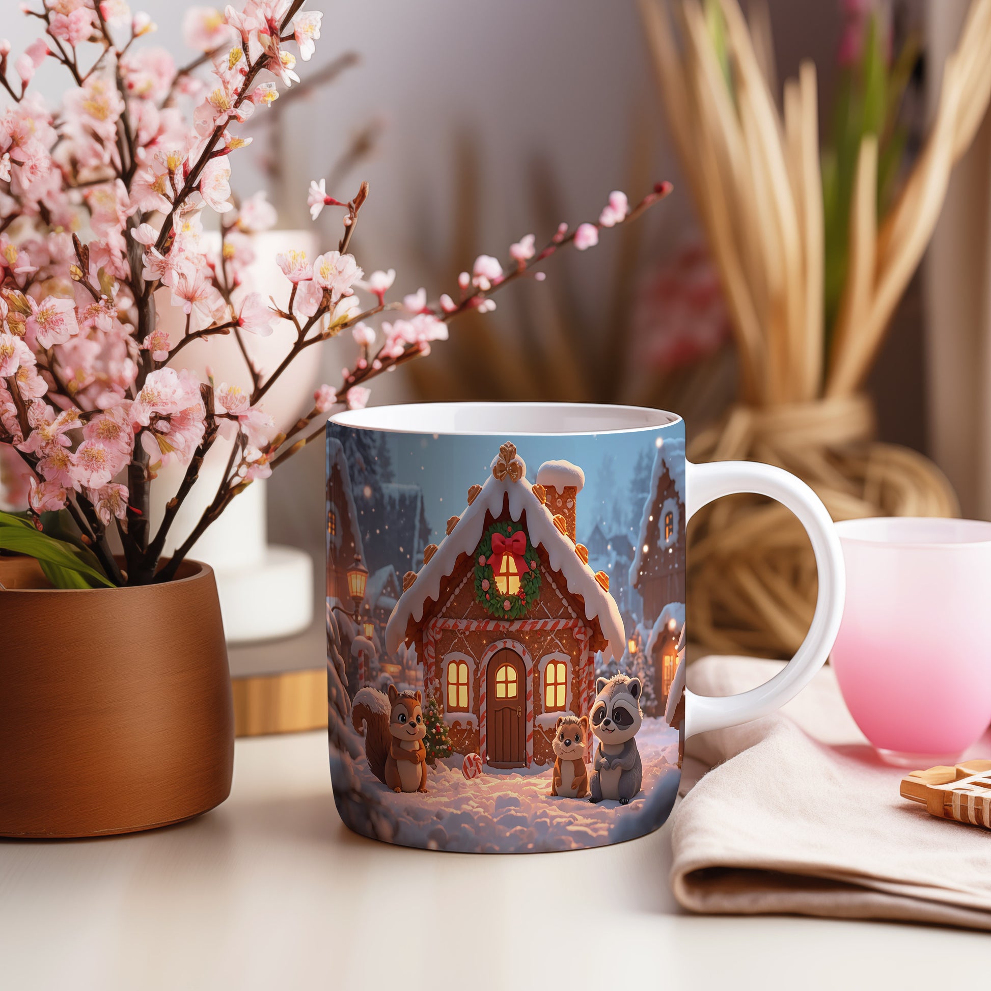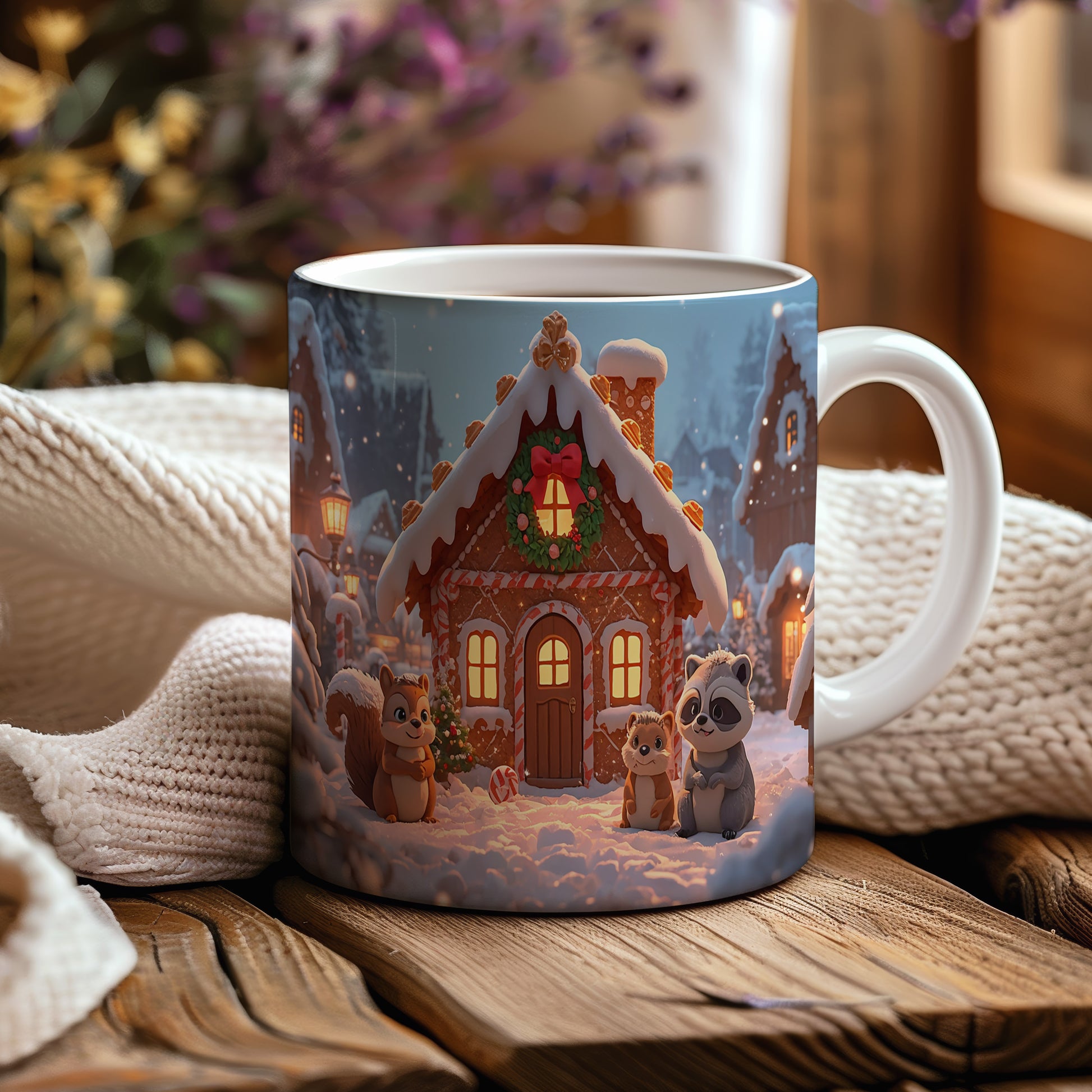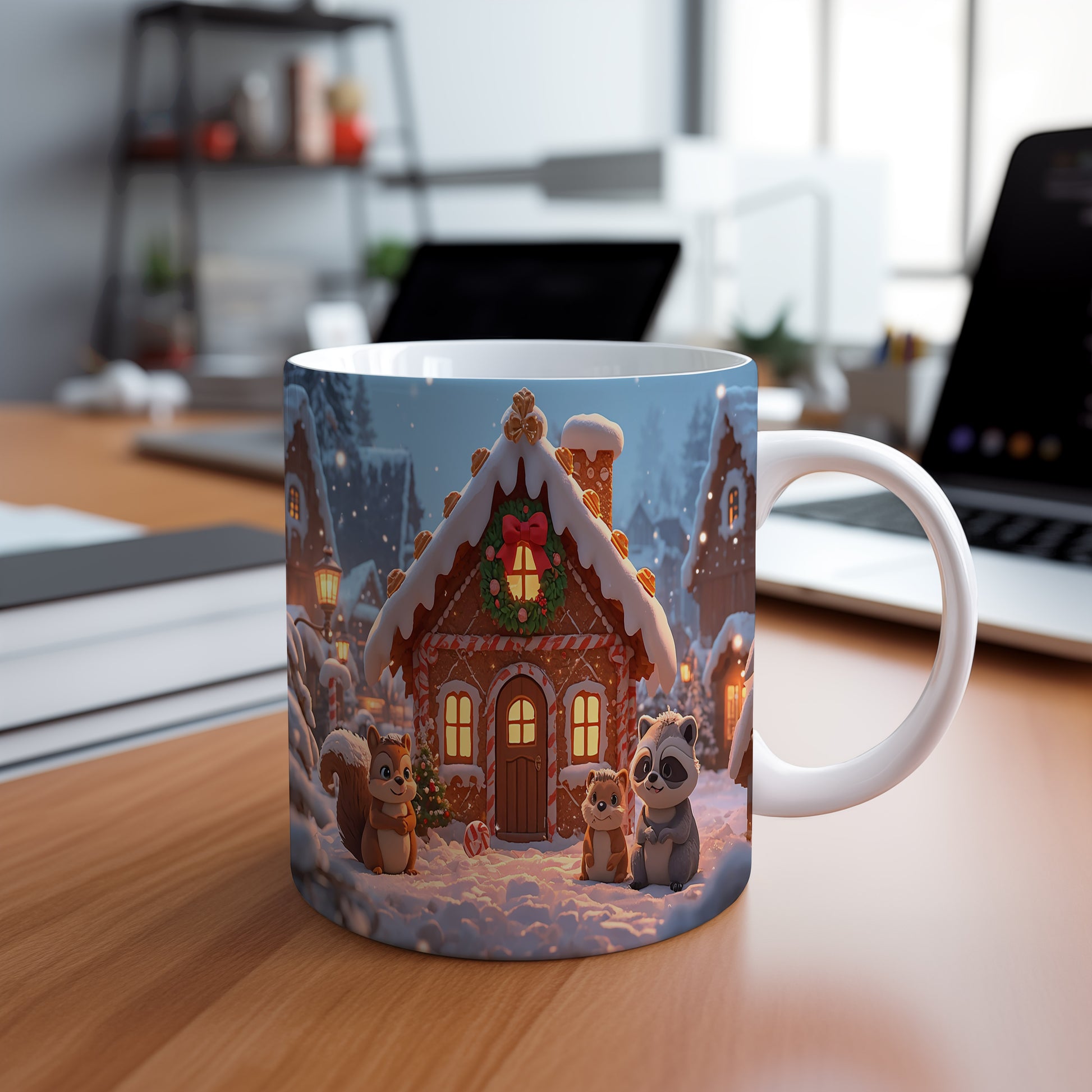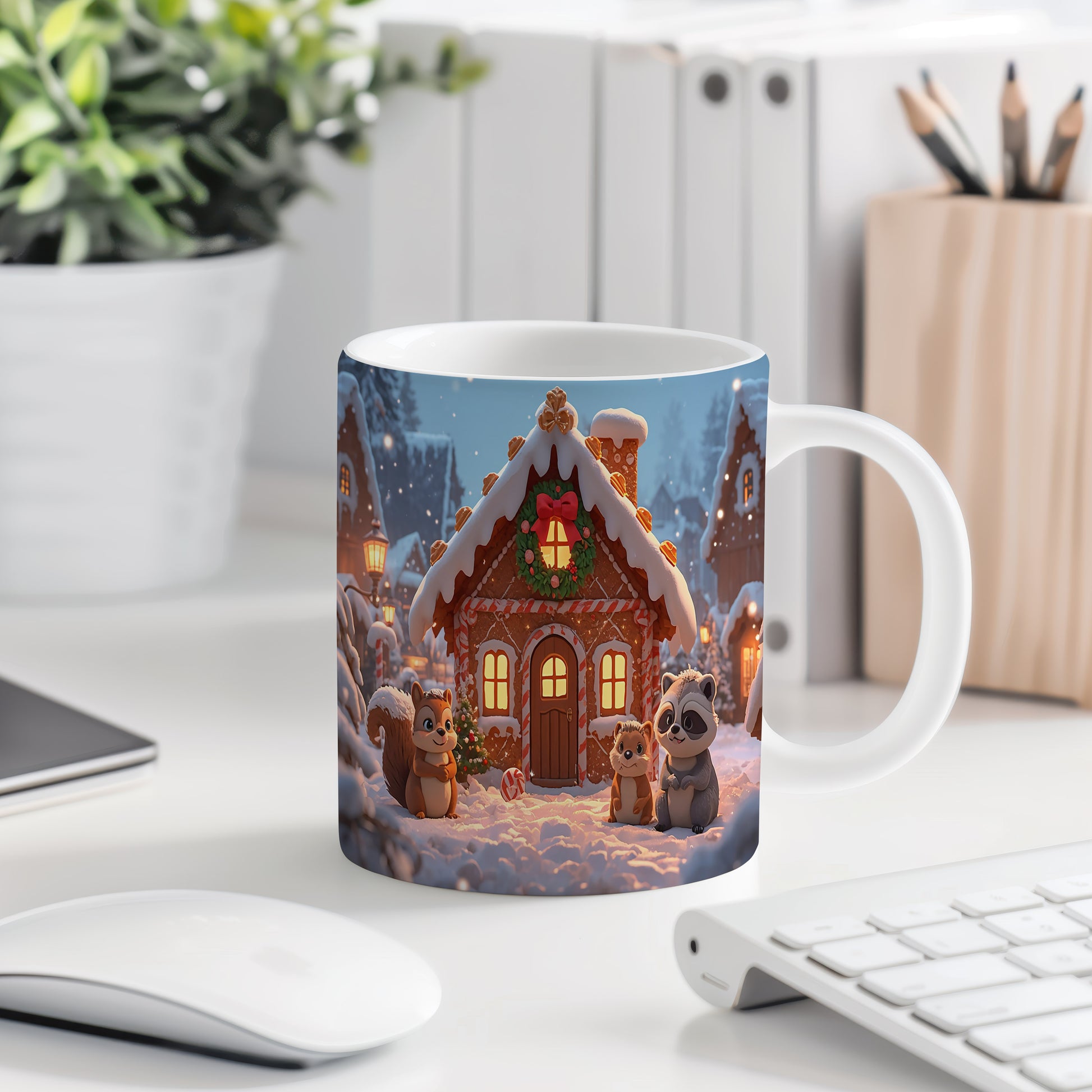Hrnek s vánočním motivem – perníková chaloupka se zvířátky