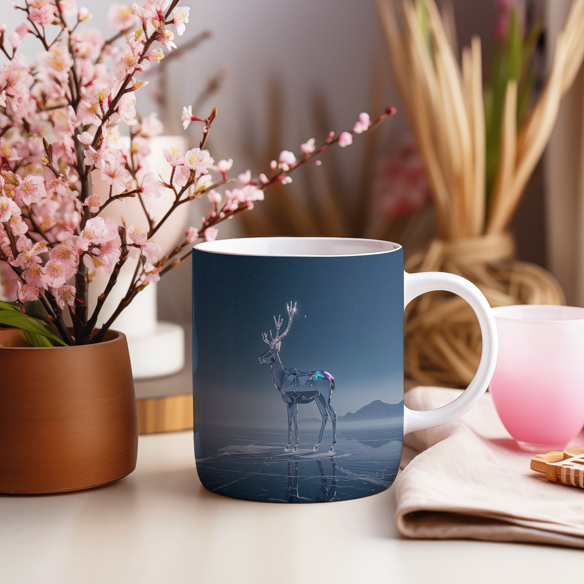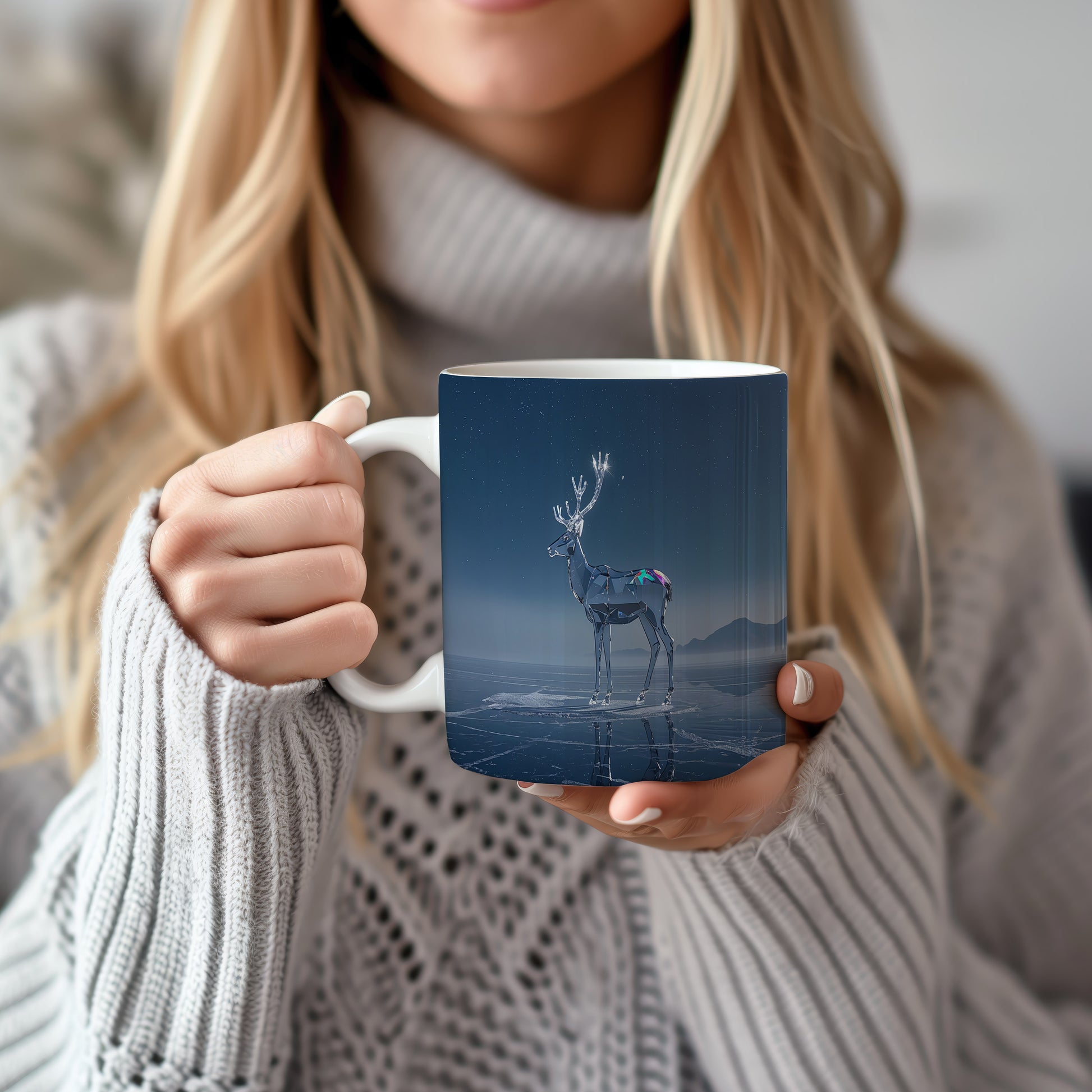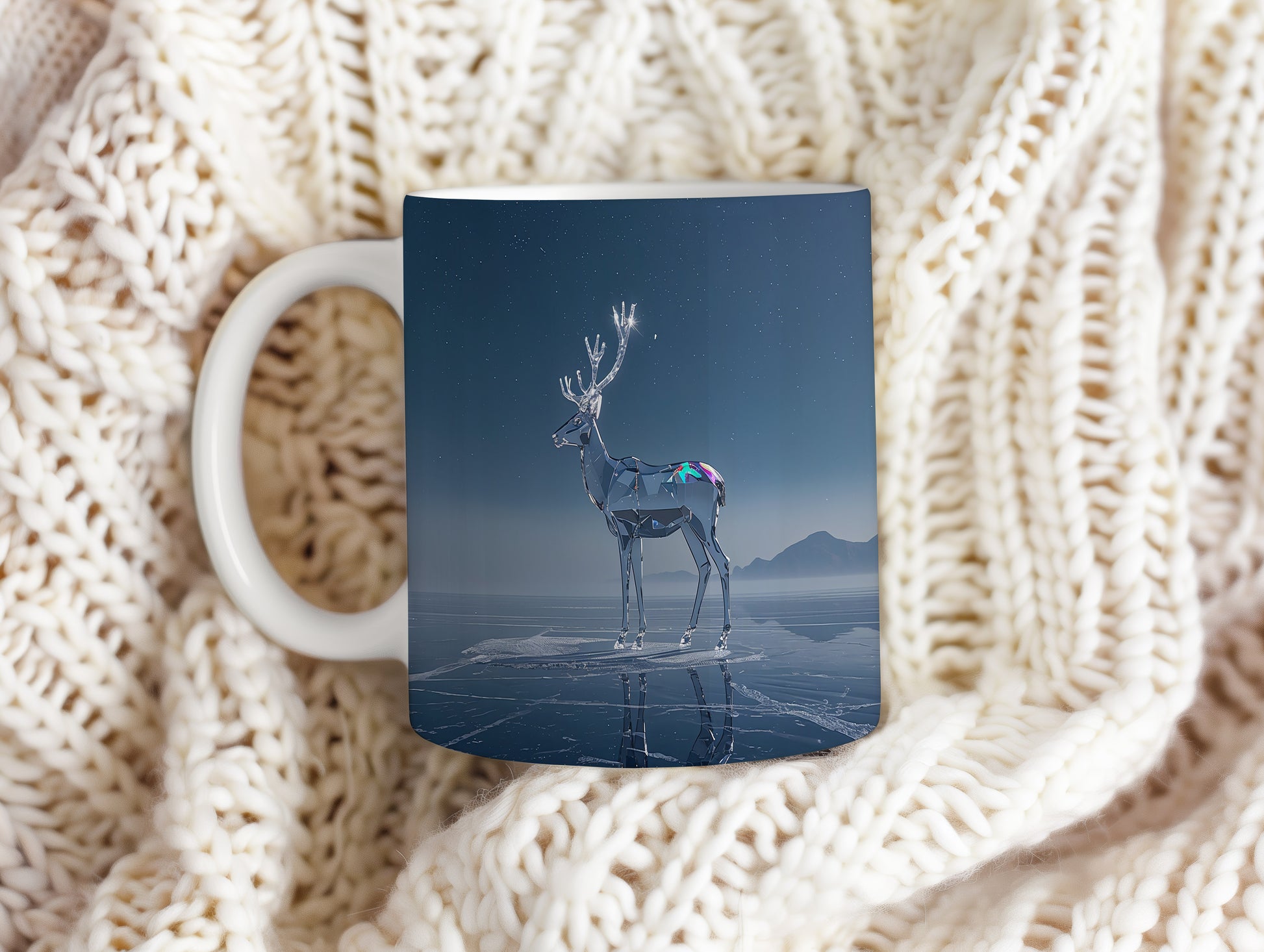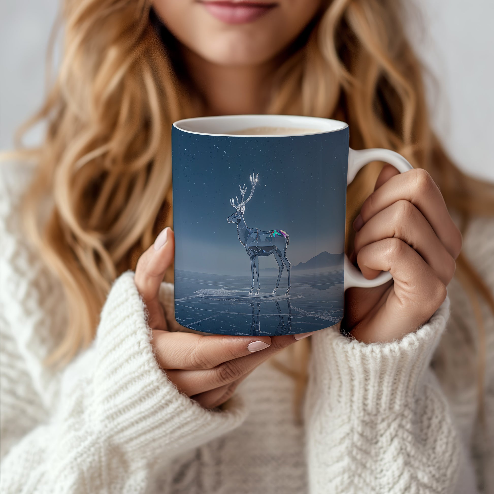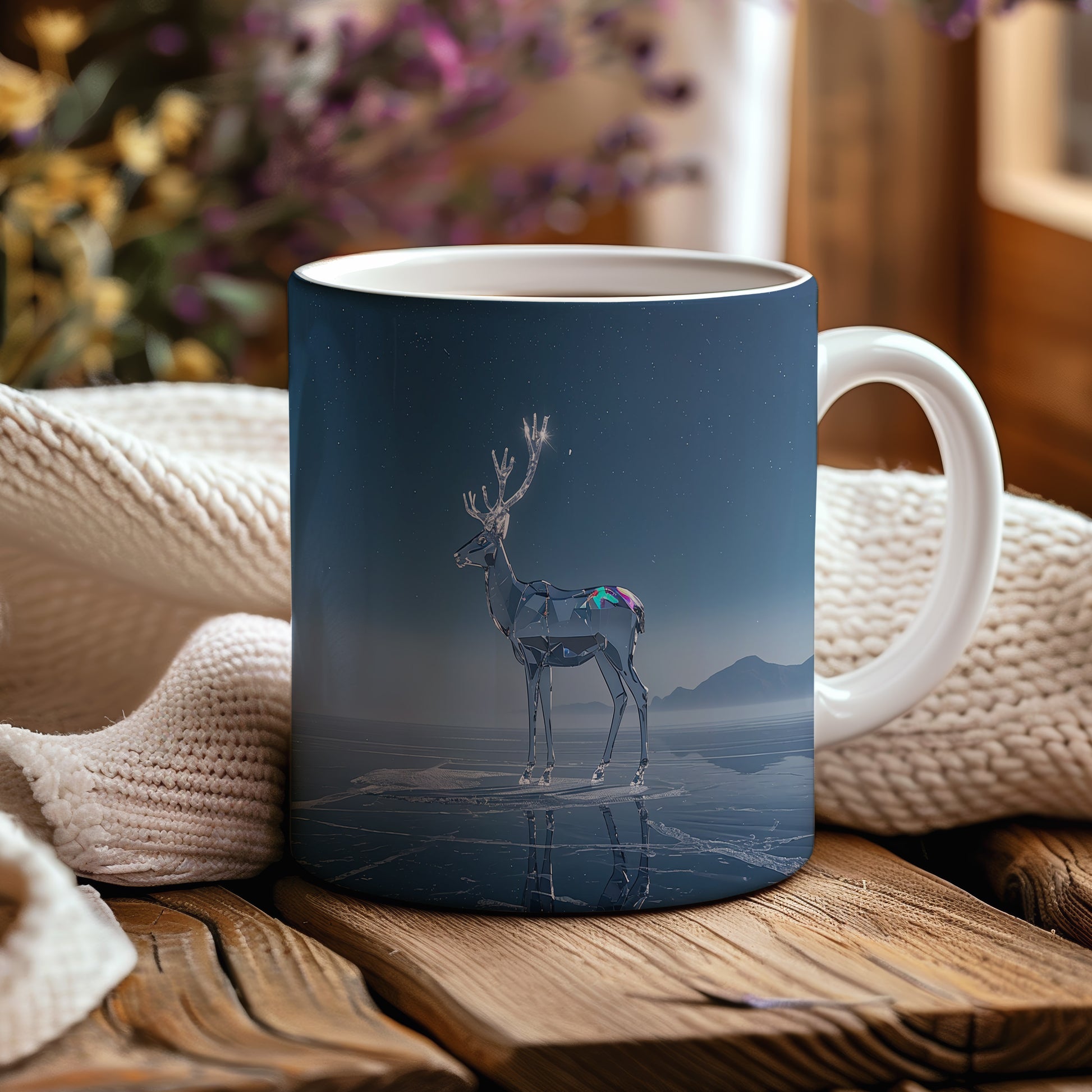 Tmavě modrá obloha s hvězdami tvoří kouzelnou kulisu pro skleněného soba stojícího na ledě. Atmosféra klidu a zimní pohody. Hrnek 330ml – vhodný do myčky i mikrovlnky.