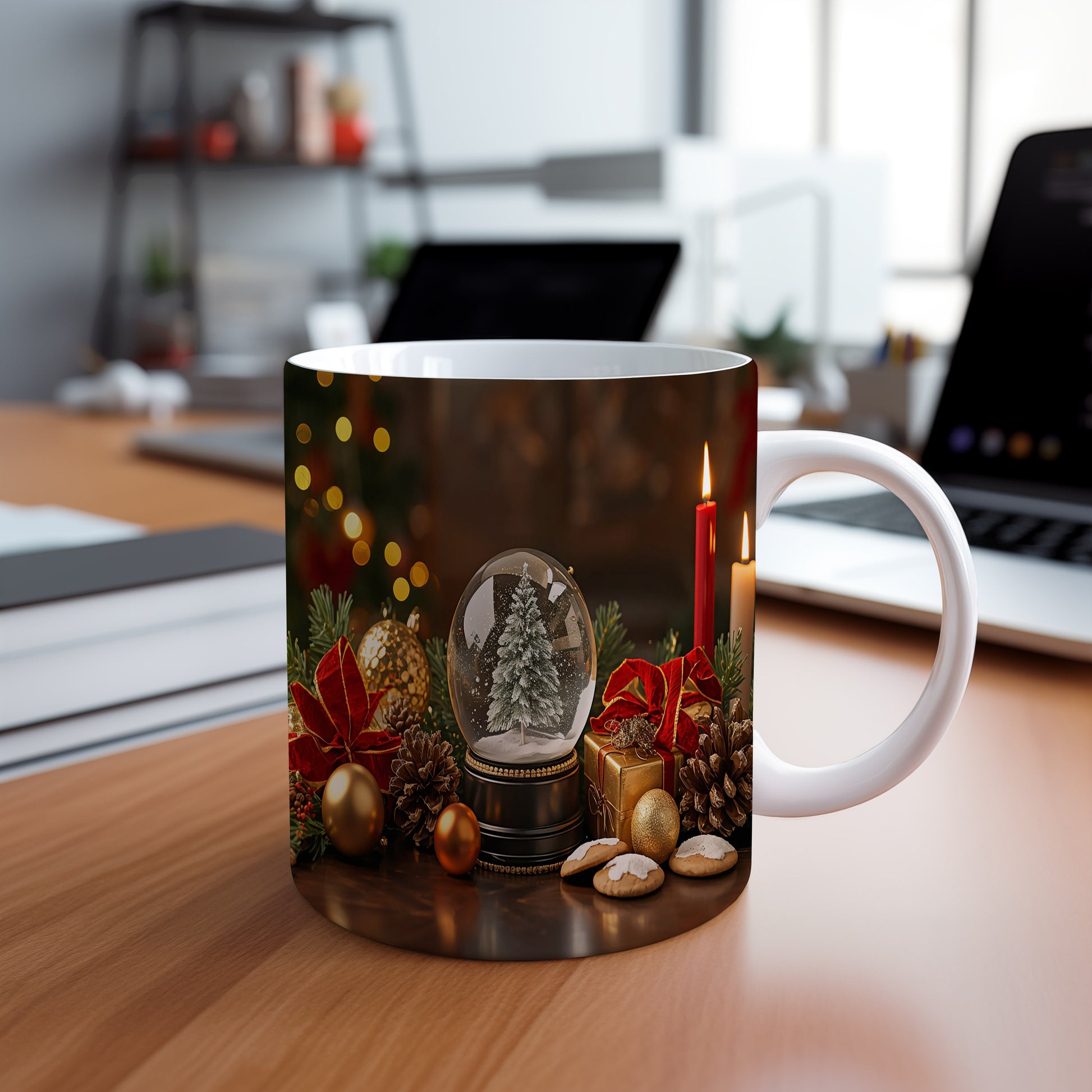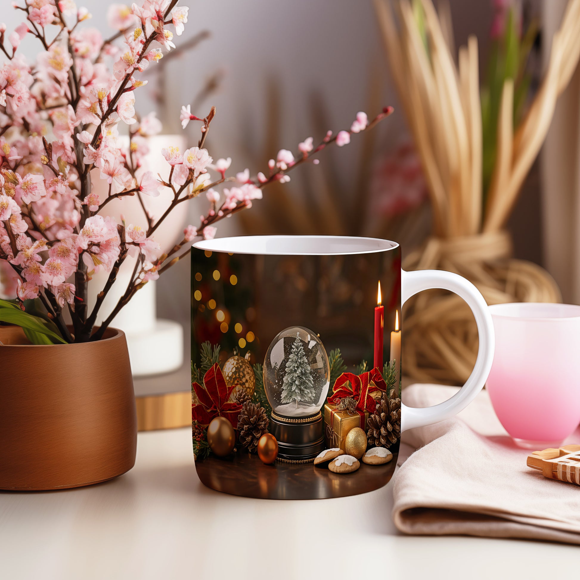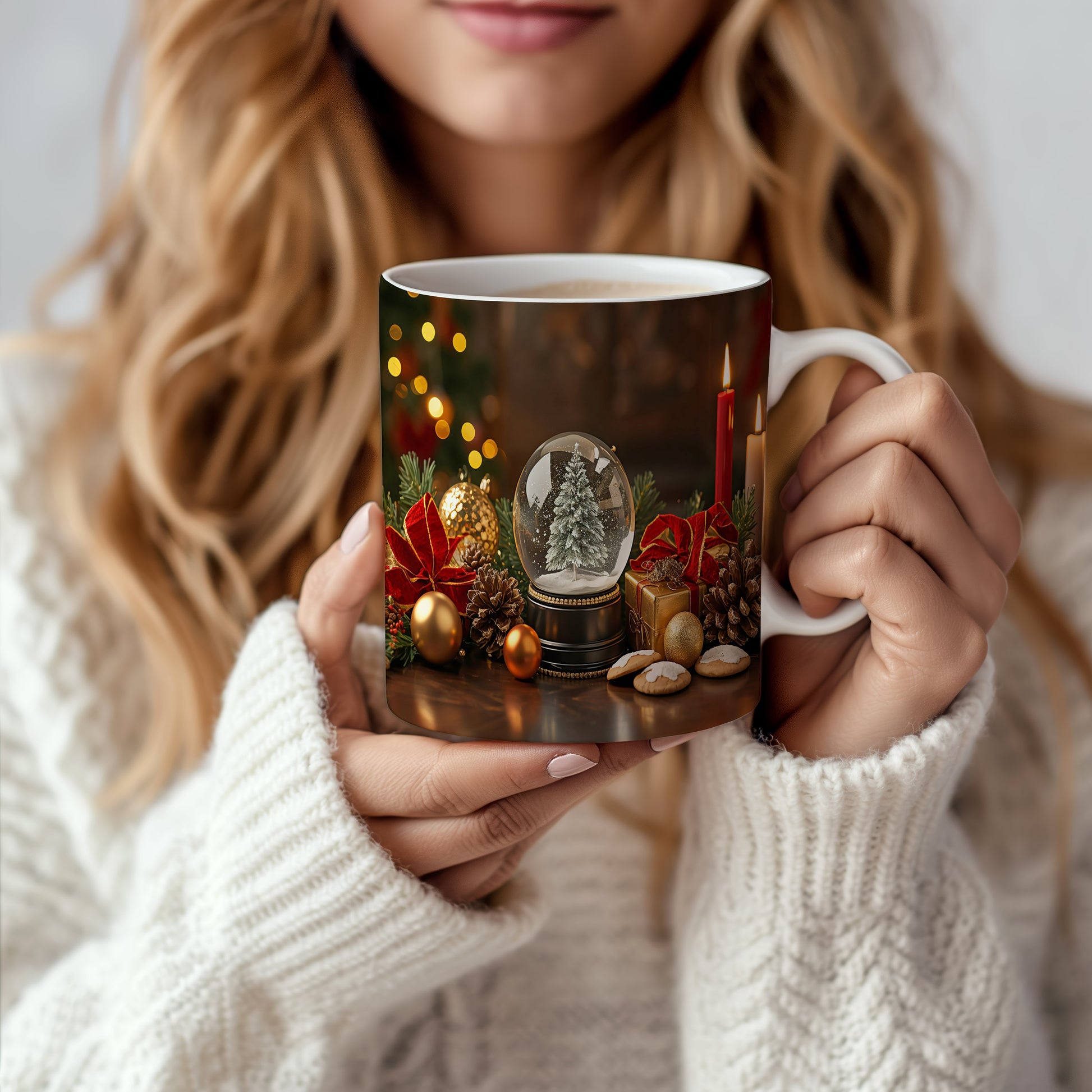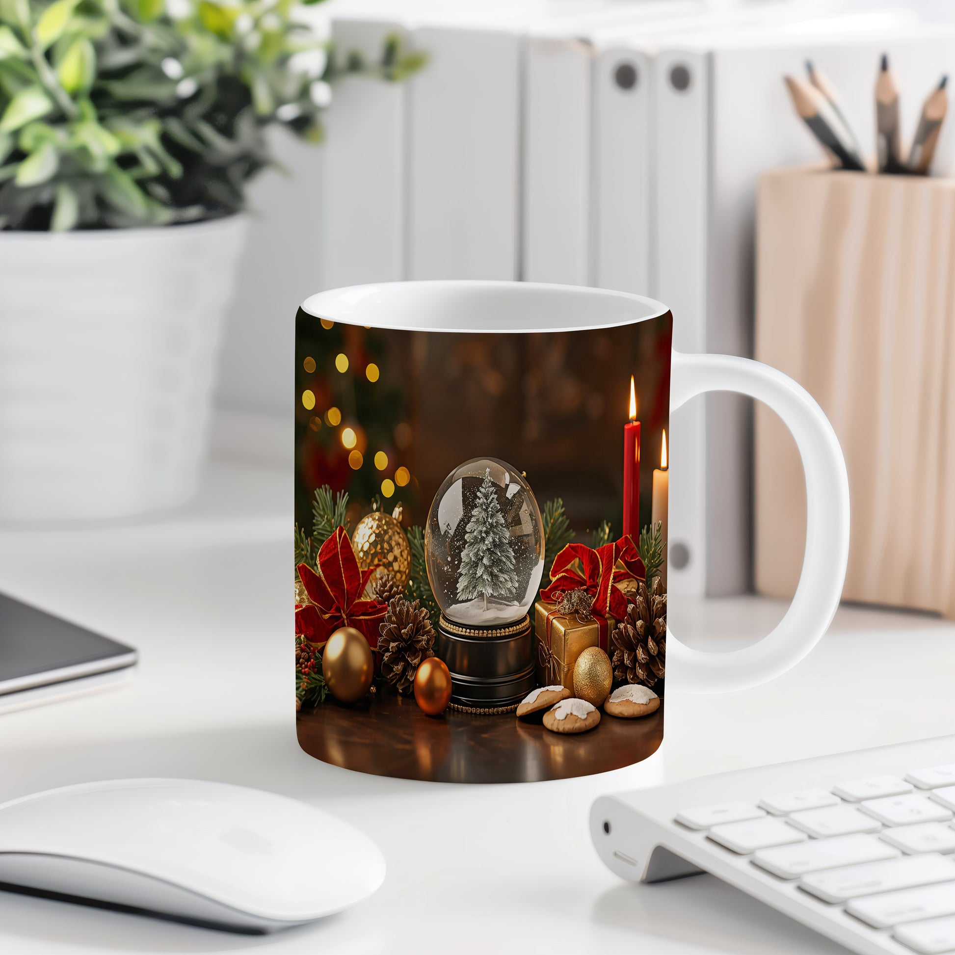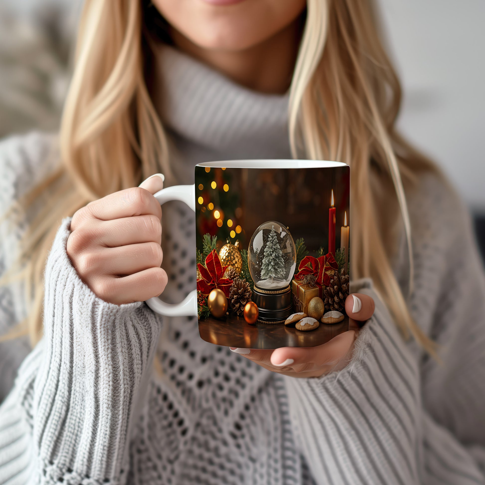 Tmavé pozadí zdůrazňuje sněhovou kouli s jedličkou, obklopenou zlatými ozdobami a svíčkou. Hrnek 330ml – vhodný do myčky i mikrovlnky.