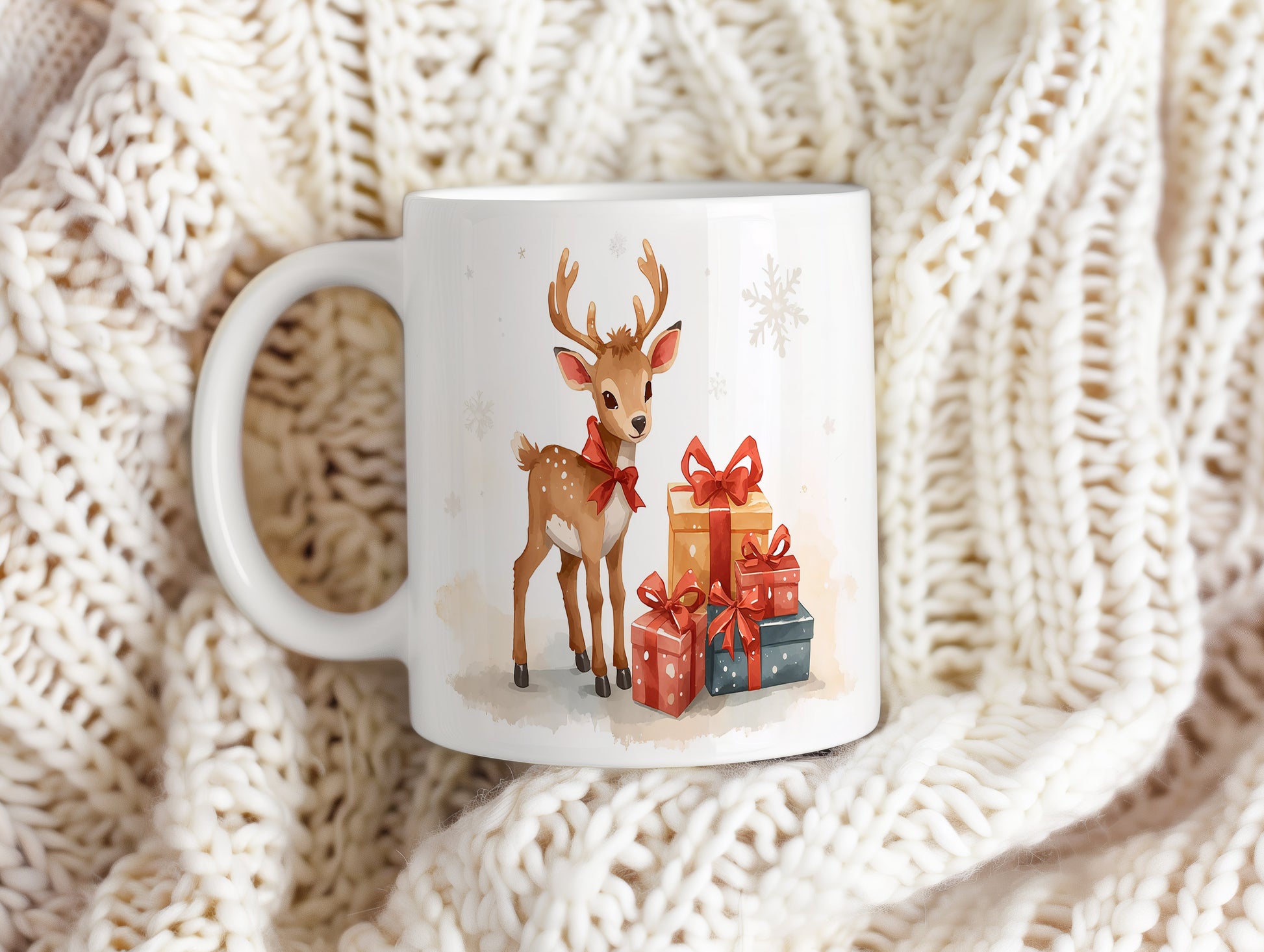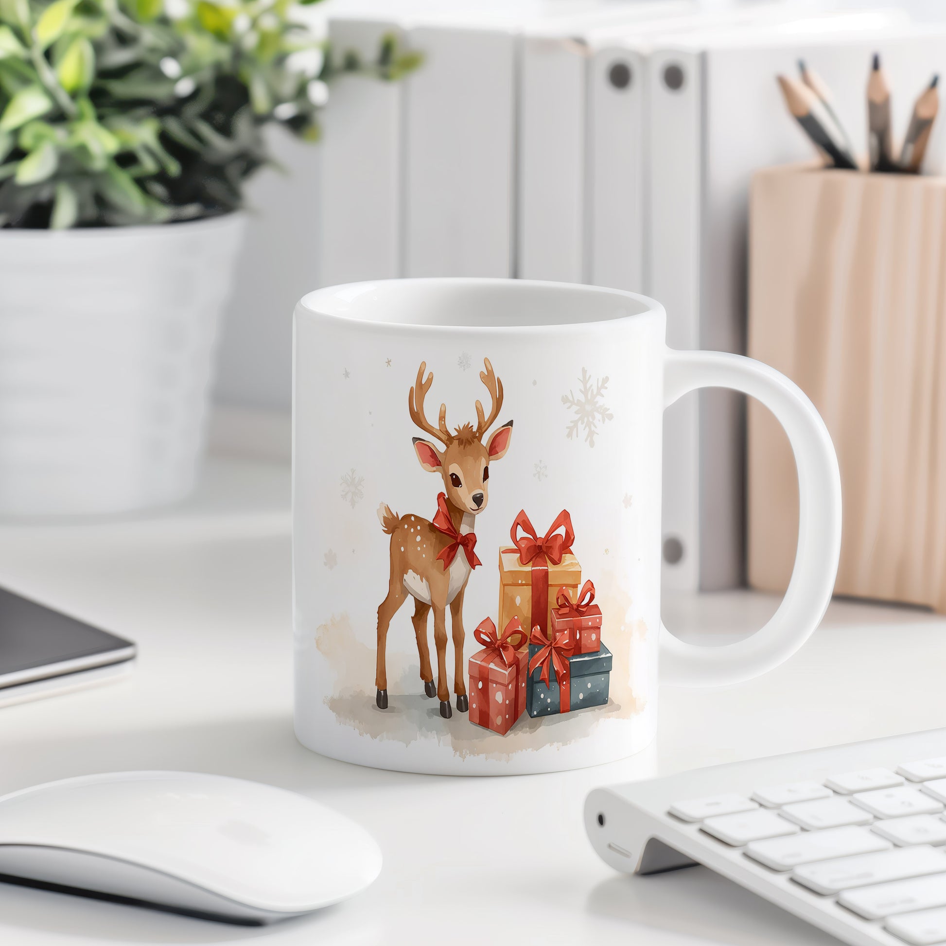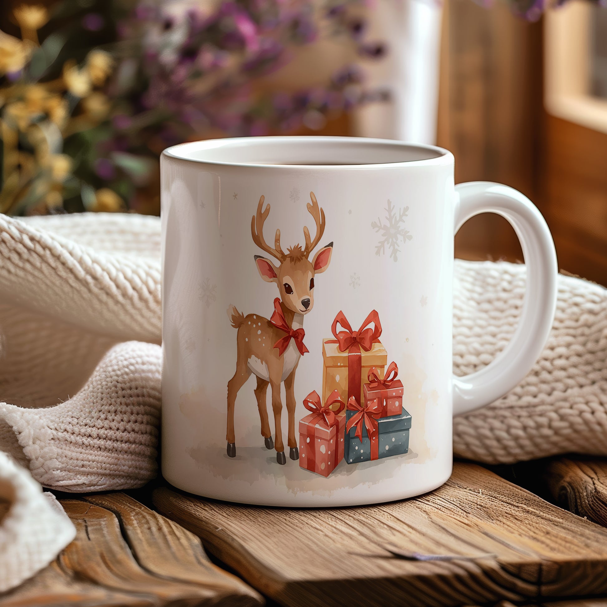 Na hrnku je roztomilý sob s červenou mašlí, obklopený vánočními dárky. V pozadí se jemně snáší sněhové vločky. Hrnek 330ml – vhodný do myčky i mikrovlnky.