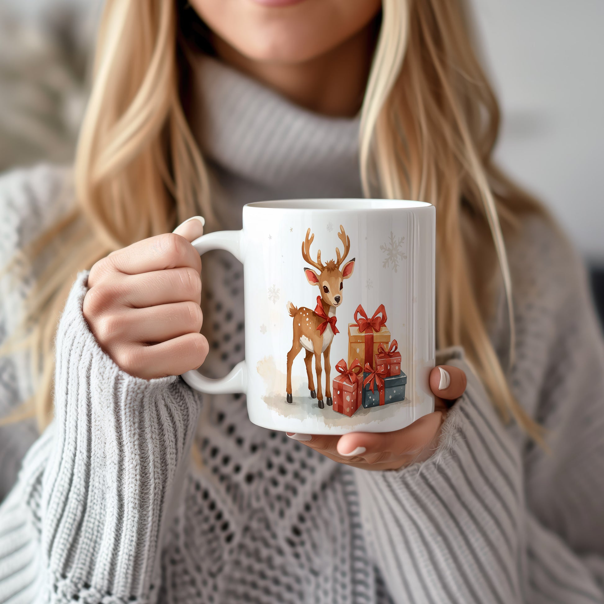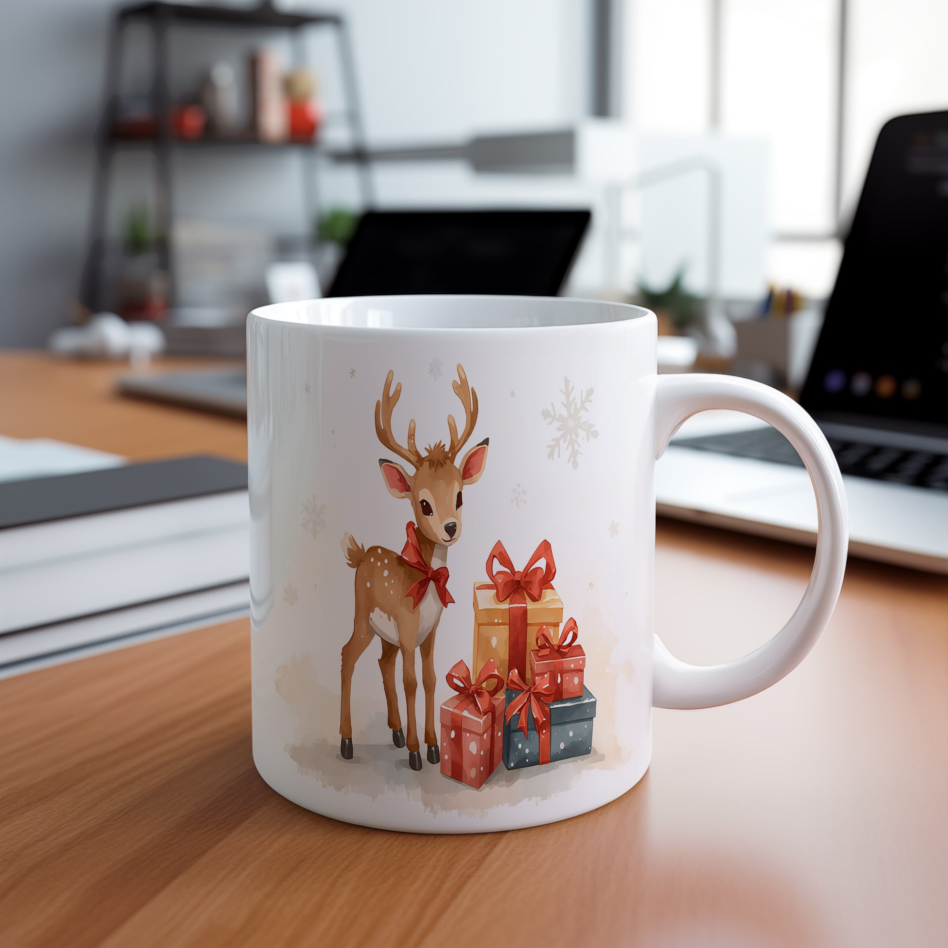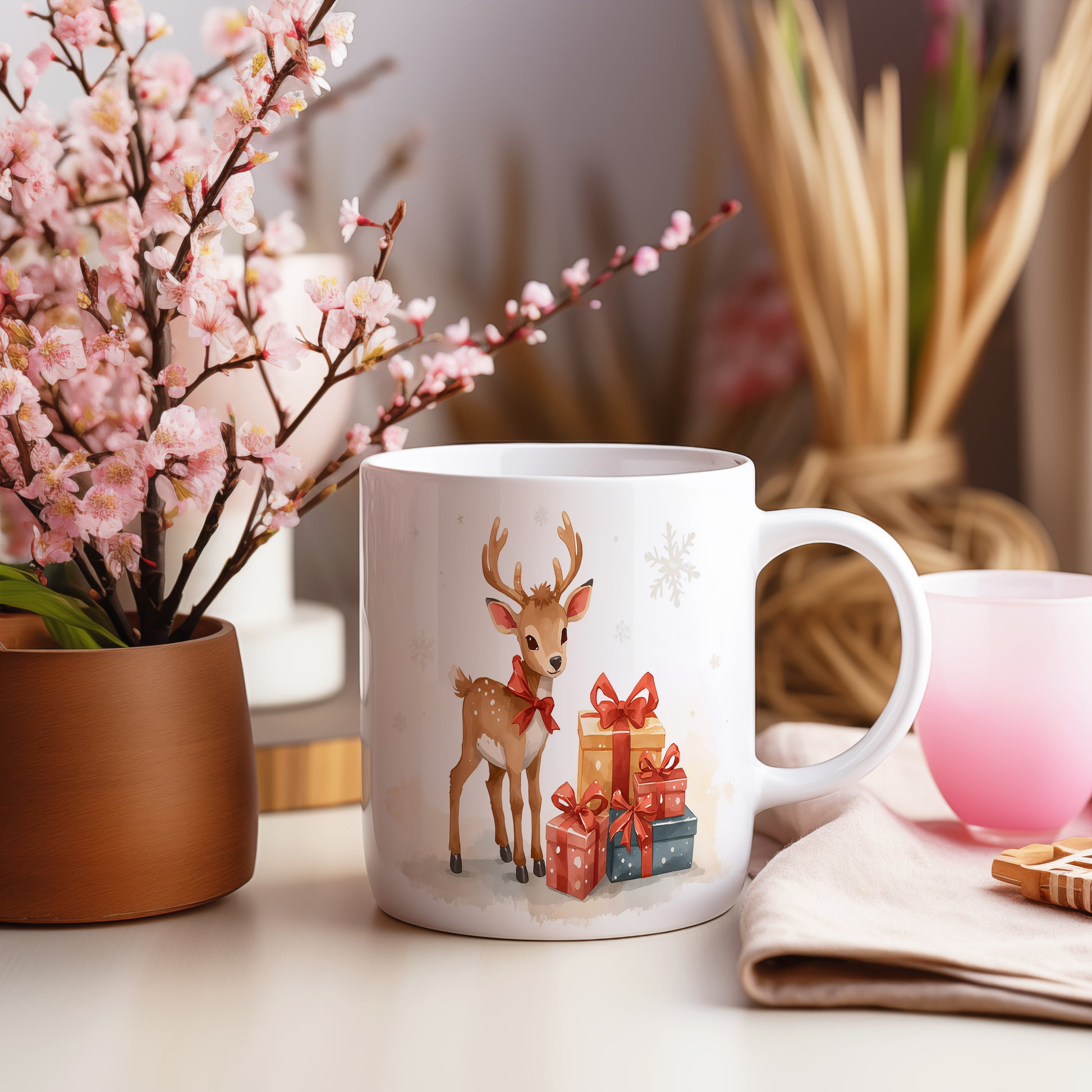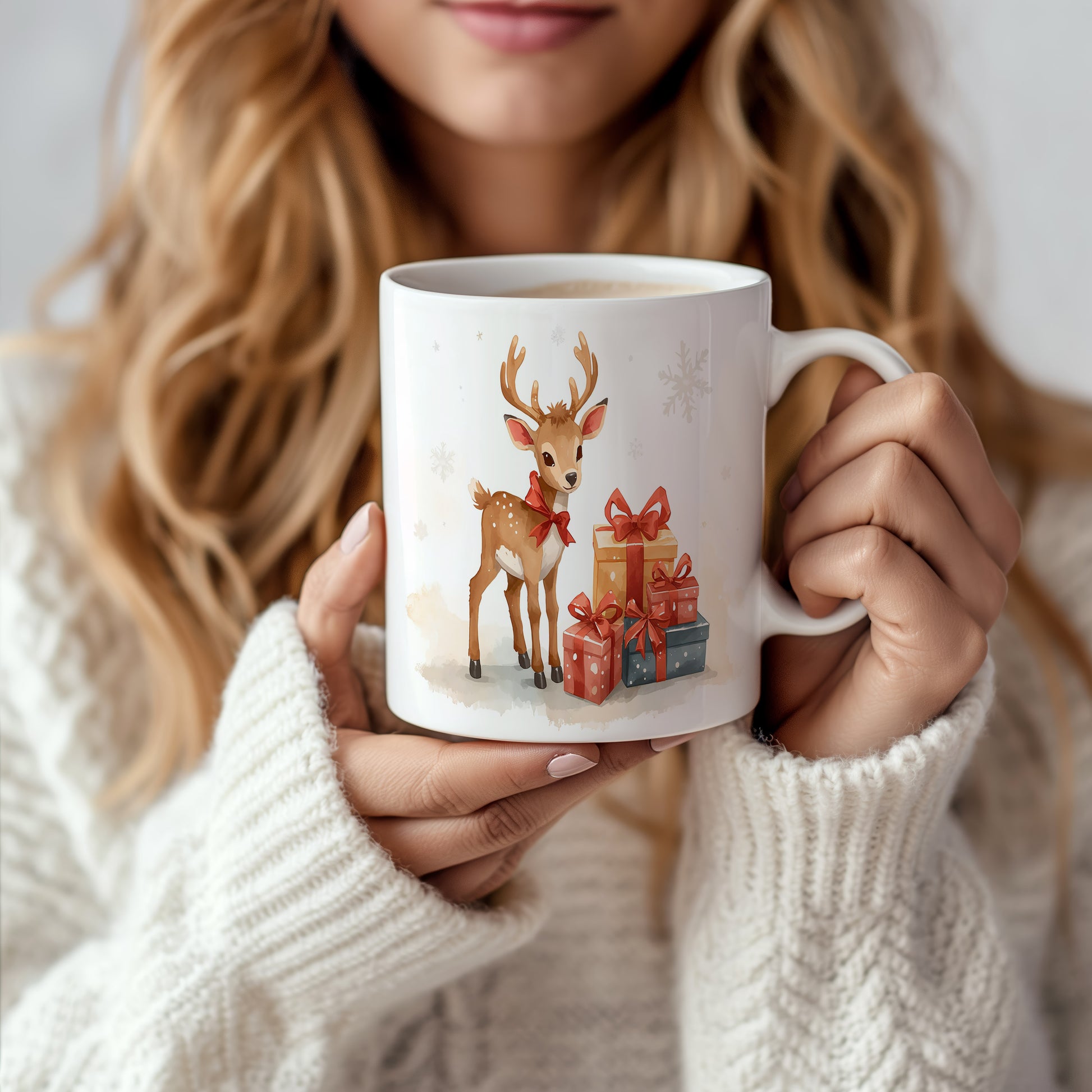 Na hrnku je roztomilý sob s červenou mašlí, obklopený vánočními dárky. V pozadí se jemně snáší sněhové vločky. Hrnek 330ml – vhodný do myčky i mikrovlnky.