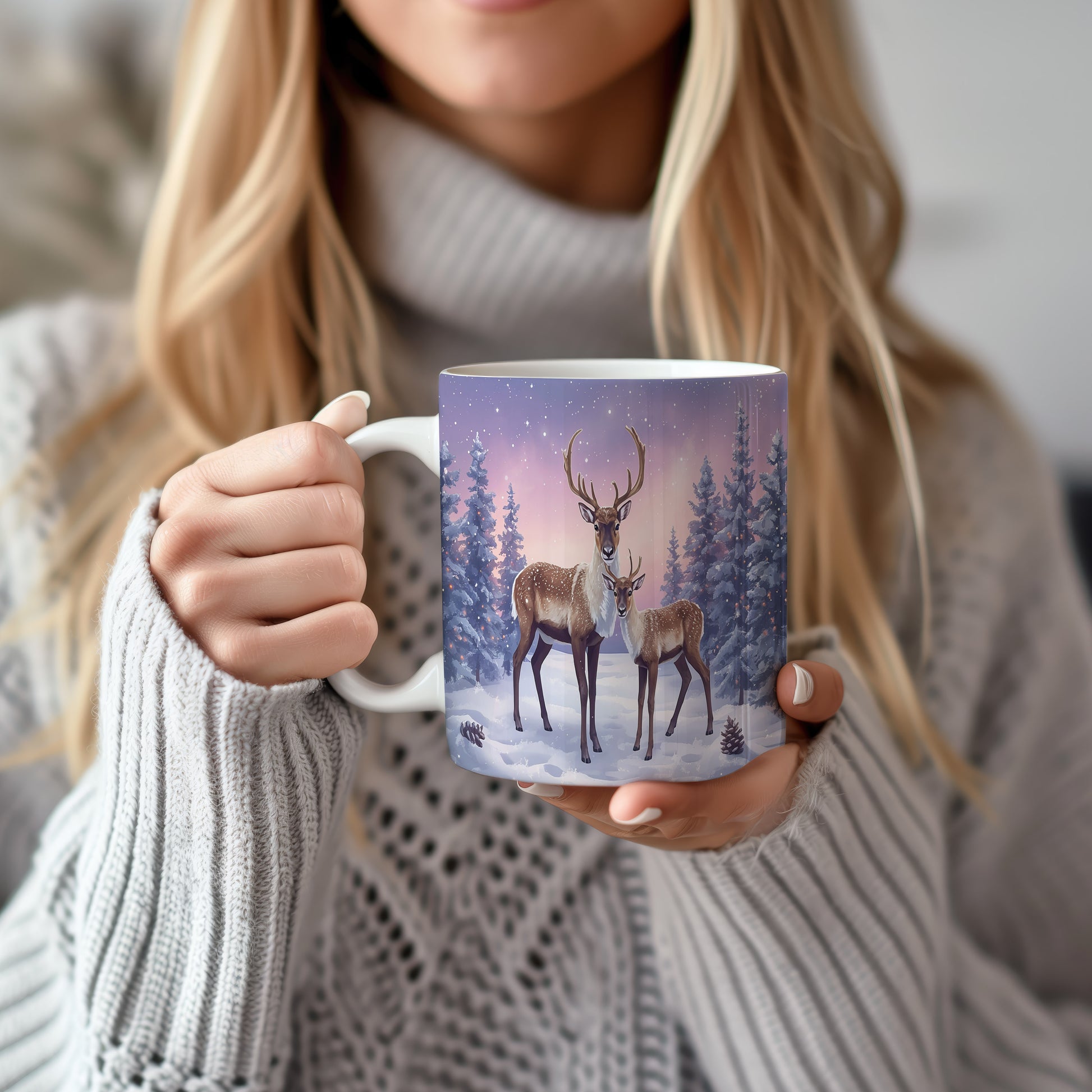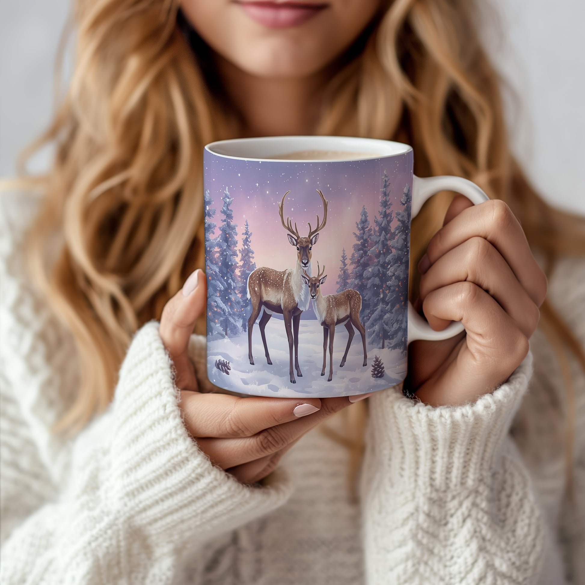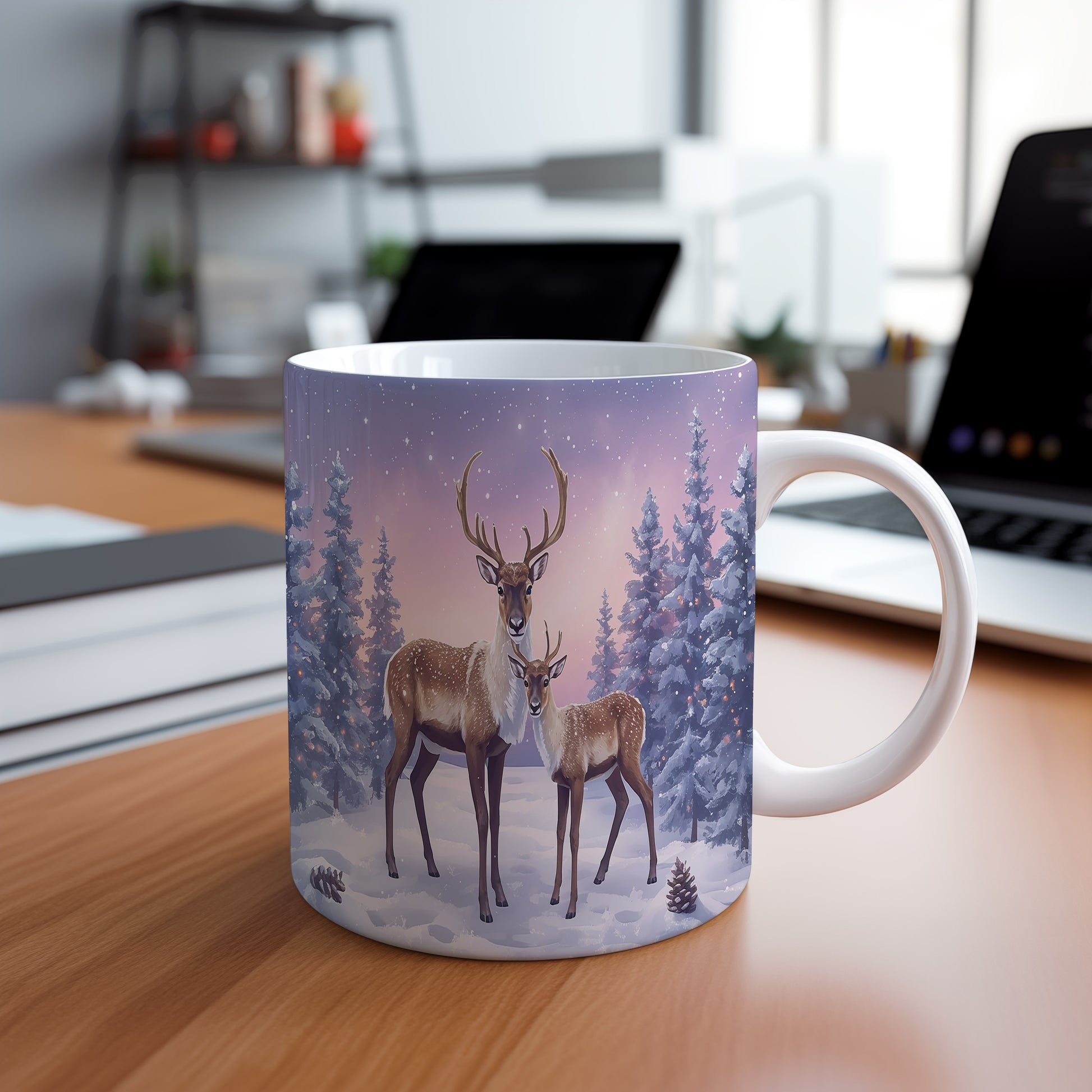 Hrnek s vánočním motivem – sobi v zasněženém lese – sníh, jeleni
