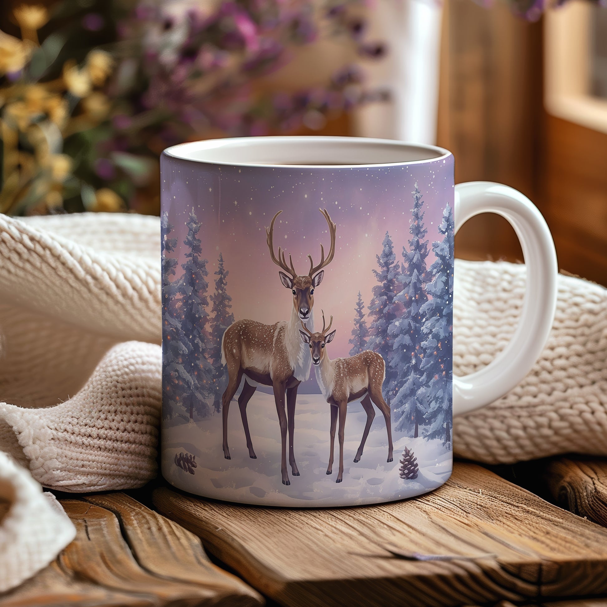 Na hrnku se vyjímají dva sobi stojící v zasněženém lese, obklopeni jemně zasněženými smrky a růžovým zimním nebem. Hrnek 330ml – vhodný do myčky i mikrovlnky.