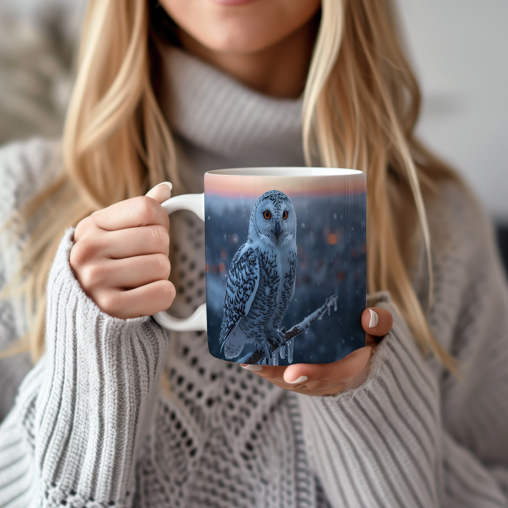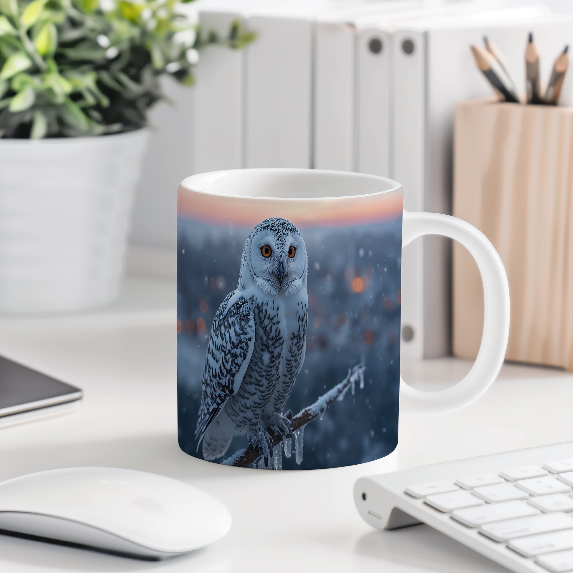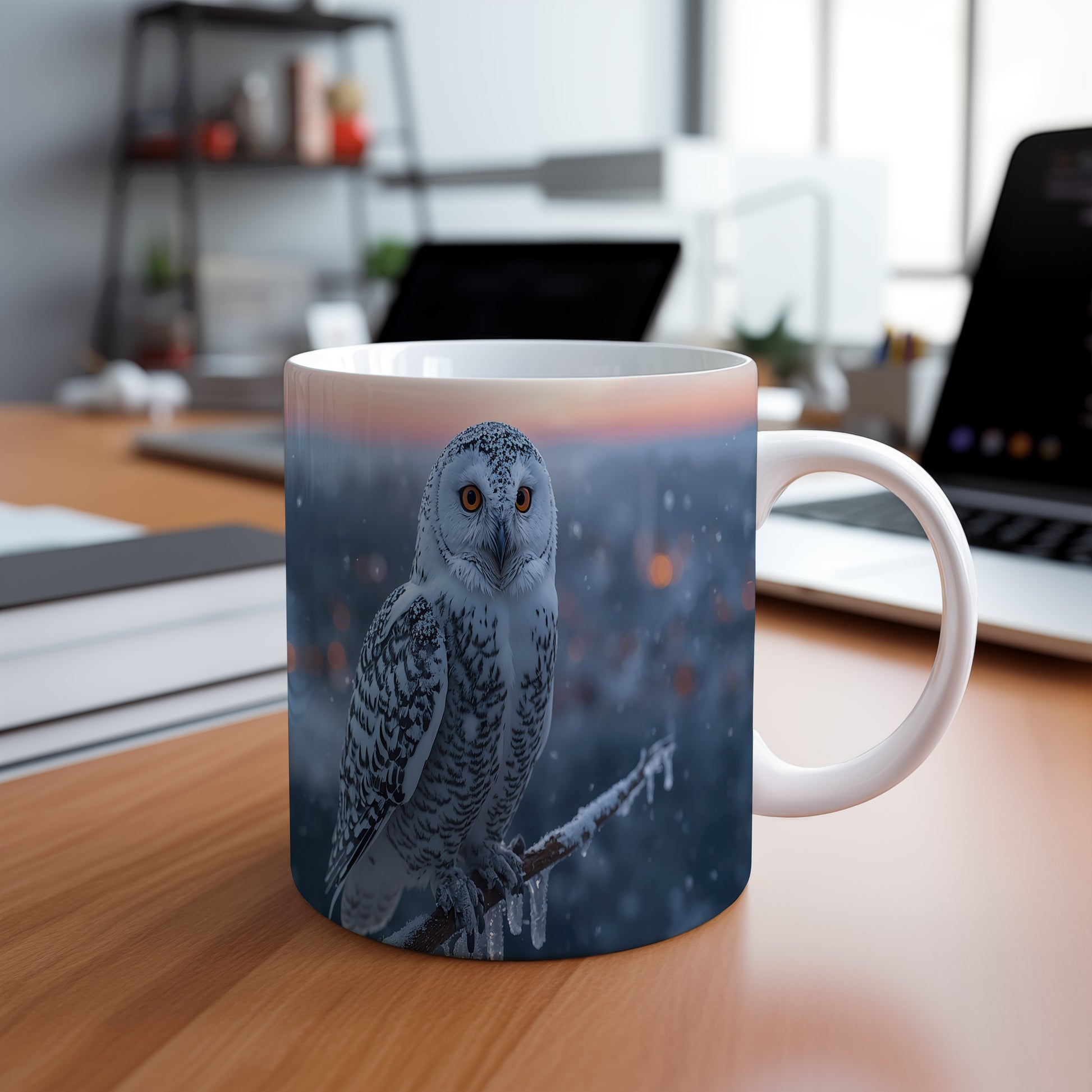Bílá sova sedí na zasněžené větvi, zatímco v pozadí se rozprostírá zimní panorama s jemnými světélky. Hrnek 330ml – vhodný do myčky i mikrovlnky.
