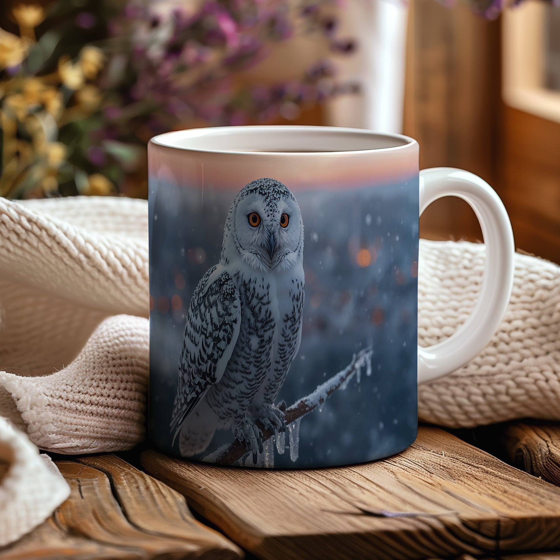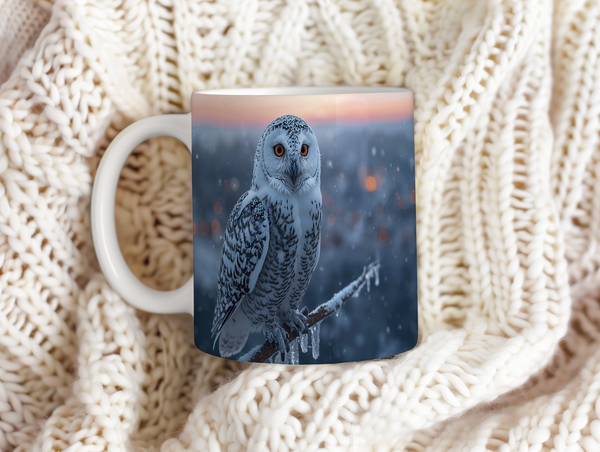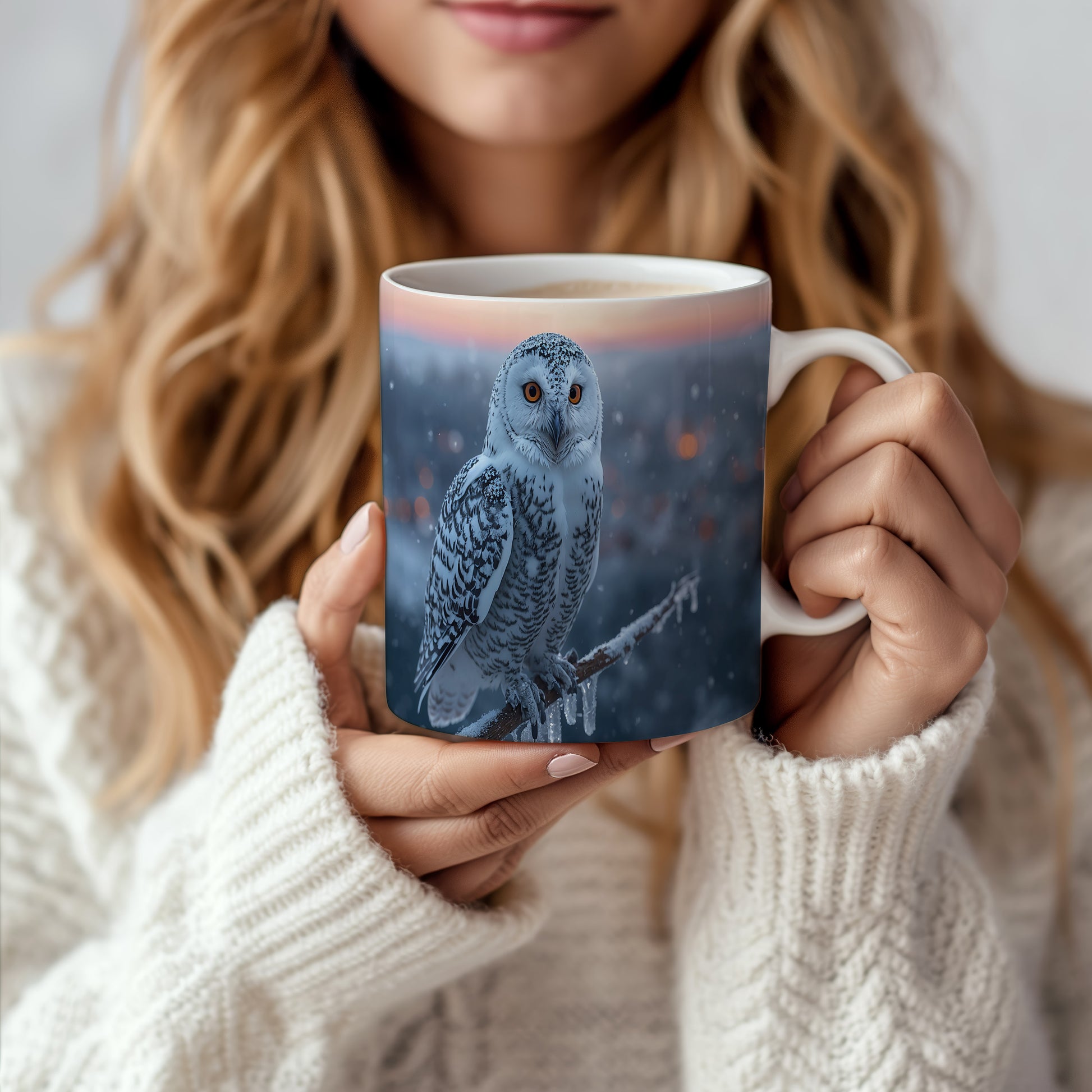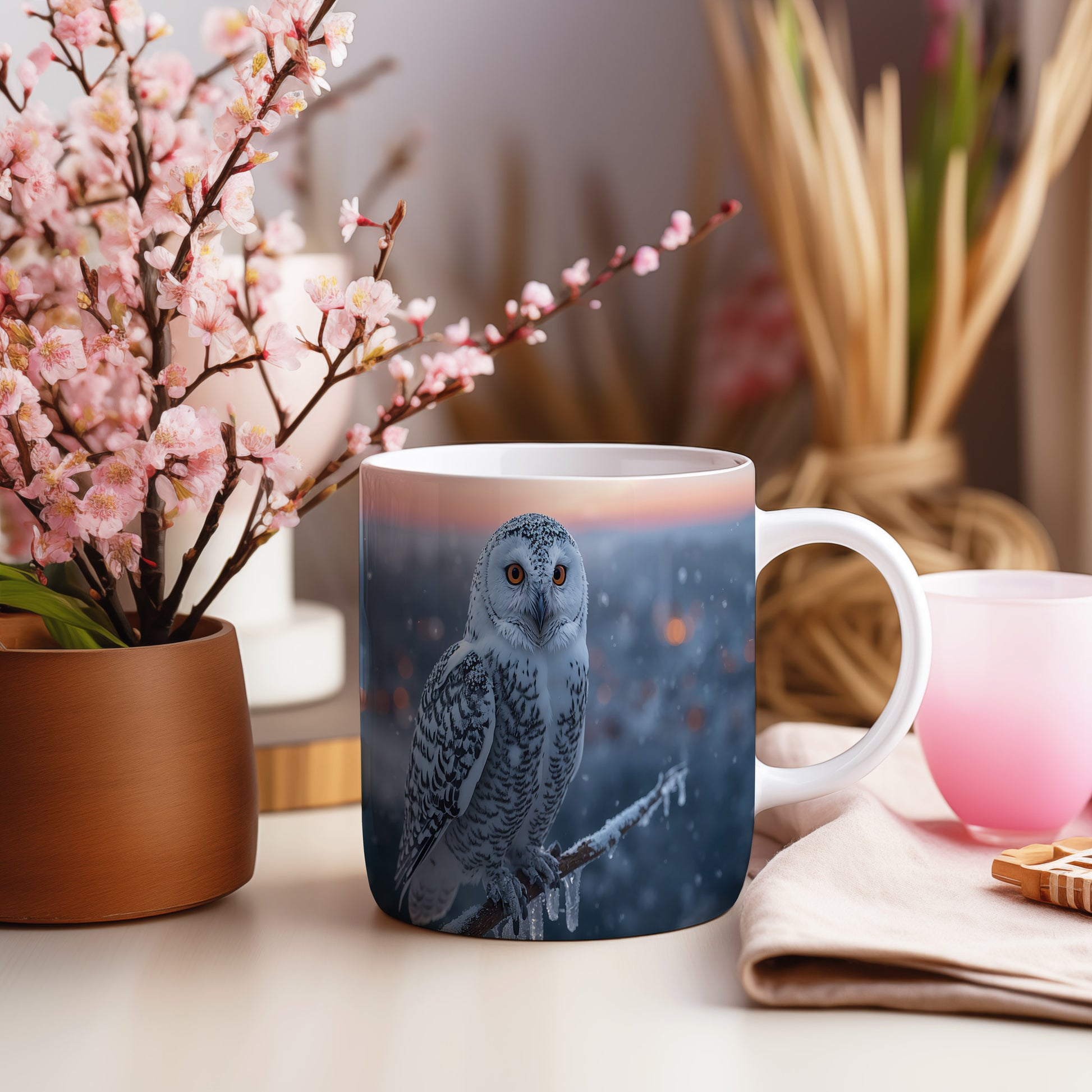 Bílá sova sedí na zasněžené větvi, zatímco v pozadí se rozprostírá zimní panorama s jemnými světélky. Hrnek 330ml – vhodný do myčky i mikrovlnky.