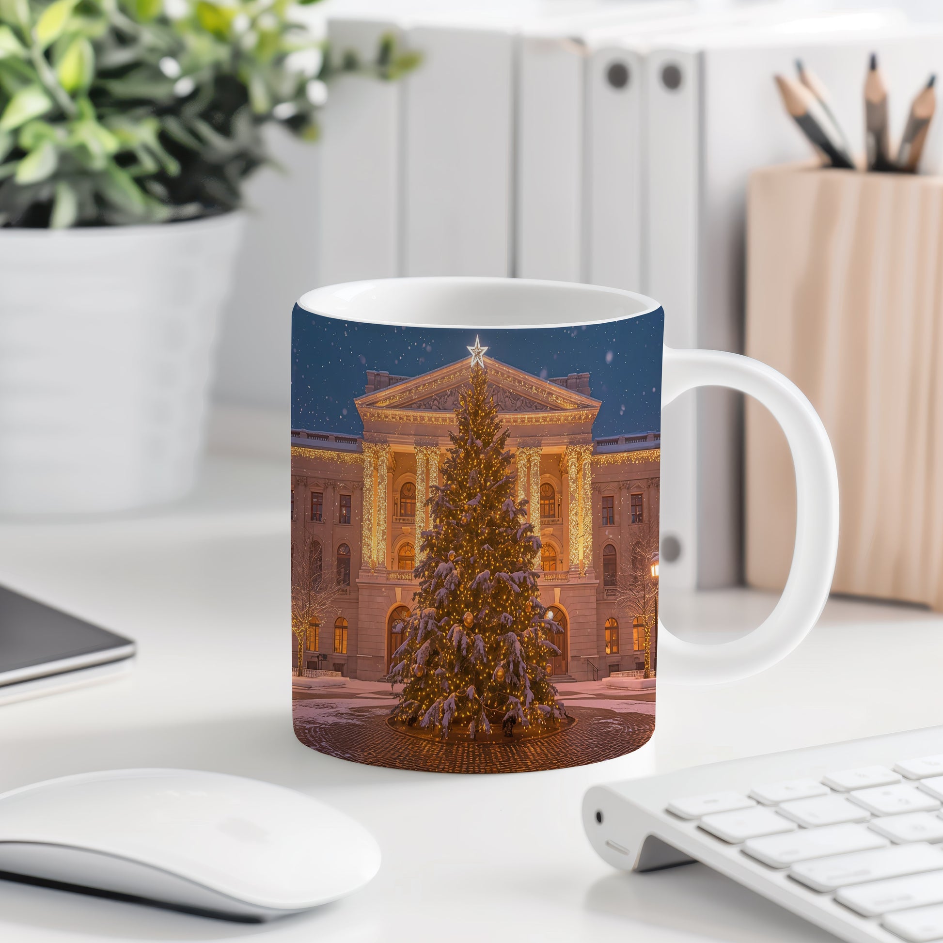 Tmavě modré nebe kontrastuje se zářícími světly na vánočním stromě před majestátní budovou. Atmosféra klidu a sváteční pohody. Hrnek 330ml – vhodný do myčky i mikrovlnky.
