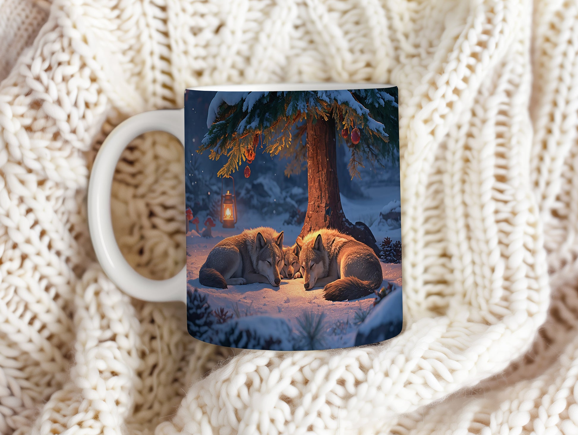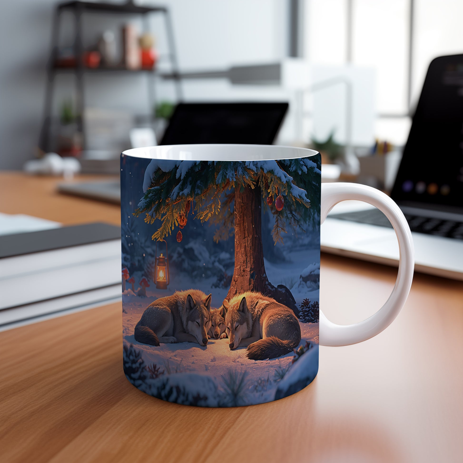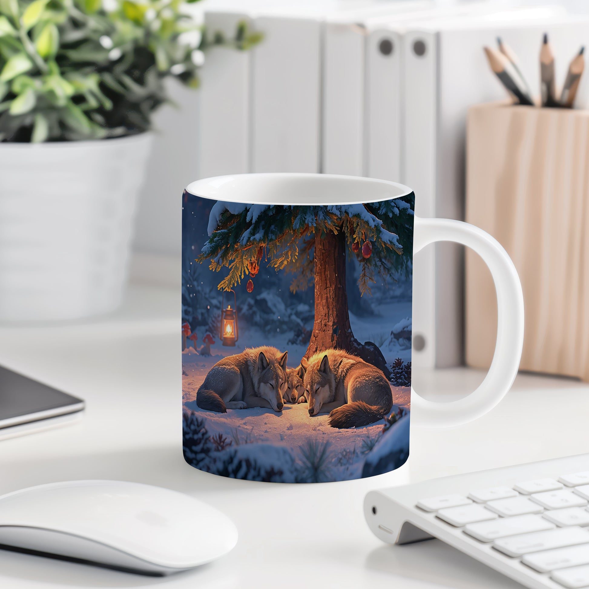 Tmavá zimní scéna s vlky odpočívajícími pod zasněženým stromem, osvětlená teplým světlem lampy. Hrnek 330ml – vhodný do myčky i mikrovlnky.