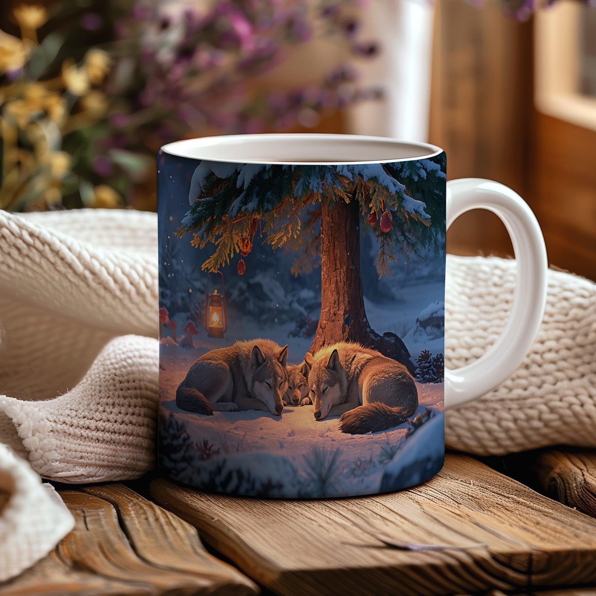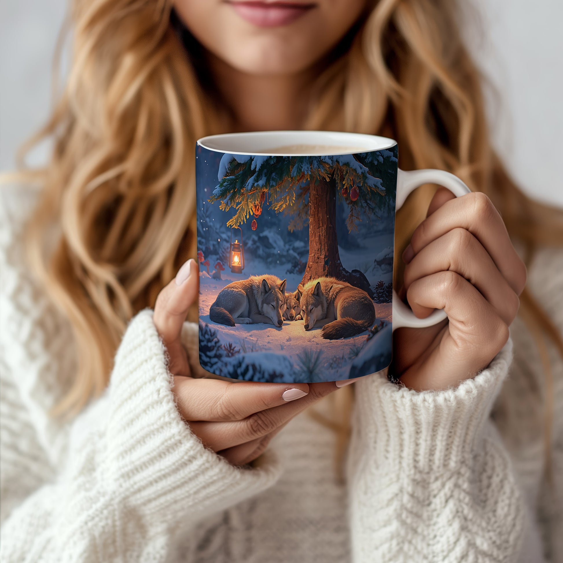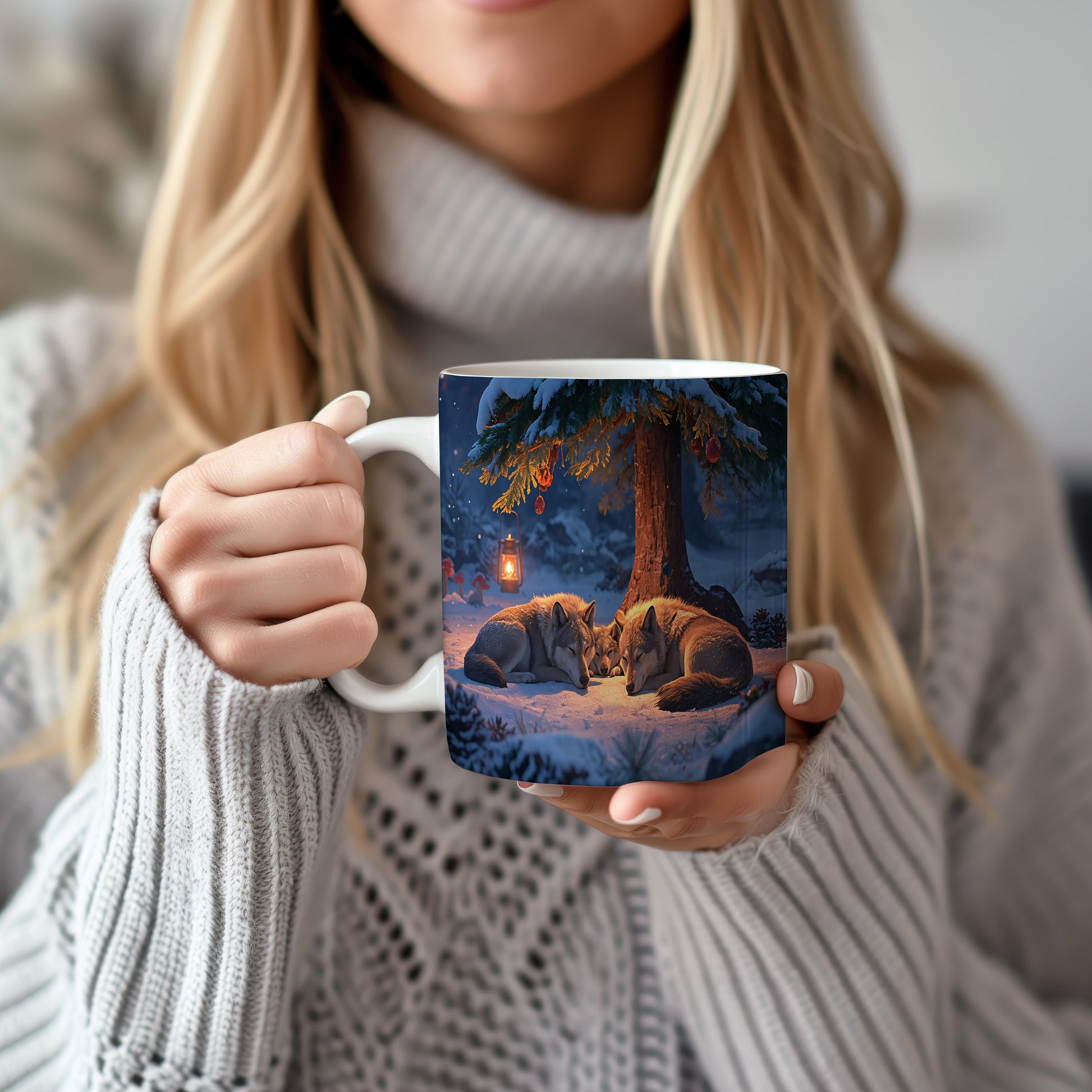 Tmavá zimní scéna s vlky odpočívajícími pod zasněženým stromem, osvětlená teplým světlem lampy. Hrnek 330ml – vhodný do myčky i mikrovlnky.