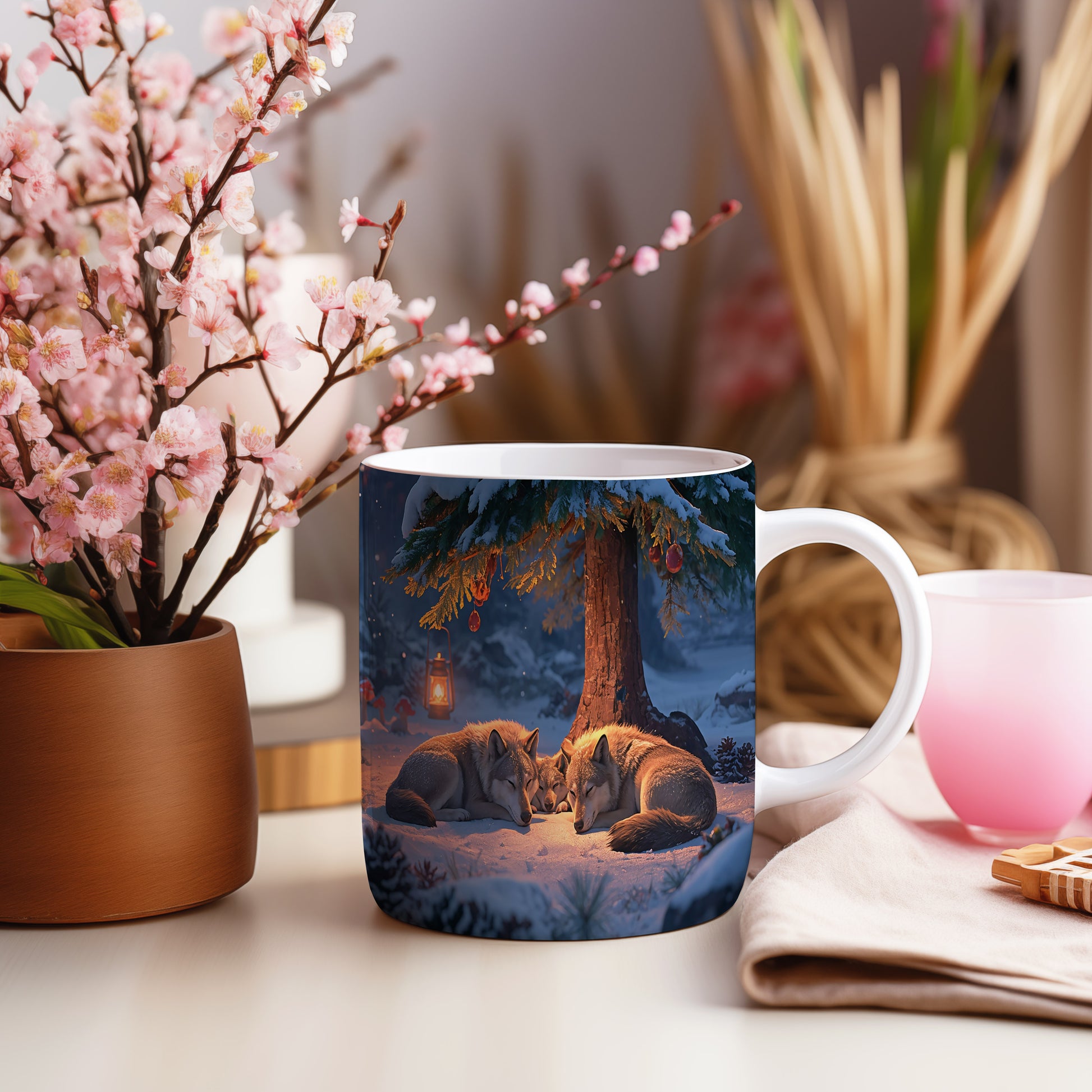 Hrnek s vánočním motivem – vlci pod stromem