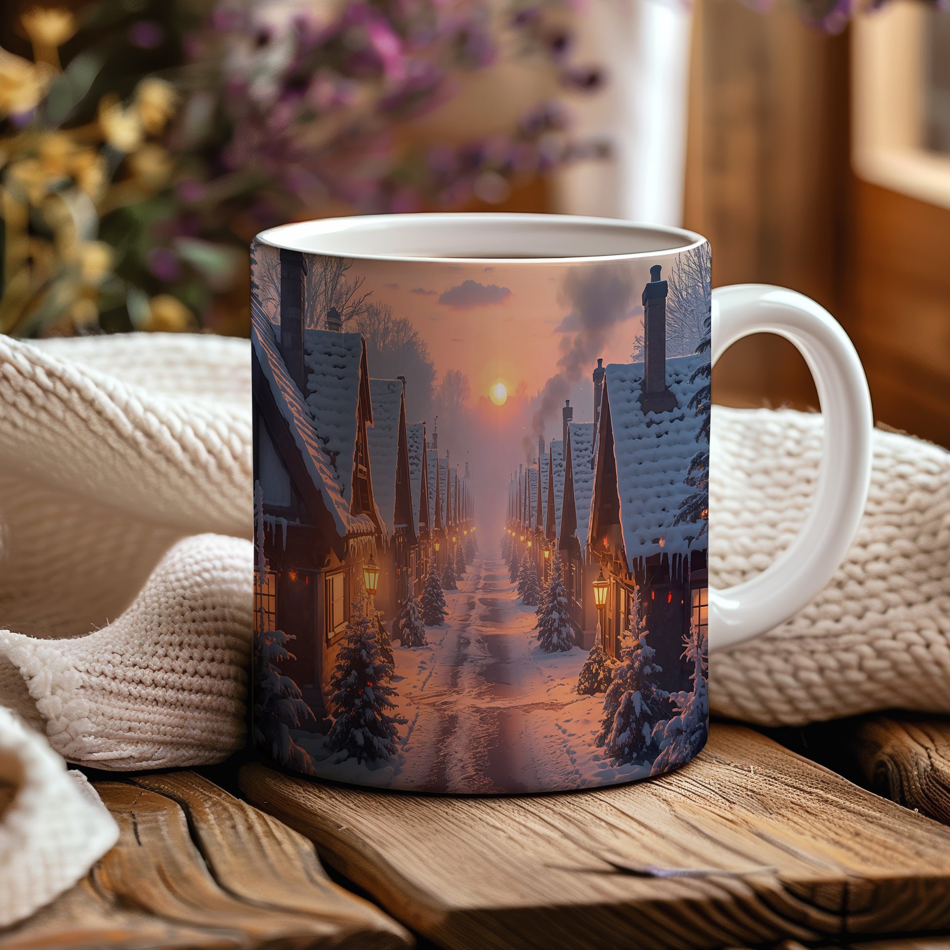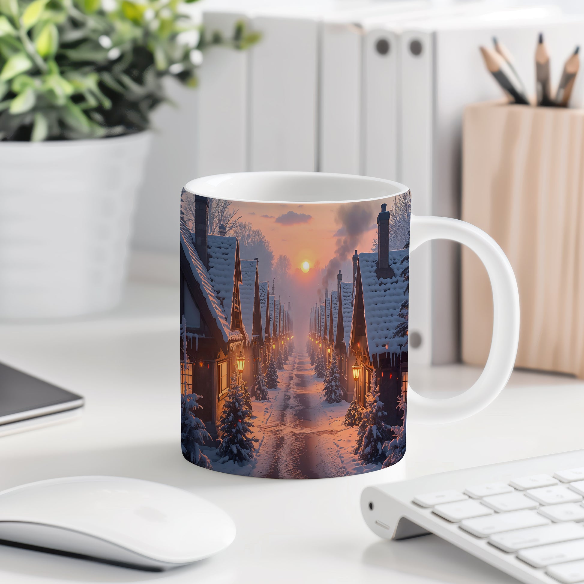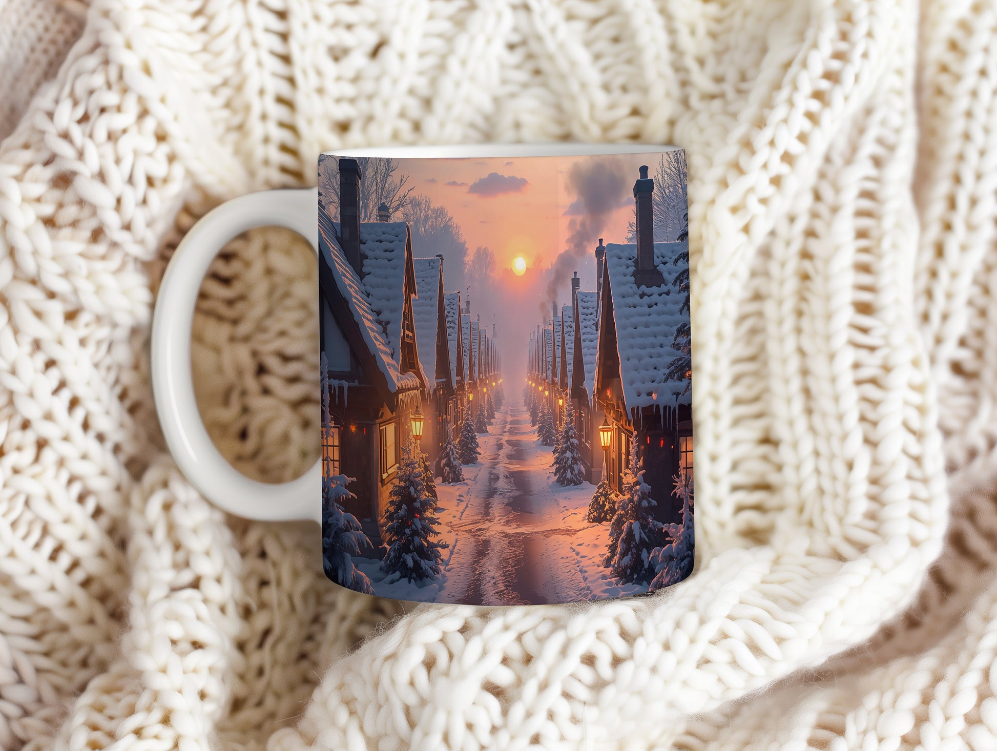 Teplé barvy zapadajícího slunce osvětlují zasněženou ulici s řadou chaloupek a lamp. Vytváří to klidnou a kouzelnou atmosféru. Hrnek 330ml – vhodný do myčky i mikrovlnky.