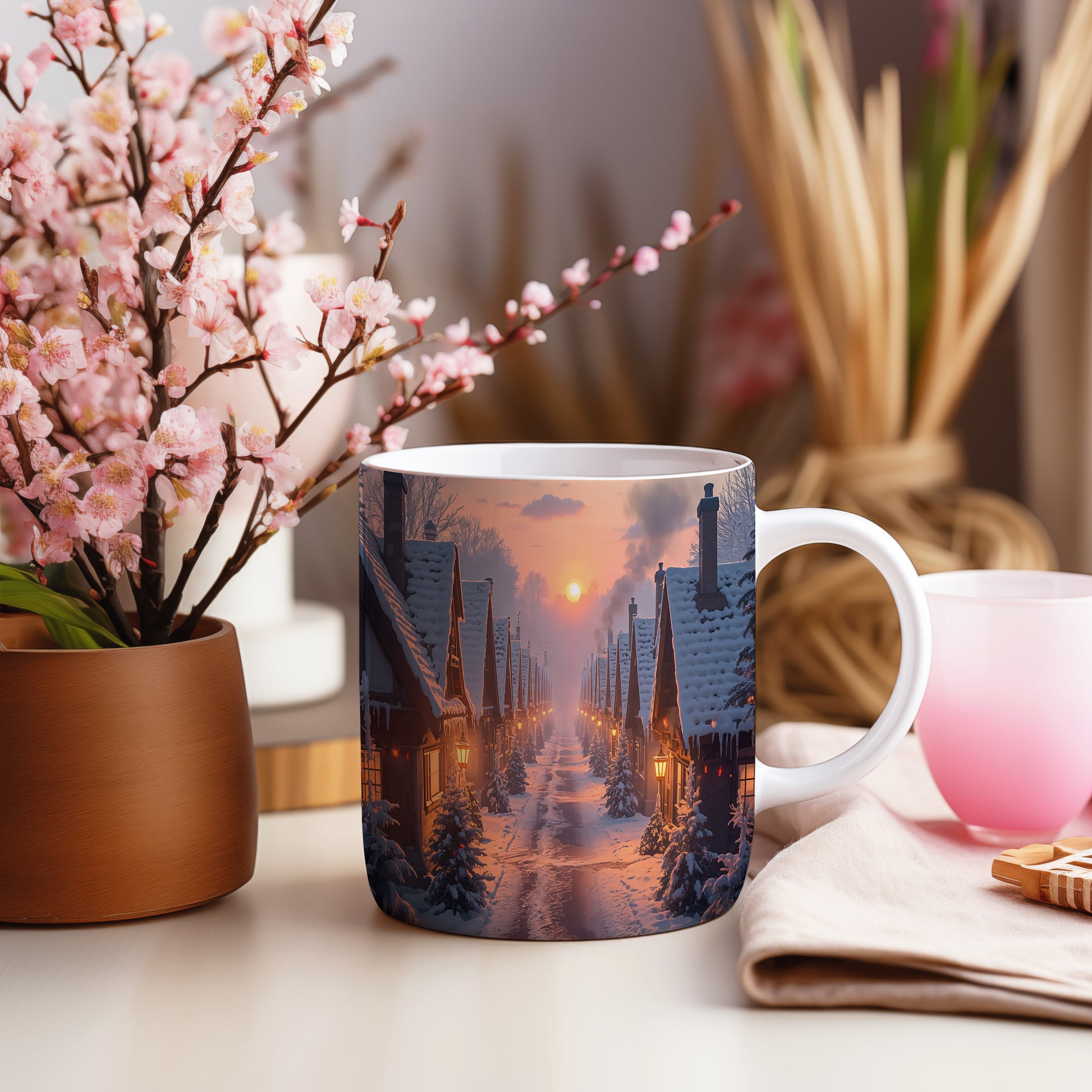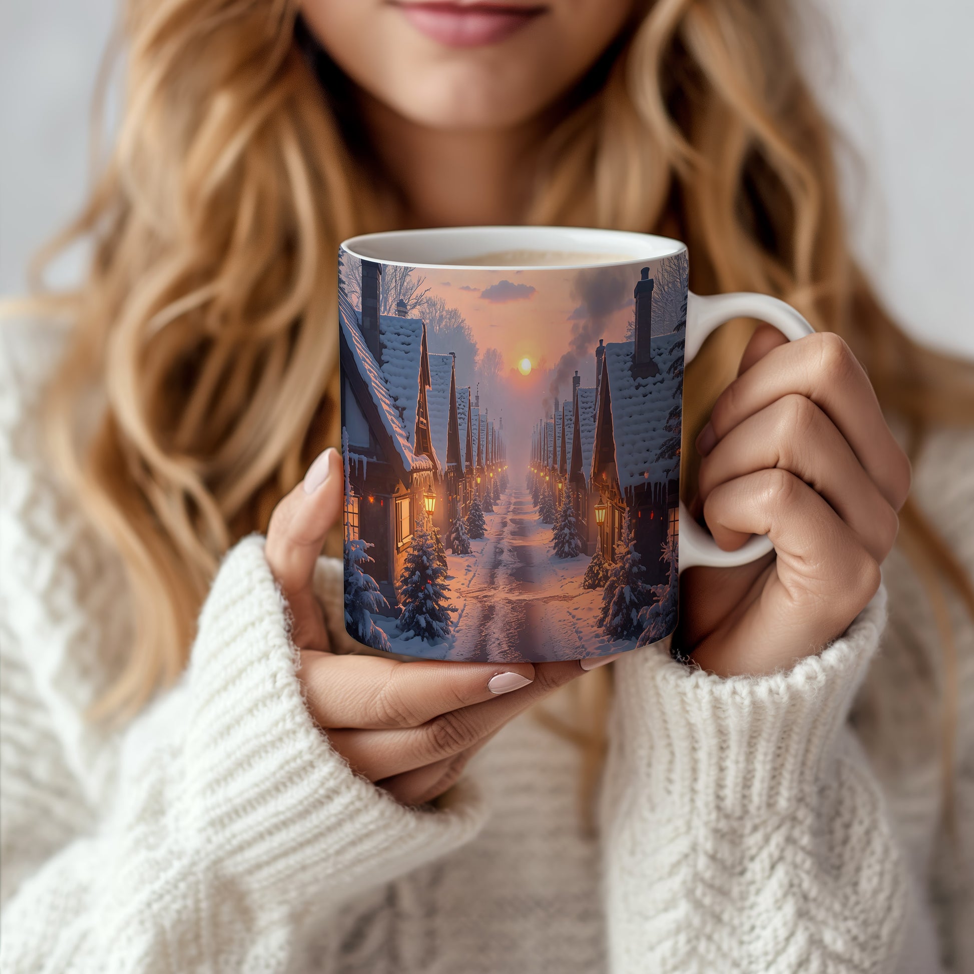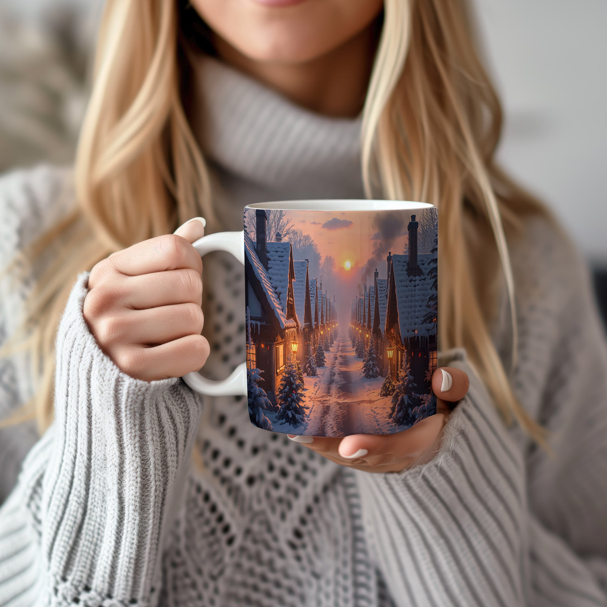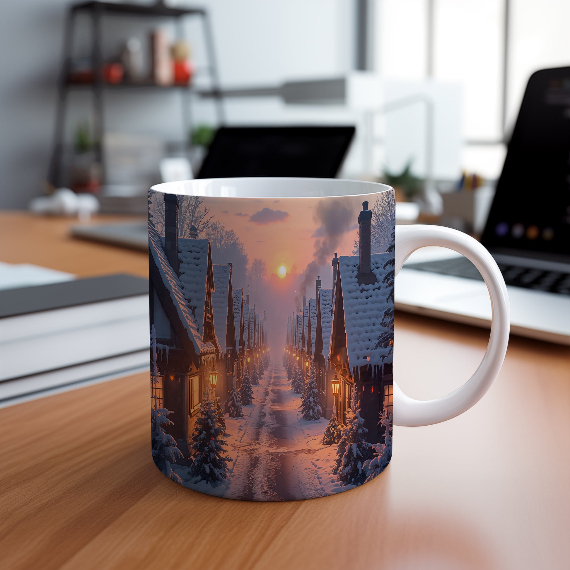 Teplé barvy zapadajícího slunce osvětlují zasněženou ulici s řadou chaloupek a lamp. Vytváří to klidnou a kouzelnou atmosféru. Hrnek 330ml – vhodný do myčky i mikrovlnky.