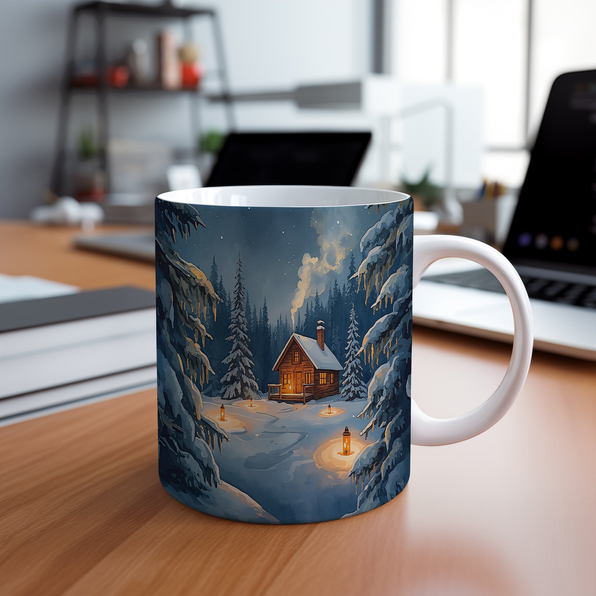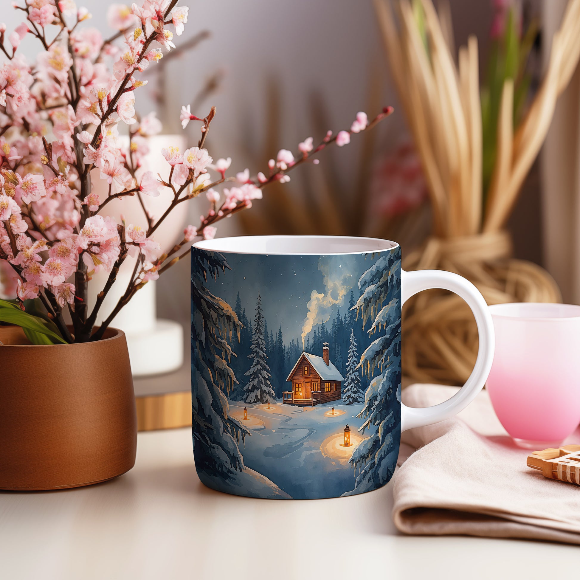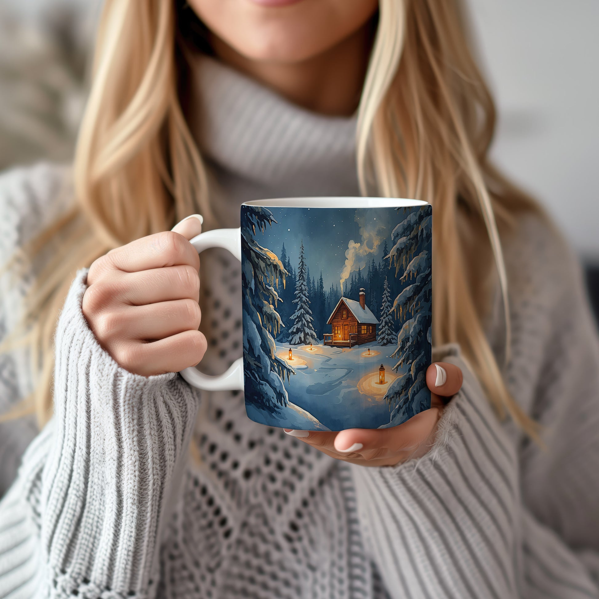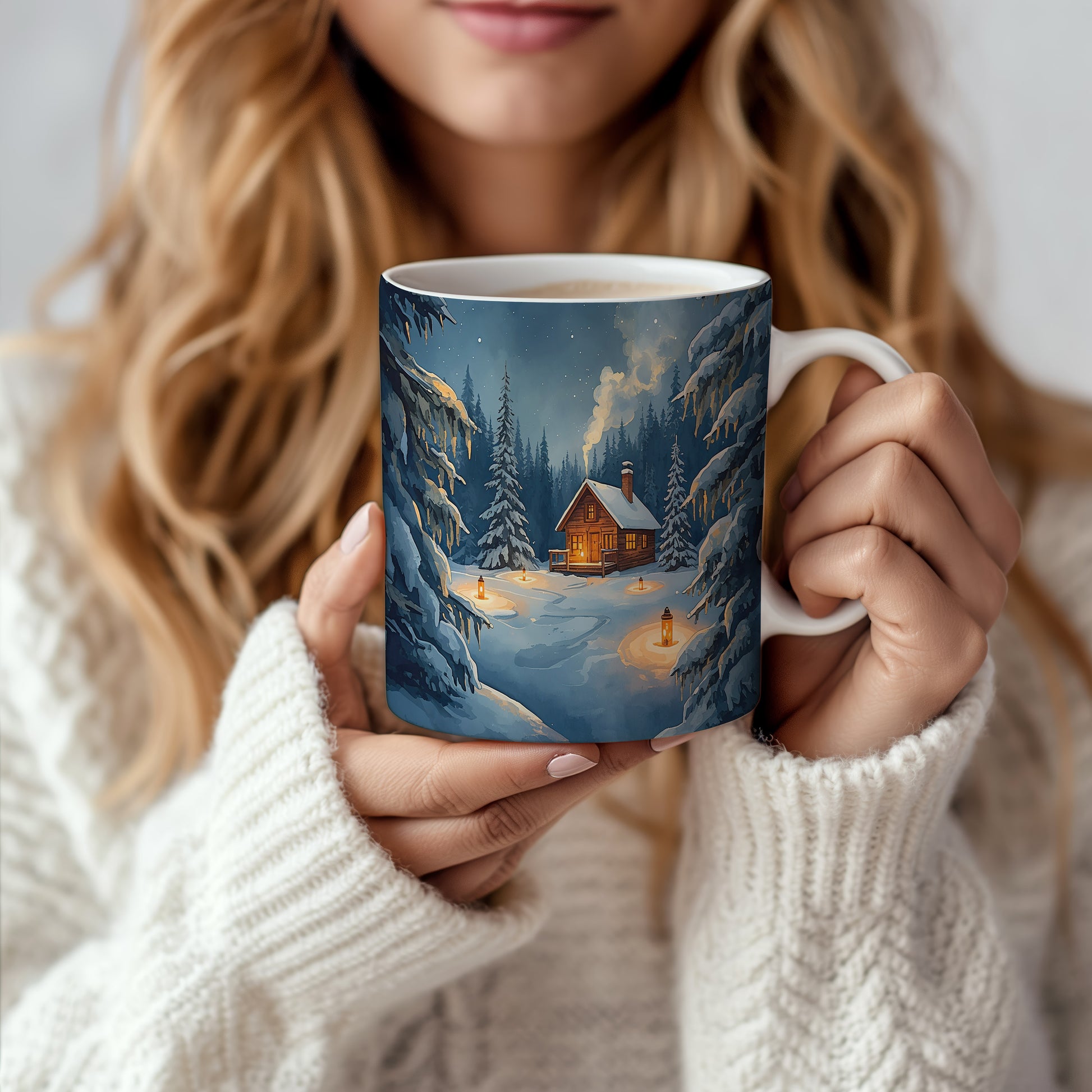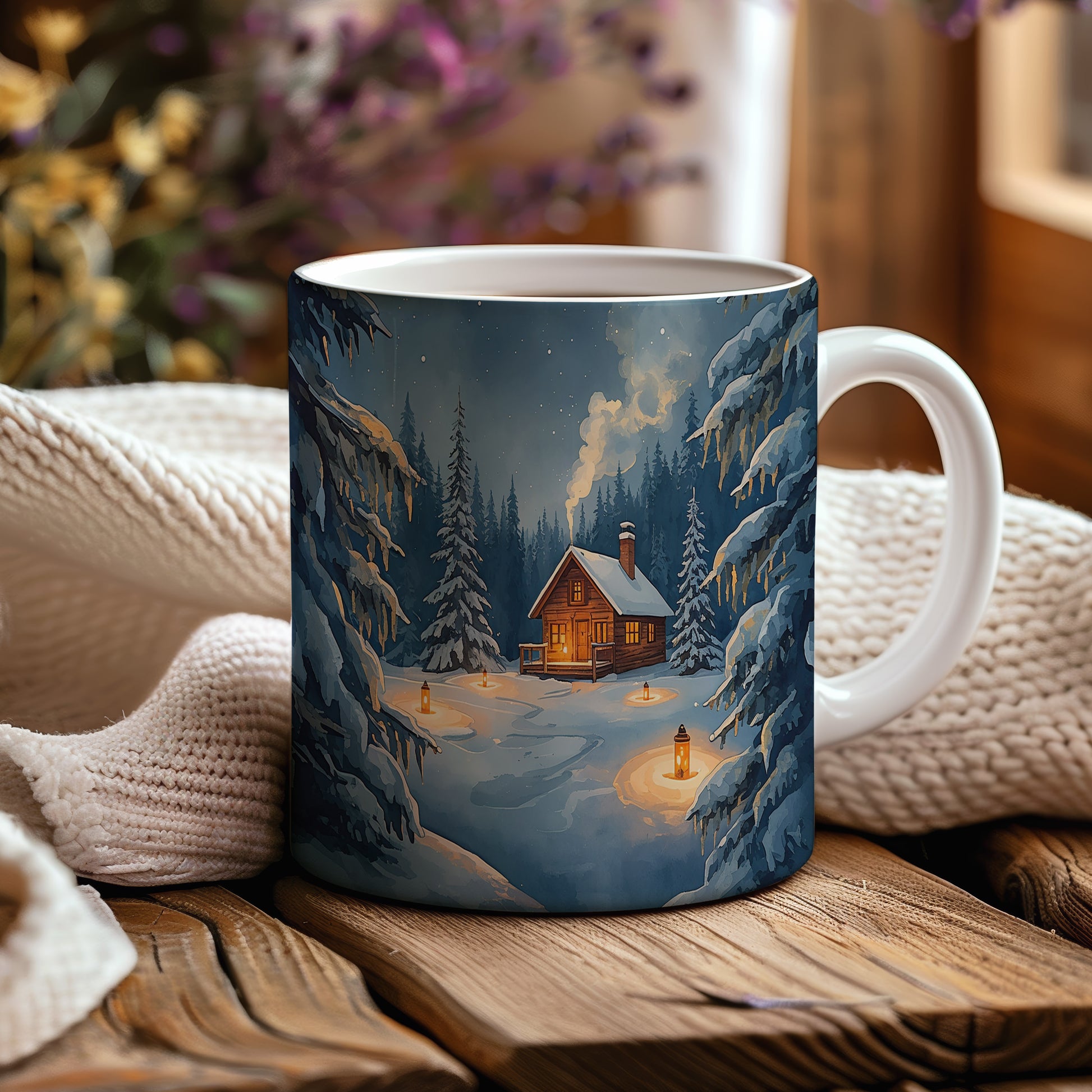 Tmavě modrá obloha plná sněhových vloček vytváří klidnou zimní atmosféru. Zář luceren osvětluje cestu k dřevěné chaloupce. Hrnek 330ml – vhodný do myčky i mikrovlnky.