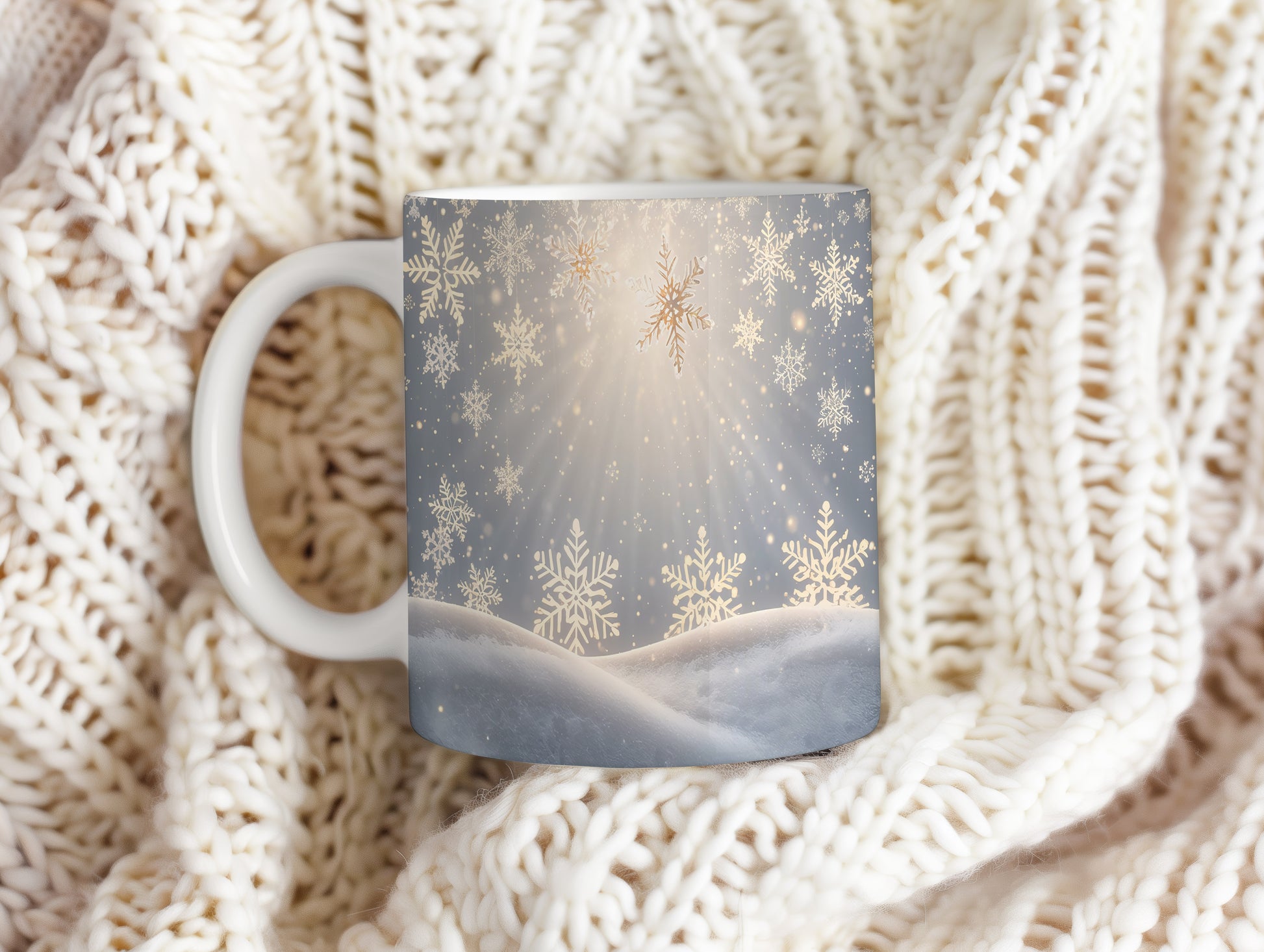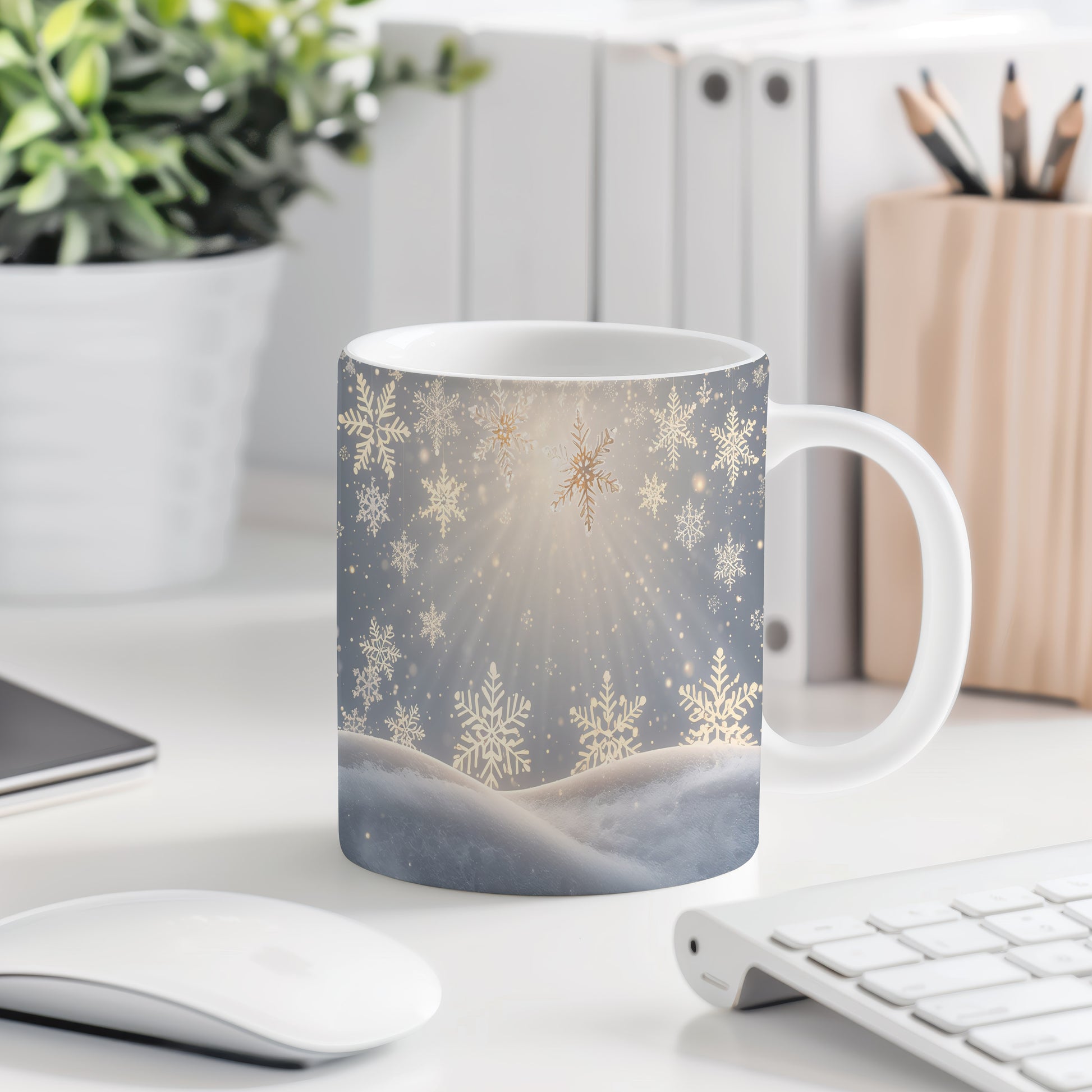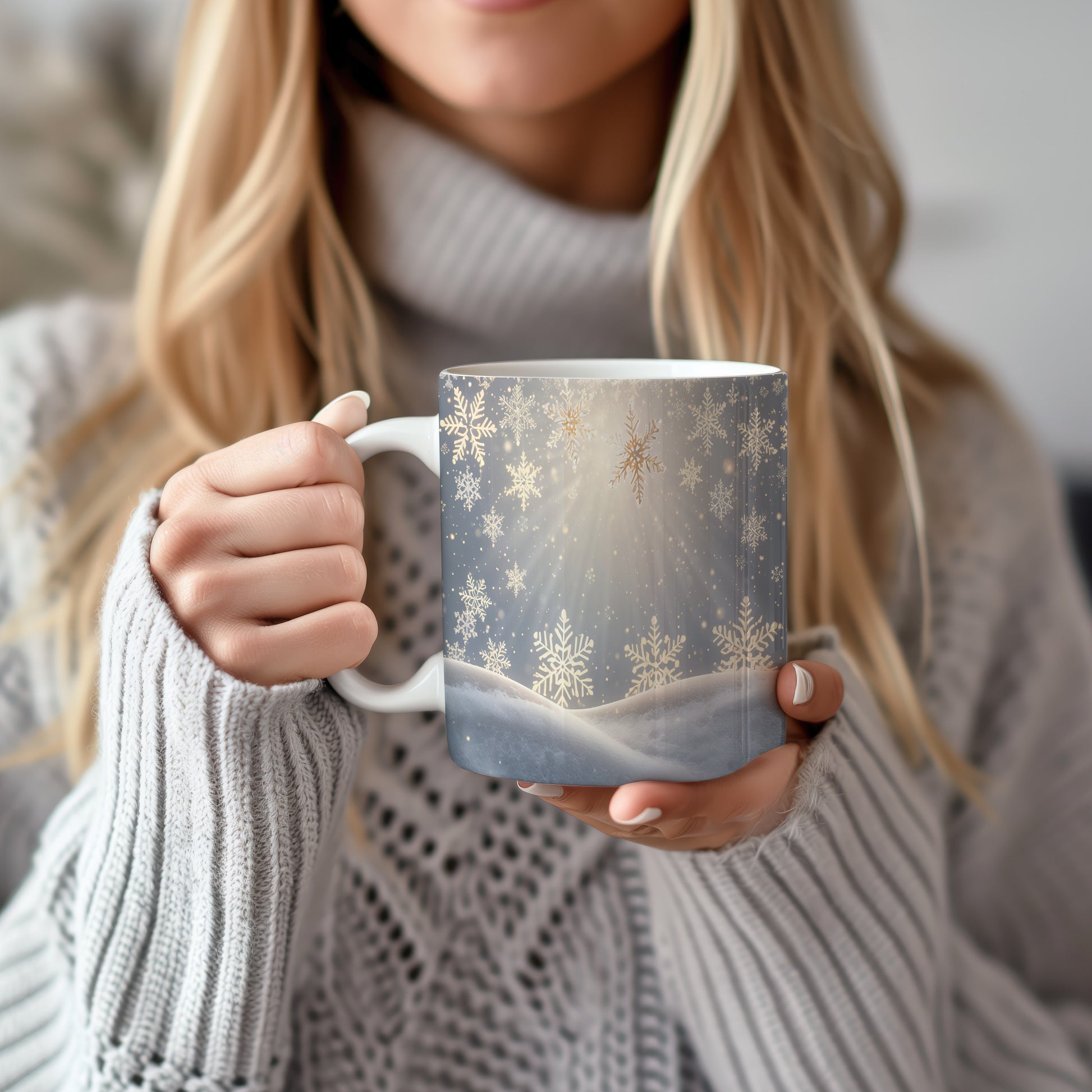 Hrnek s vánočním motivem – zlatavé vločky na zimní obloze