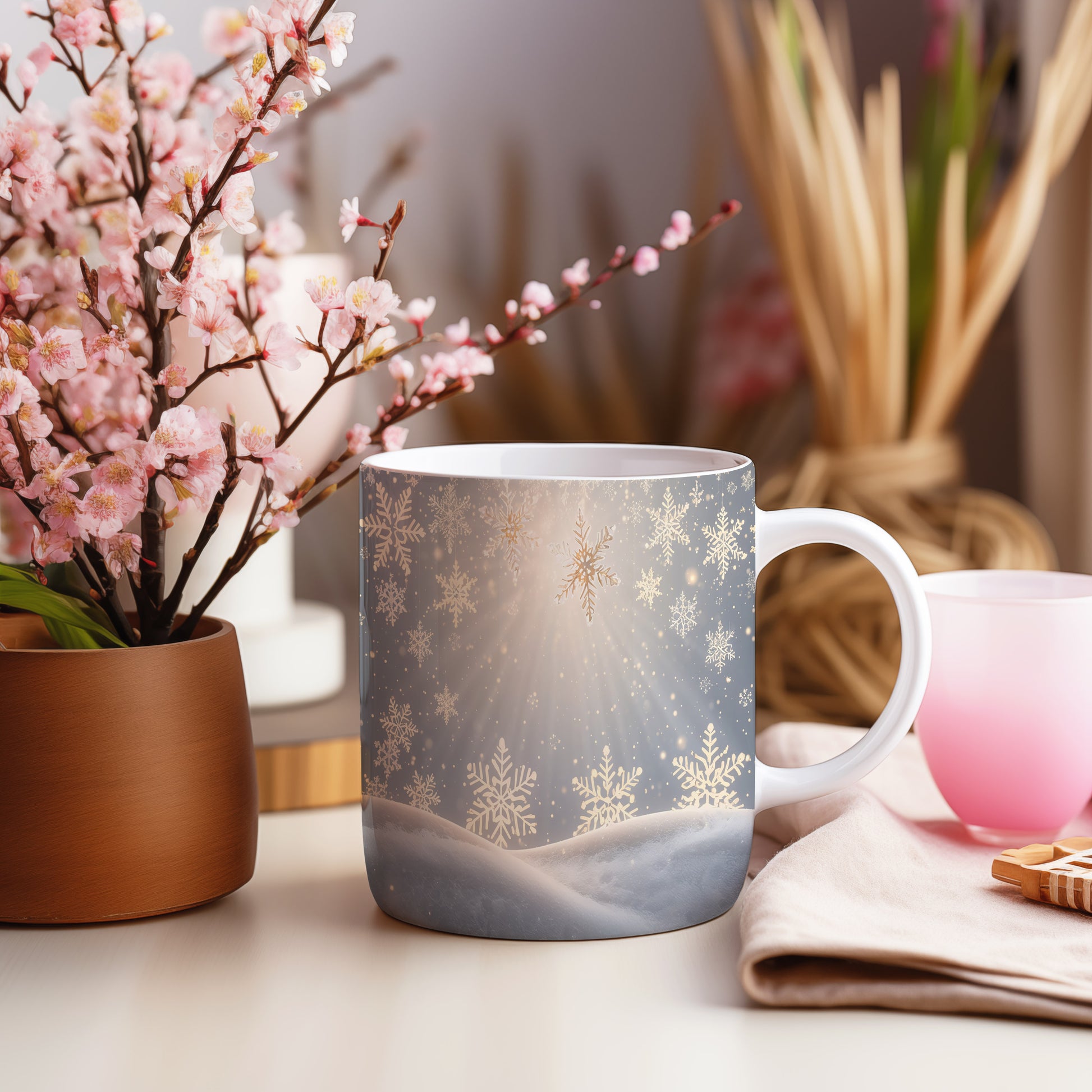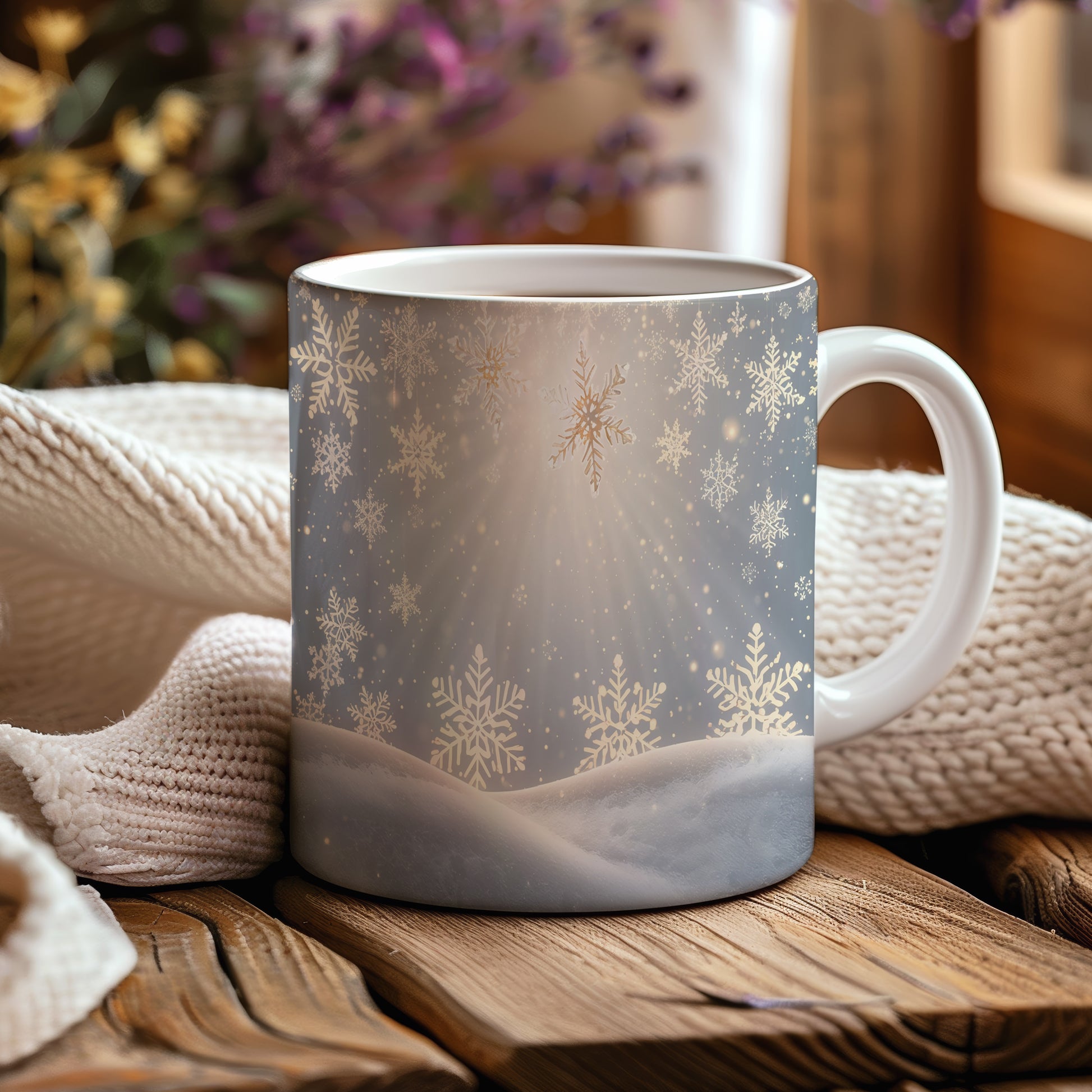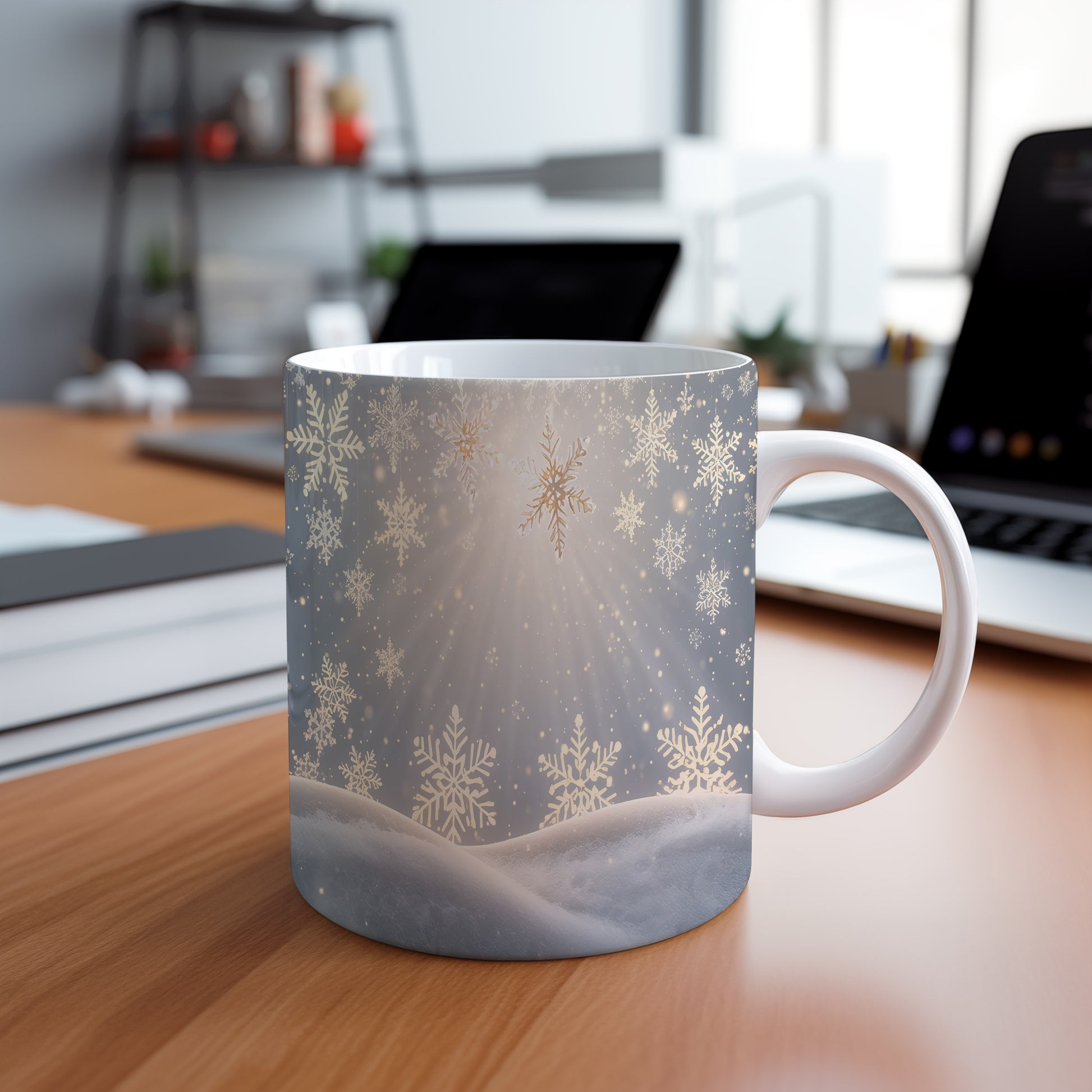 Hrnek s vánočním motivem – zlatavé vločky na zimní obloze