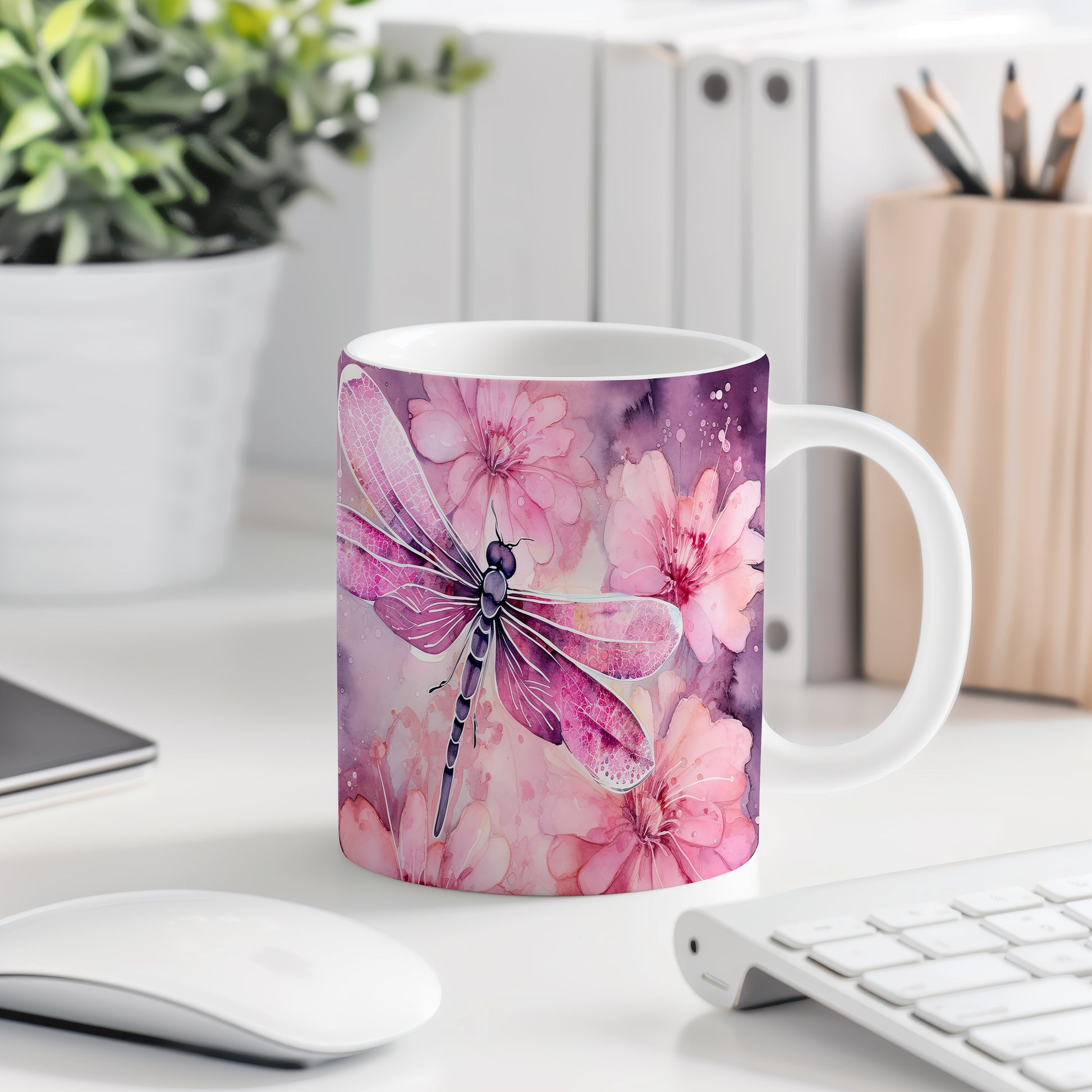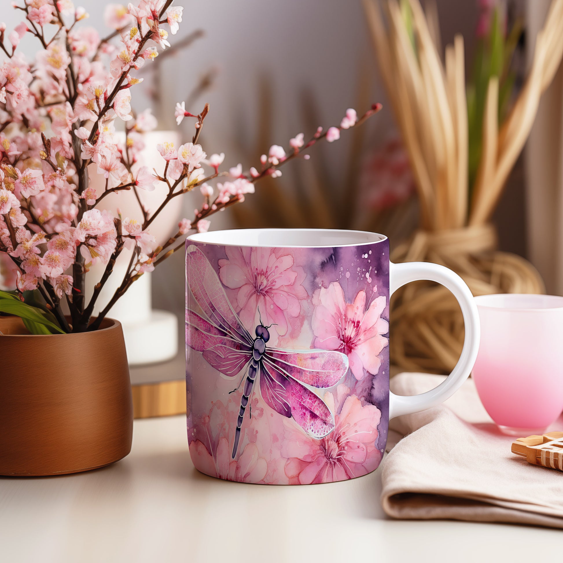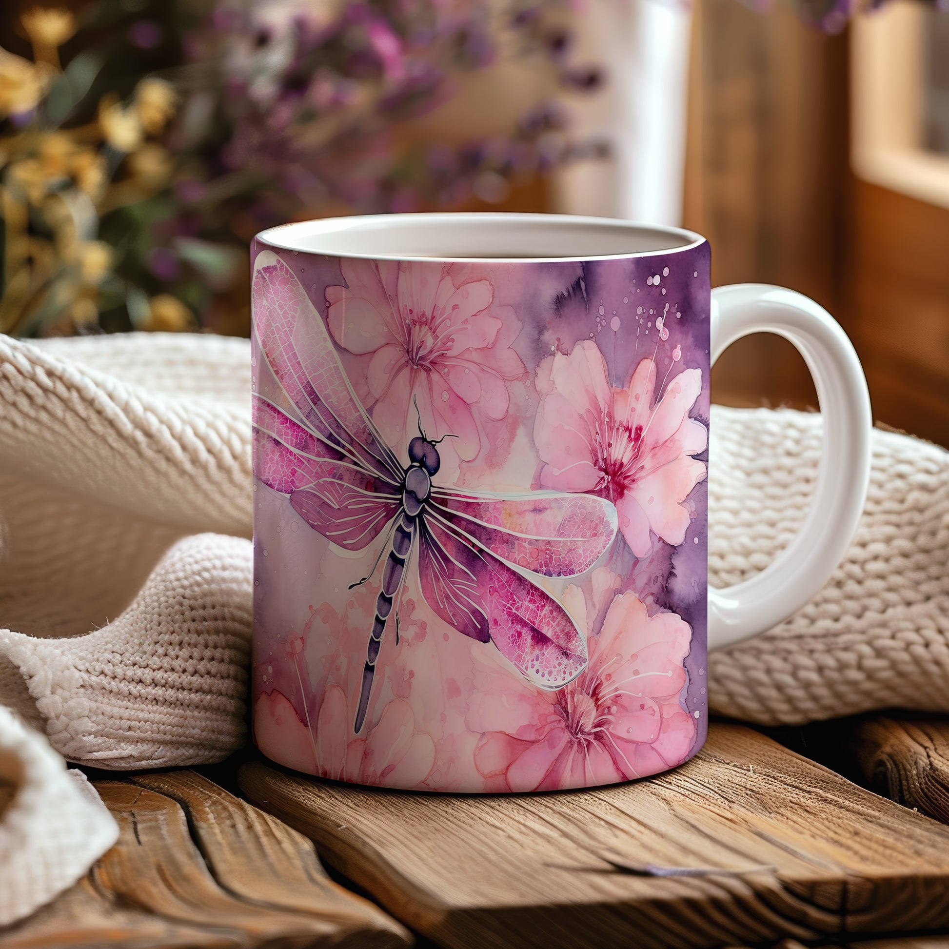 Hrnek s vážkou a květinami – výrazným designem