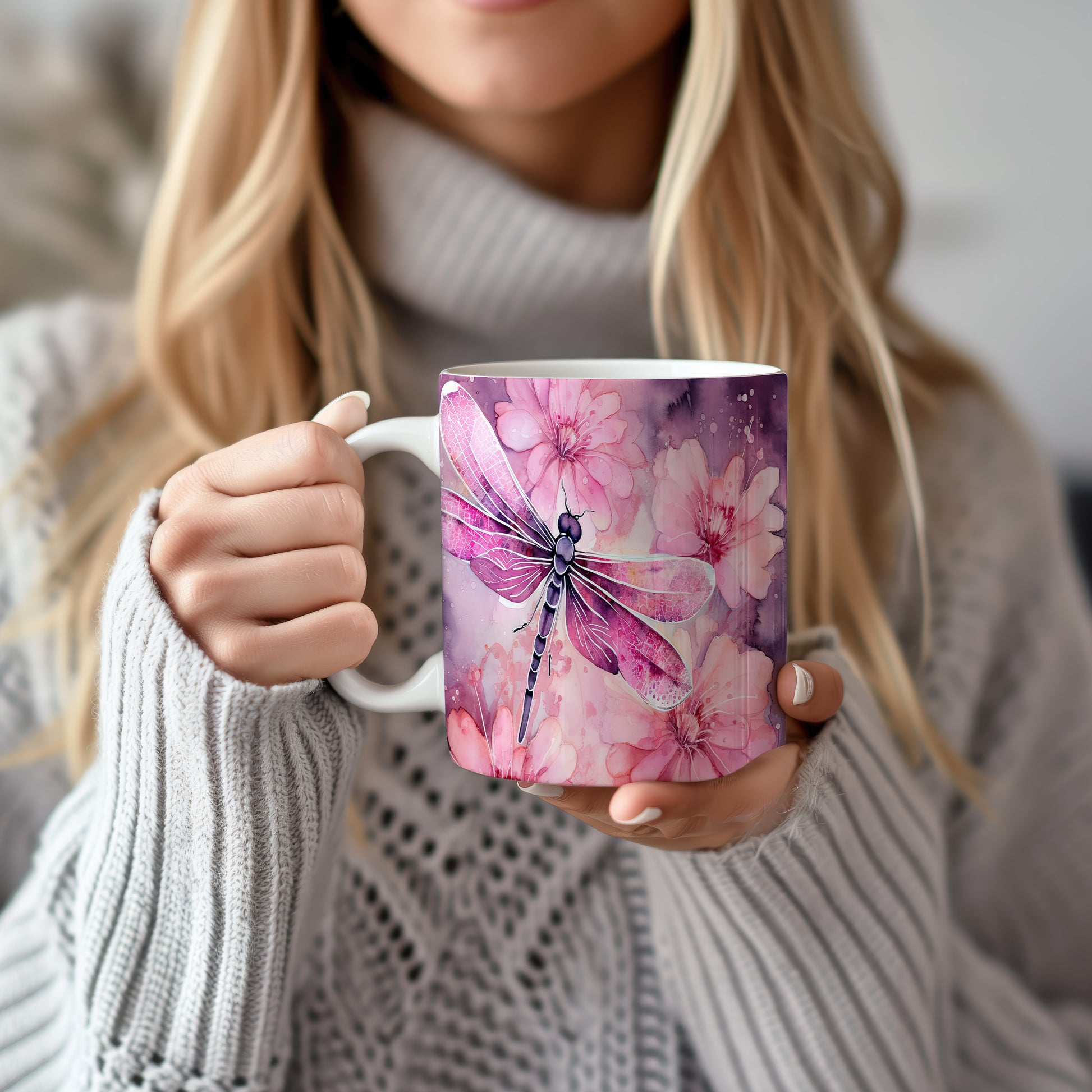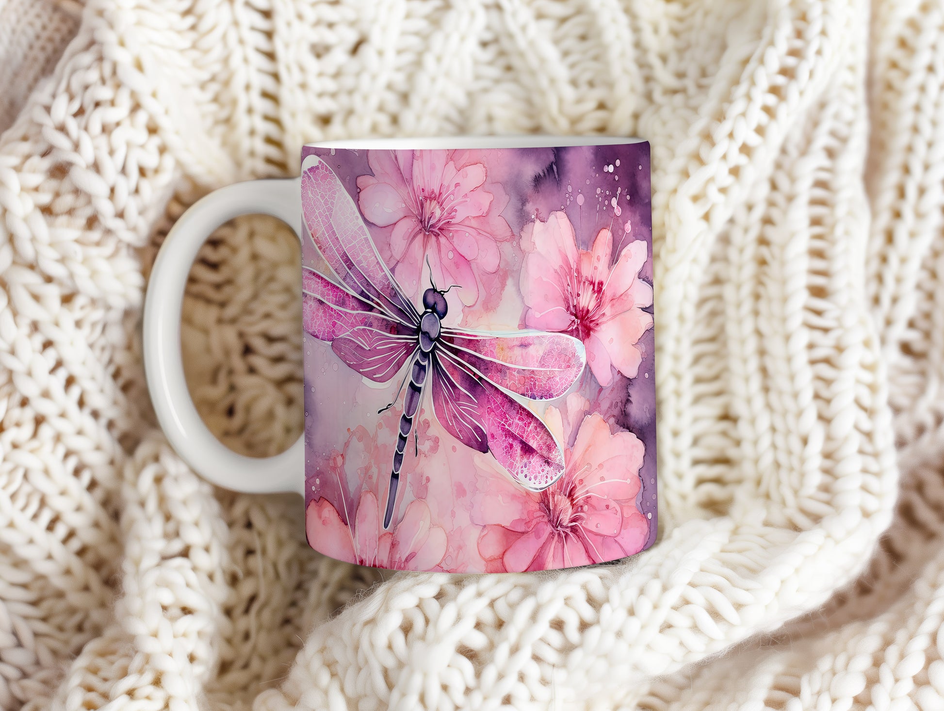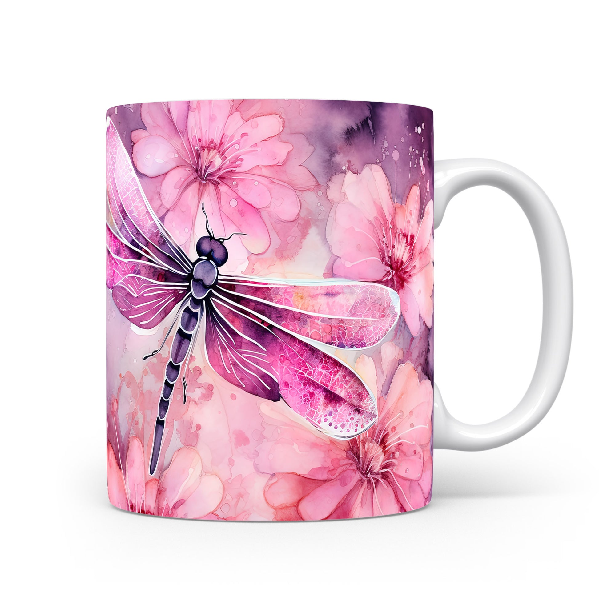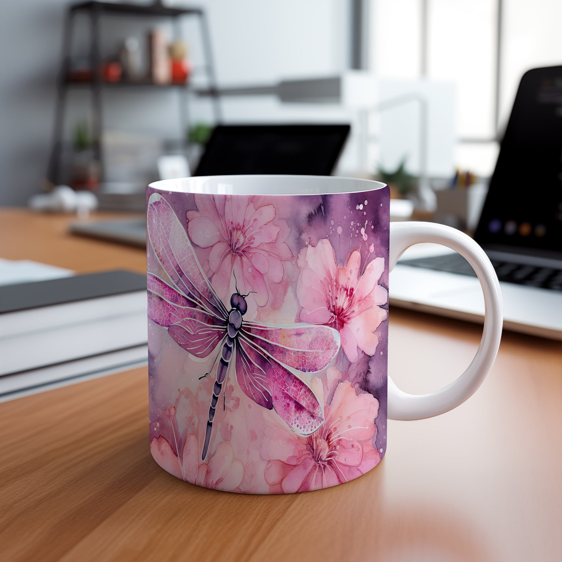 Hrnek s vážkou a květinami – výrazným designem