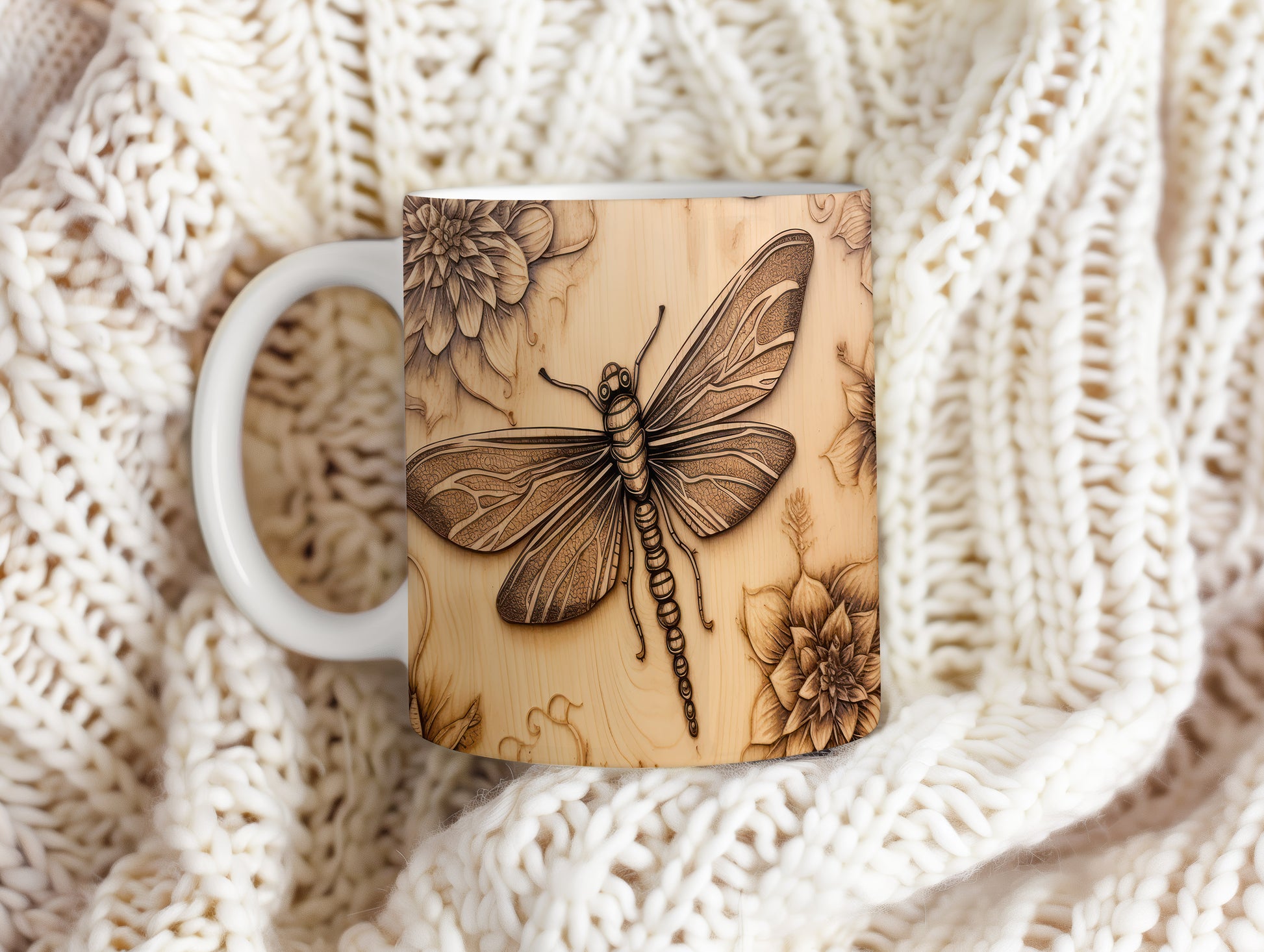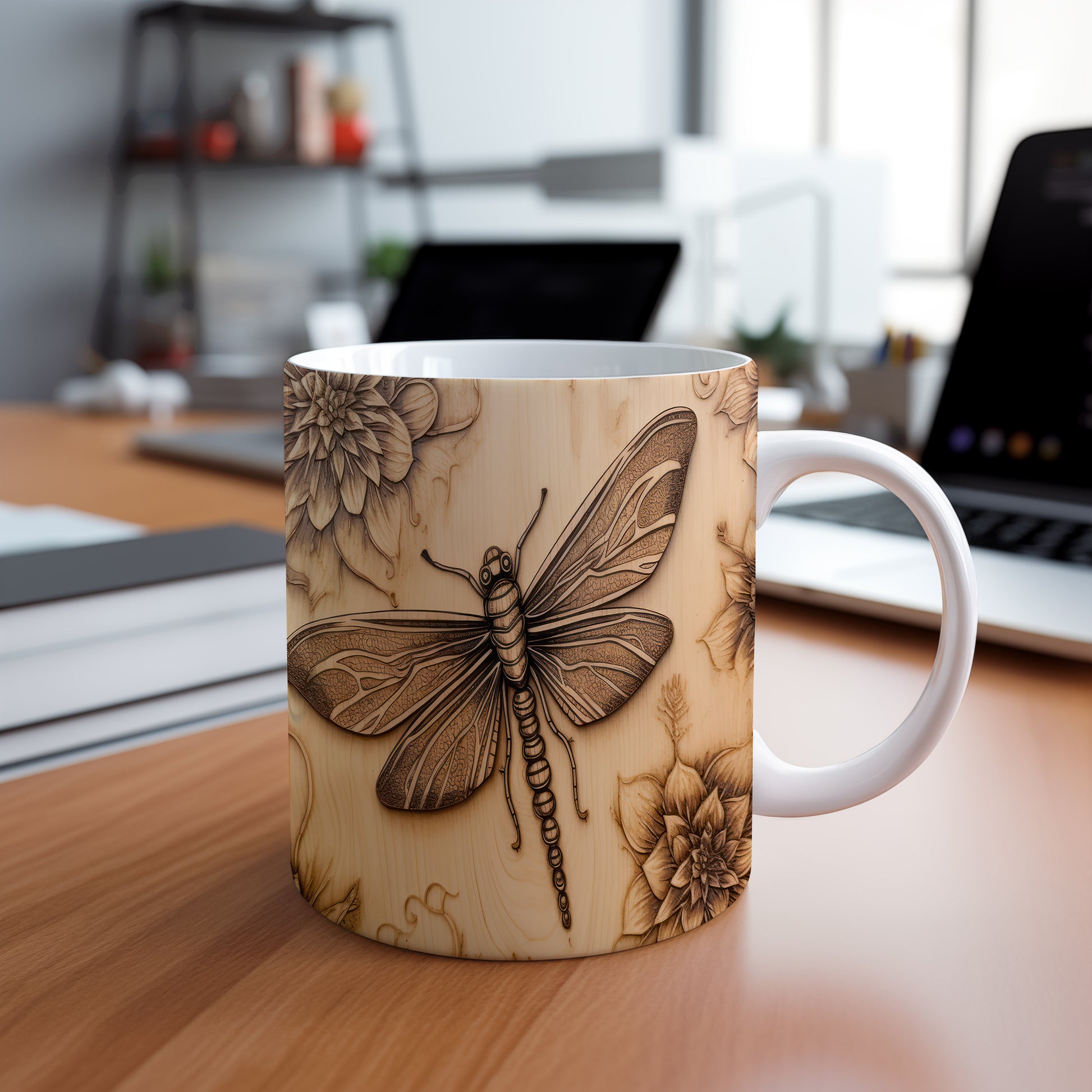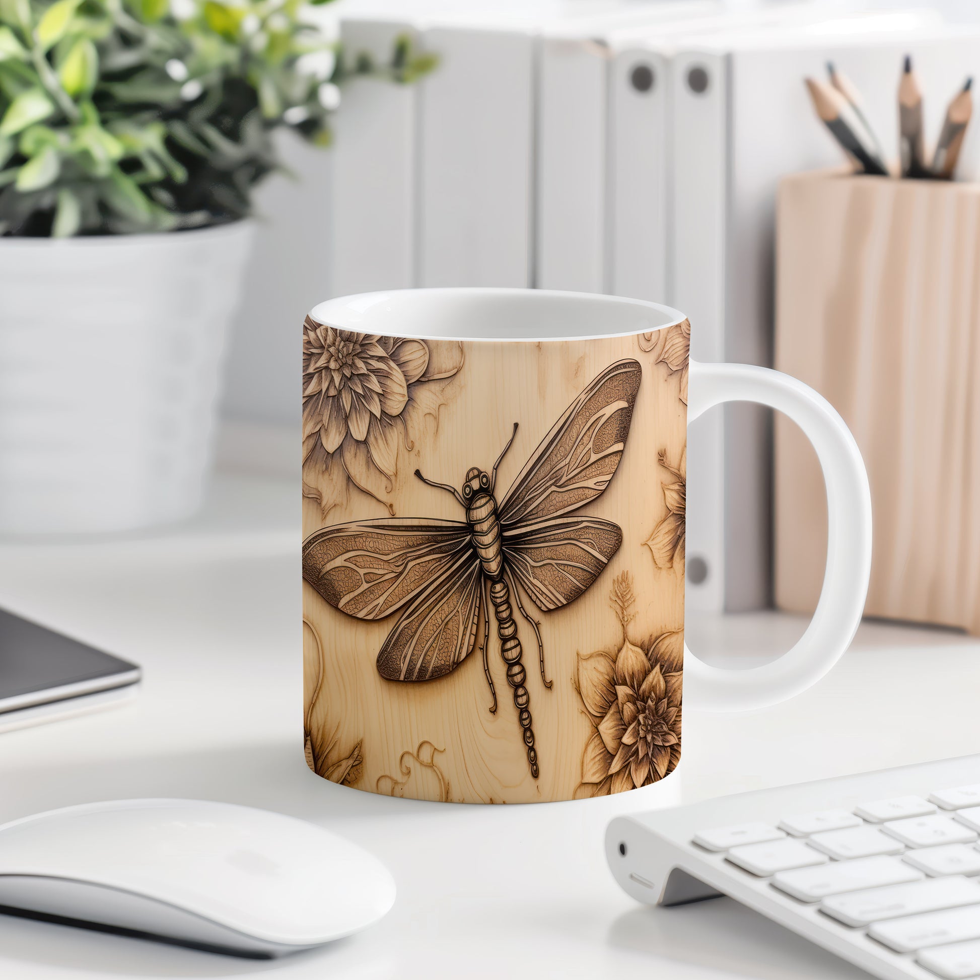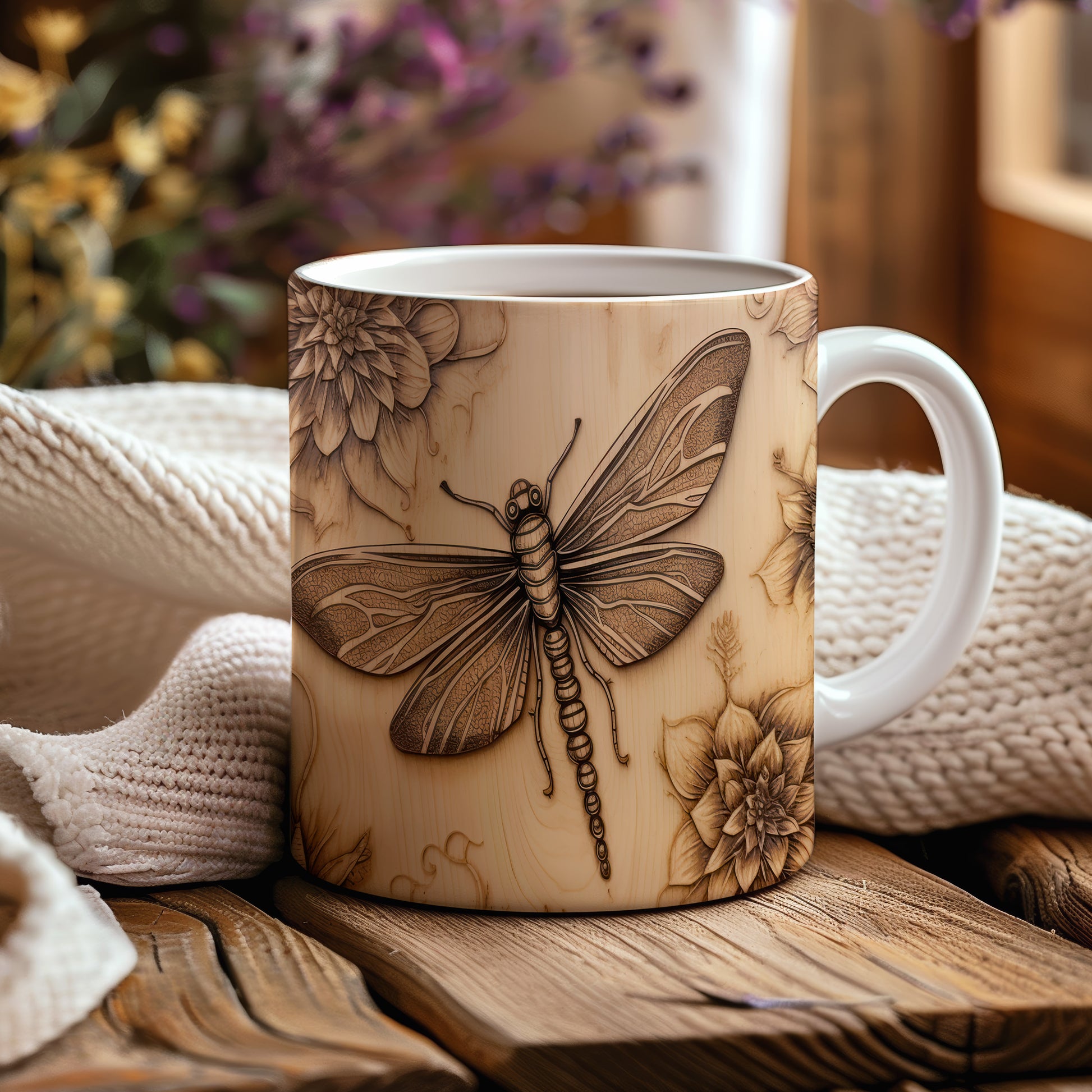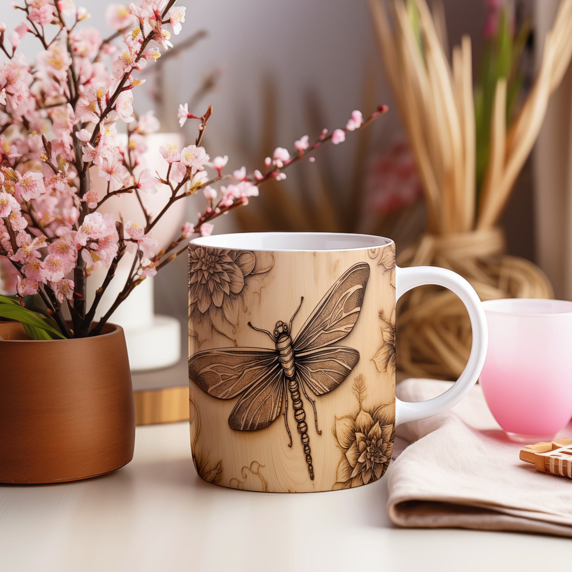 Hrnek s vážkou a květinou