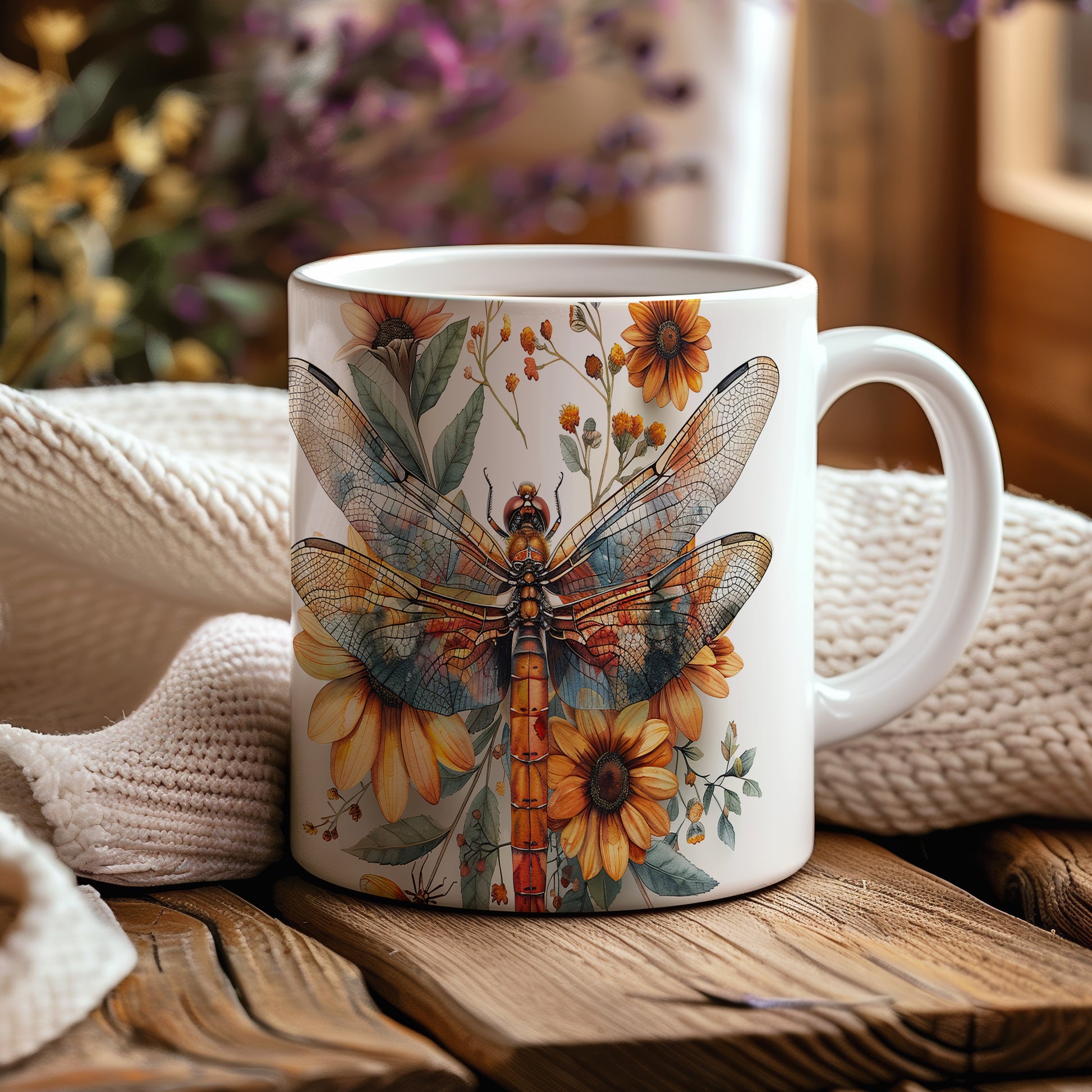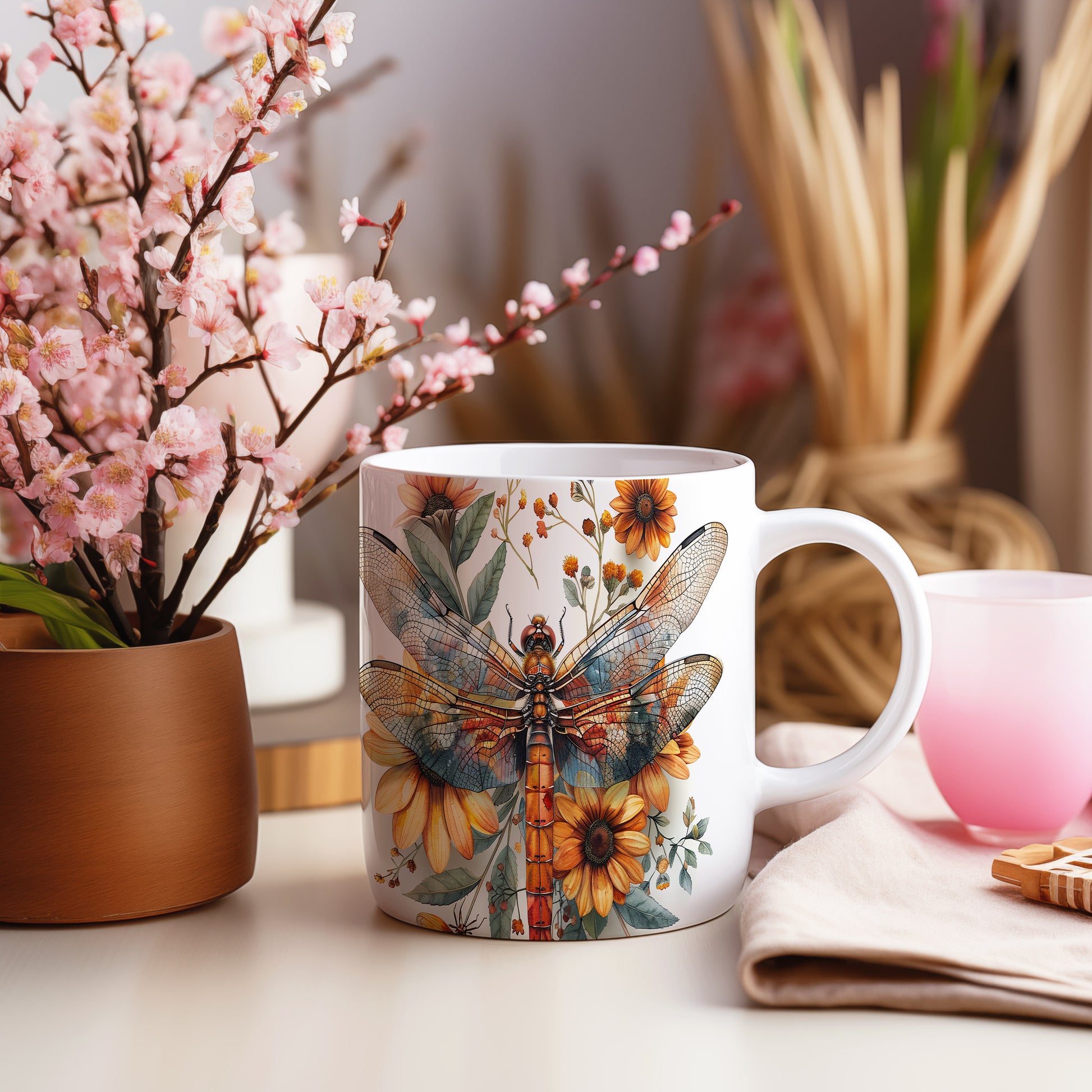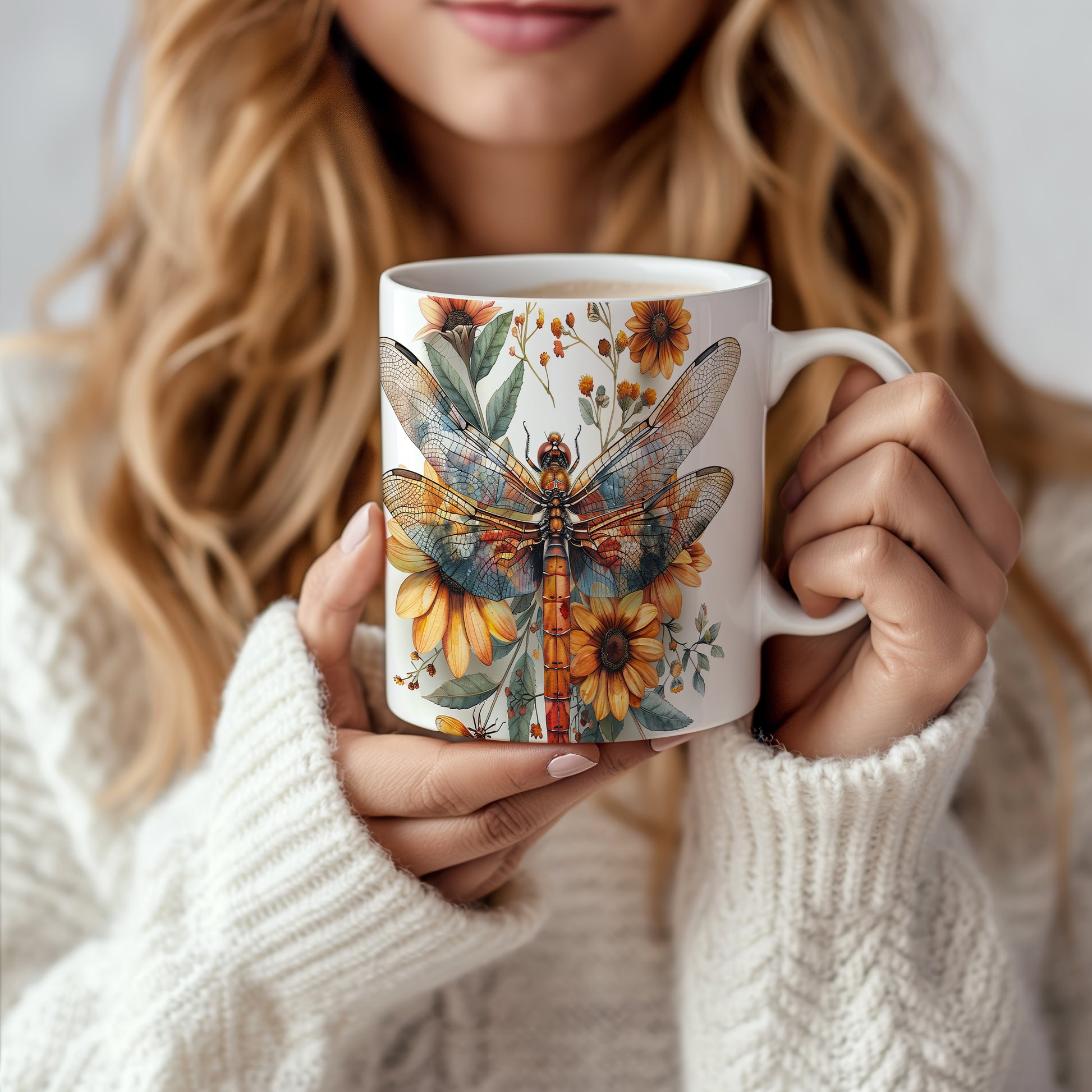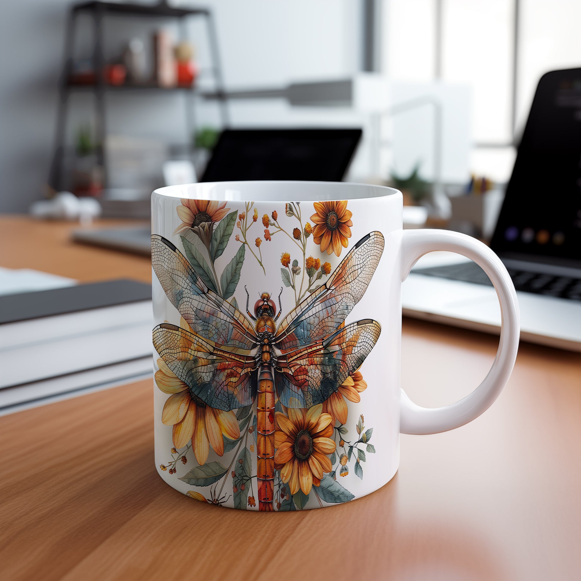 Hrnek s detailní ilustrací vážky obklopené květinami, včetně slunečnic. Tento kousek potěší milovníky přírody a hmyzu, ideální jako dárek pro přátele nebo rodinu. Materiál: keramika. Objem: 330 ml. Vhodné do myčky i mikrovlnky. Používání tohoto hrnku přináší radost z každého doušku.