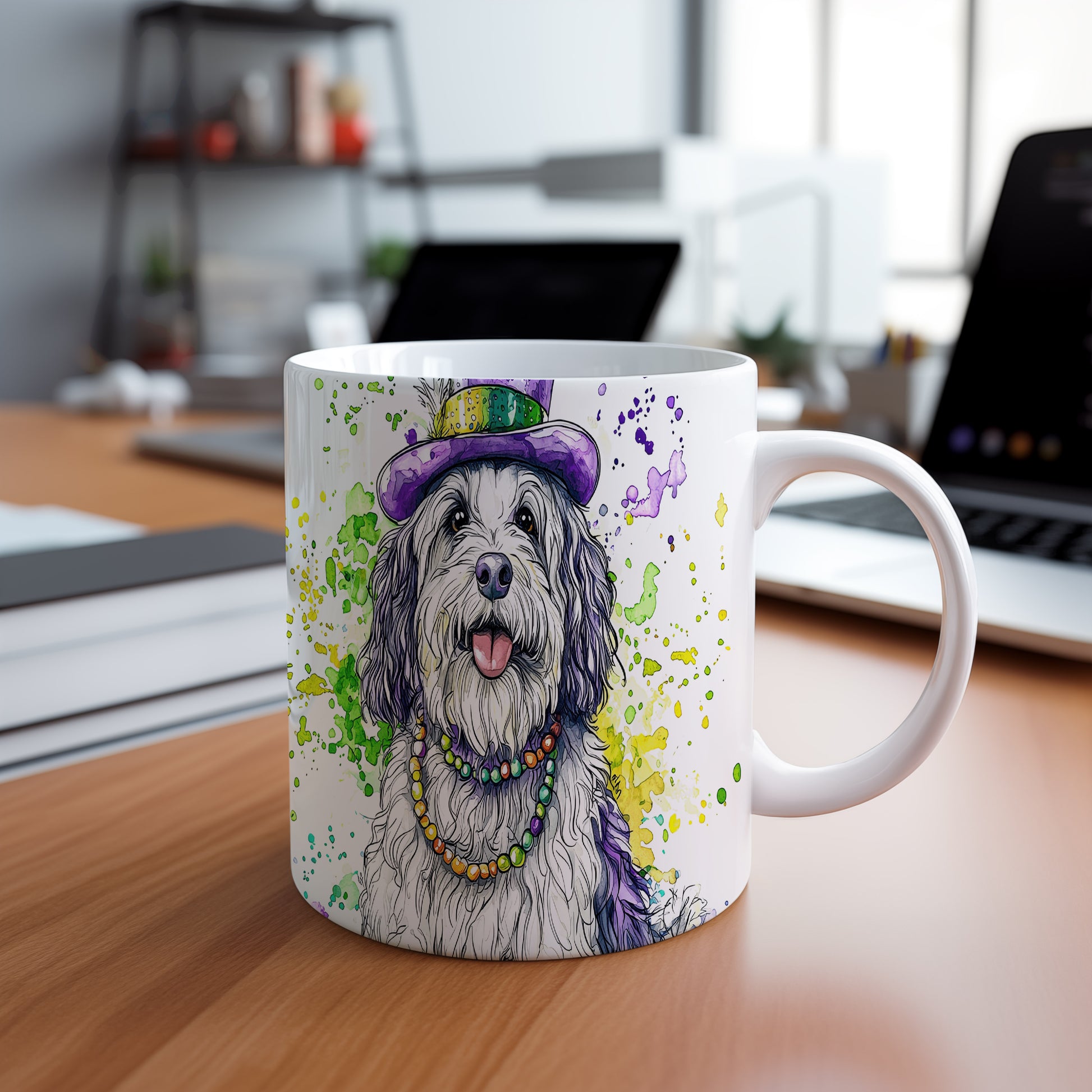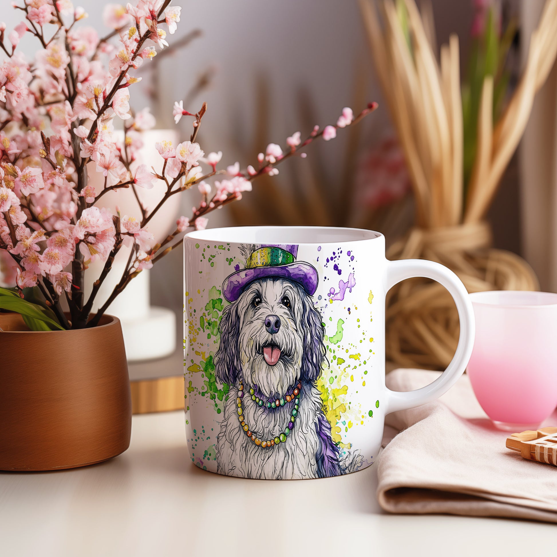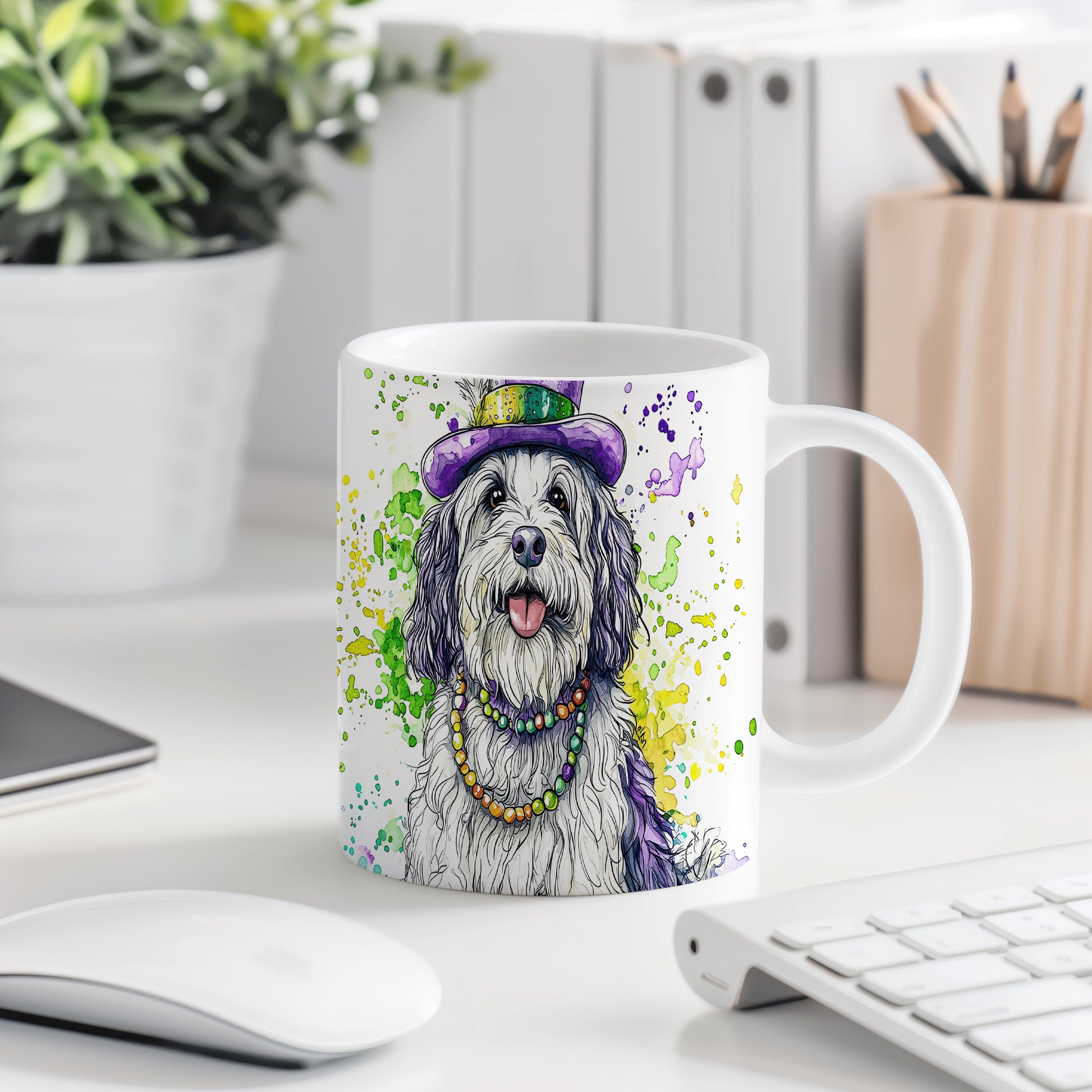 Tento hrnek s ilustrací roztomilého psa v barevném klobouku a náhrdelníku je ideální volbou pro milovníky psů a domácí pohody. Skvěle se hodí jako dárek pro přátele nebo rodinu, kteří ocení originální design. Materiál: keramika. Objem: 330 ml. Vhodné do myčky i mikrovlnky. Používání tohoto hrnku přináší radost a útulnost do každého dne.