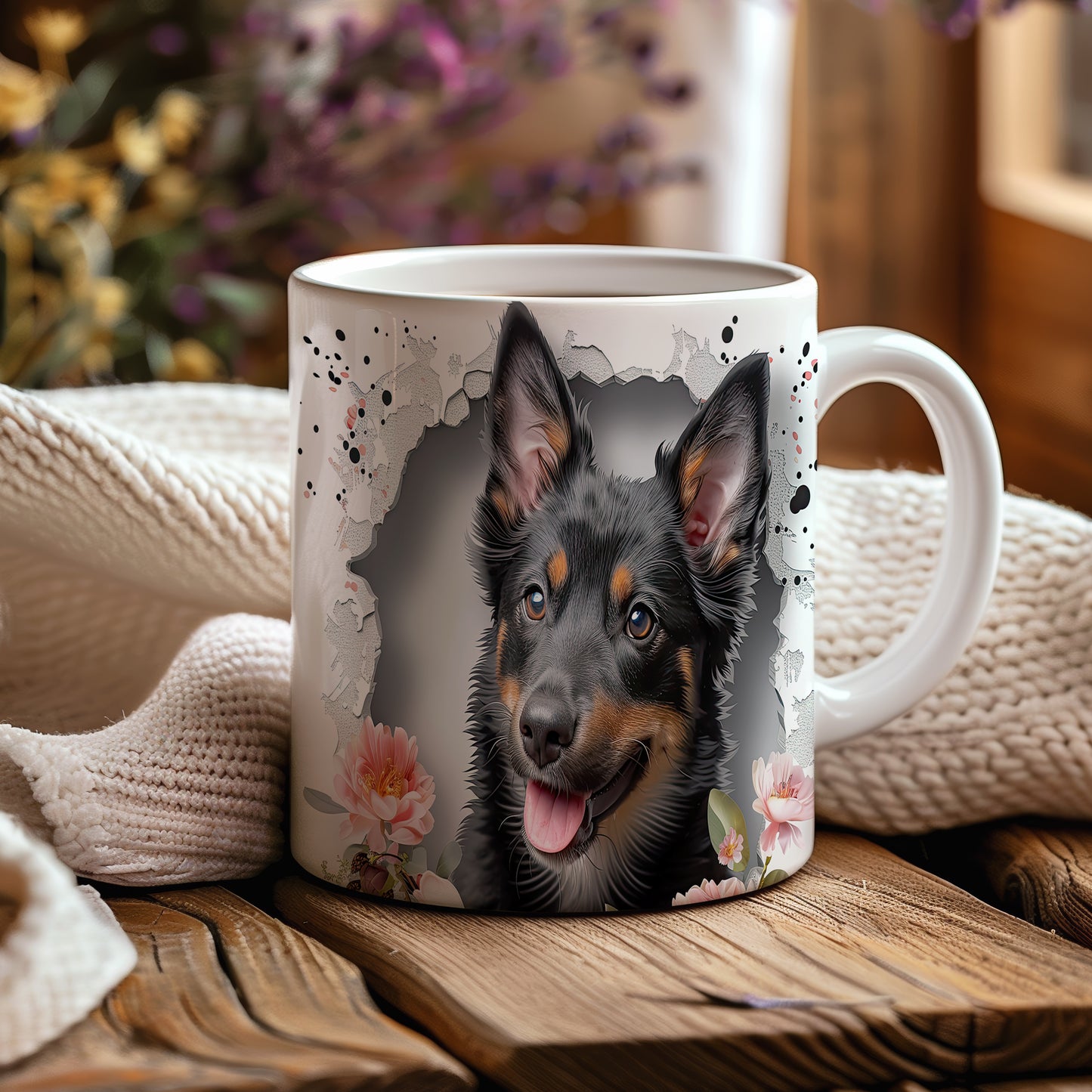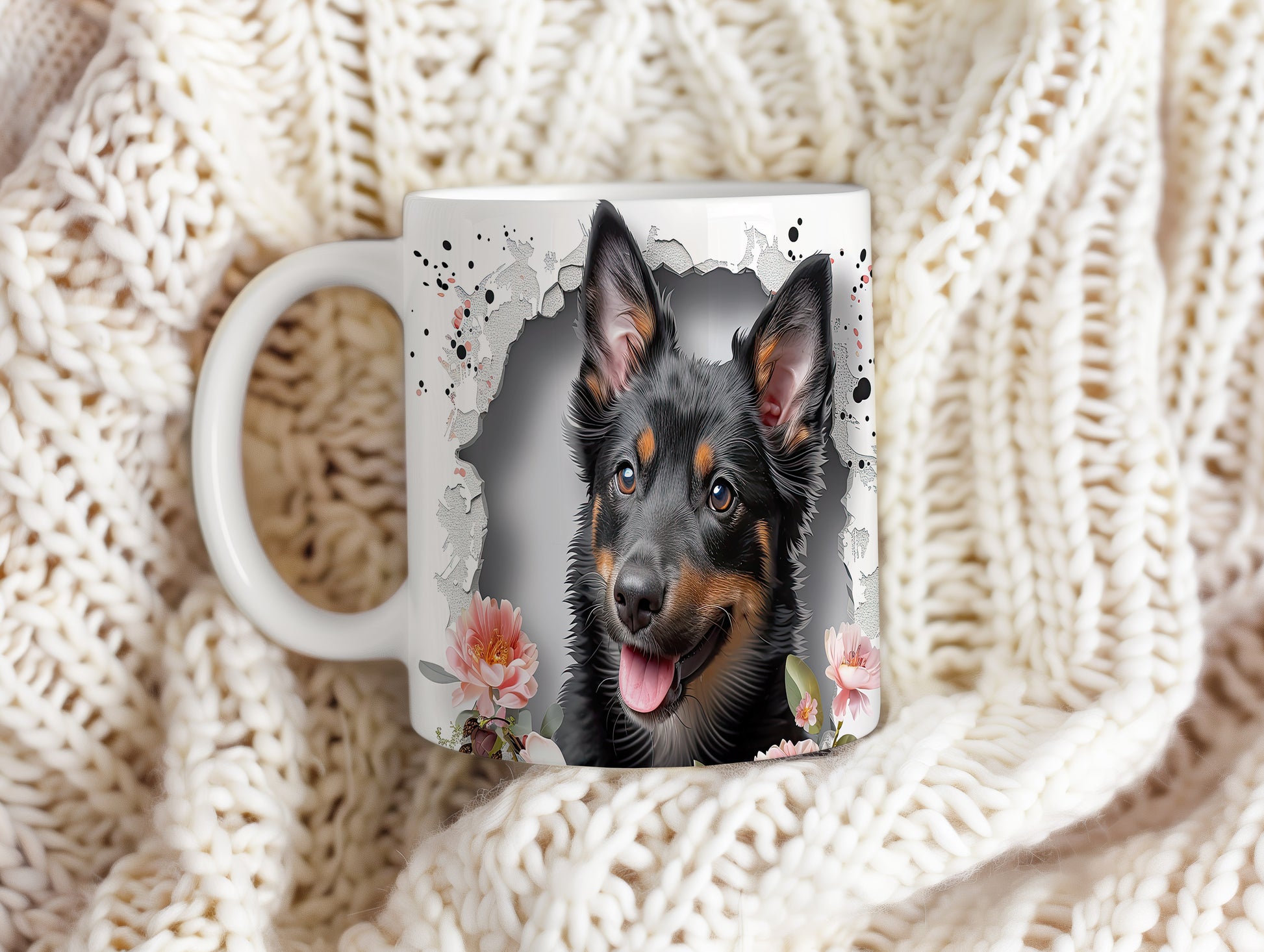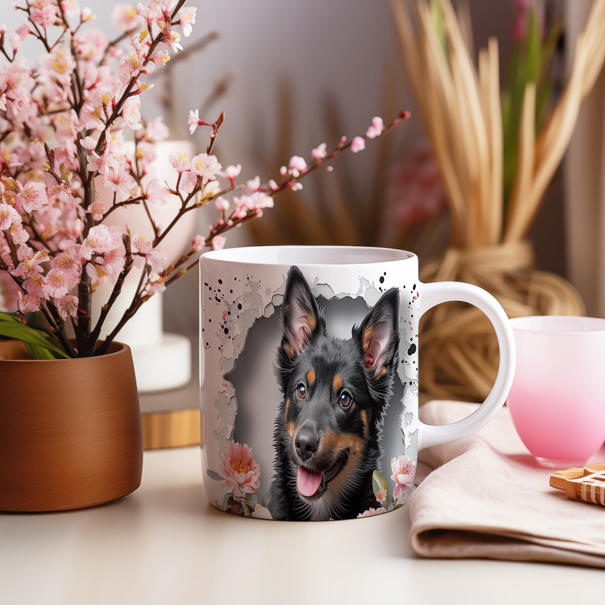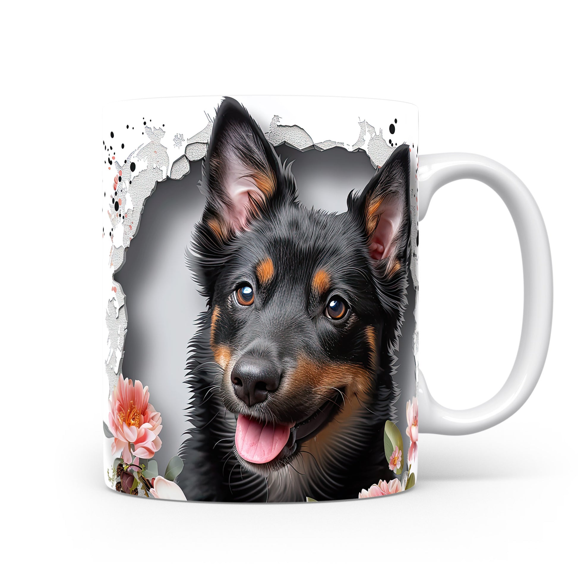 Hrnek s veselým ovčákem a květinami