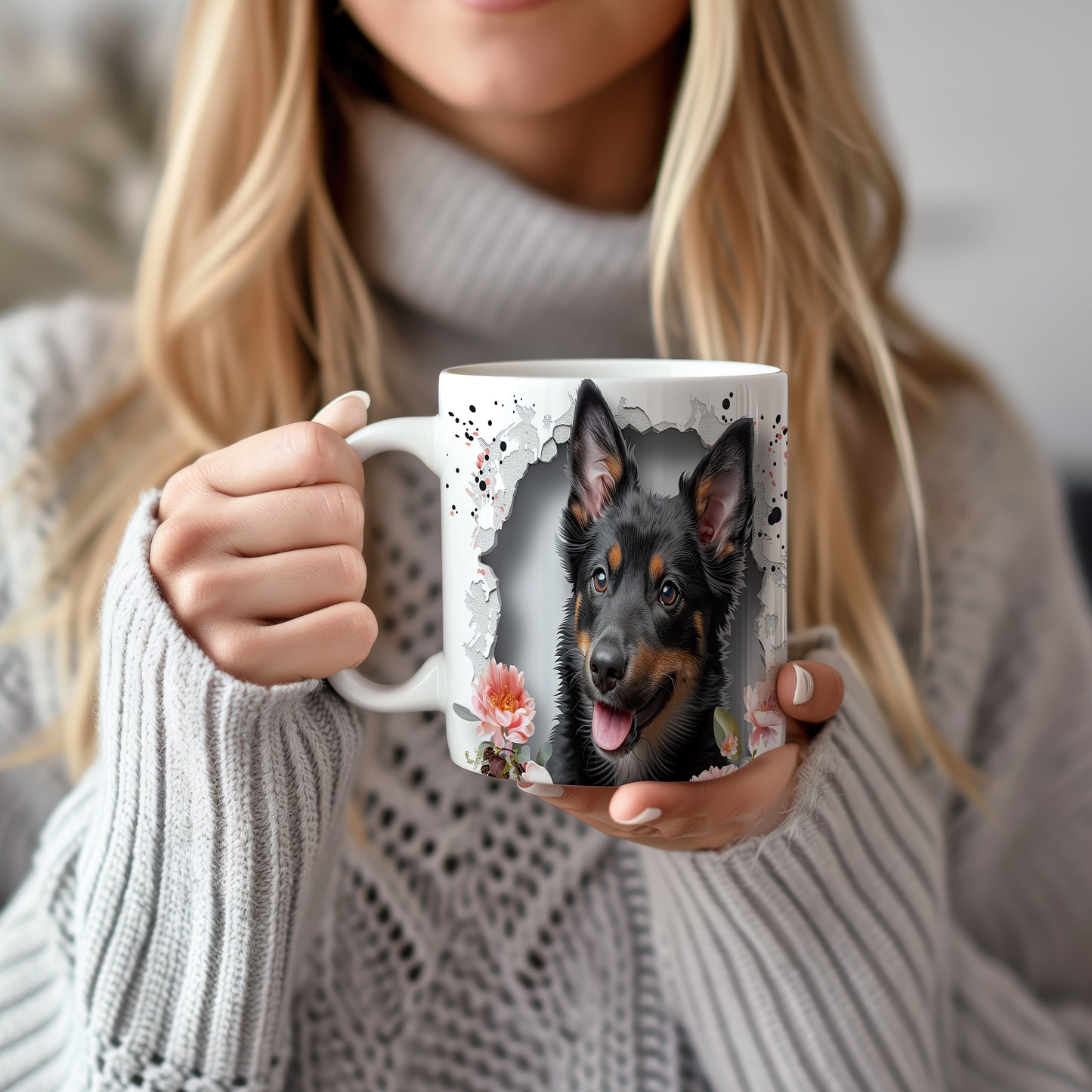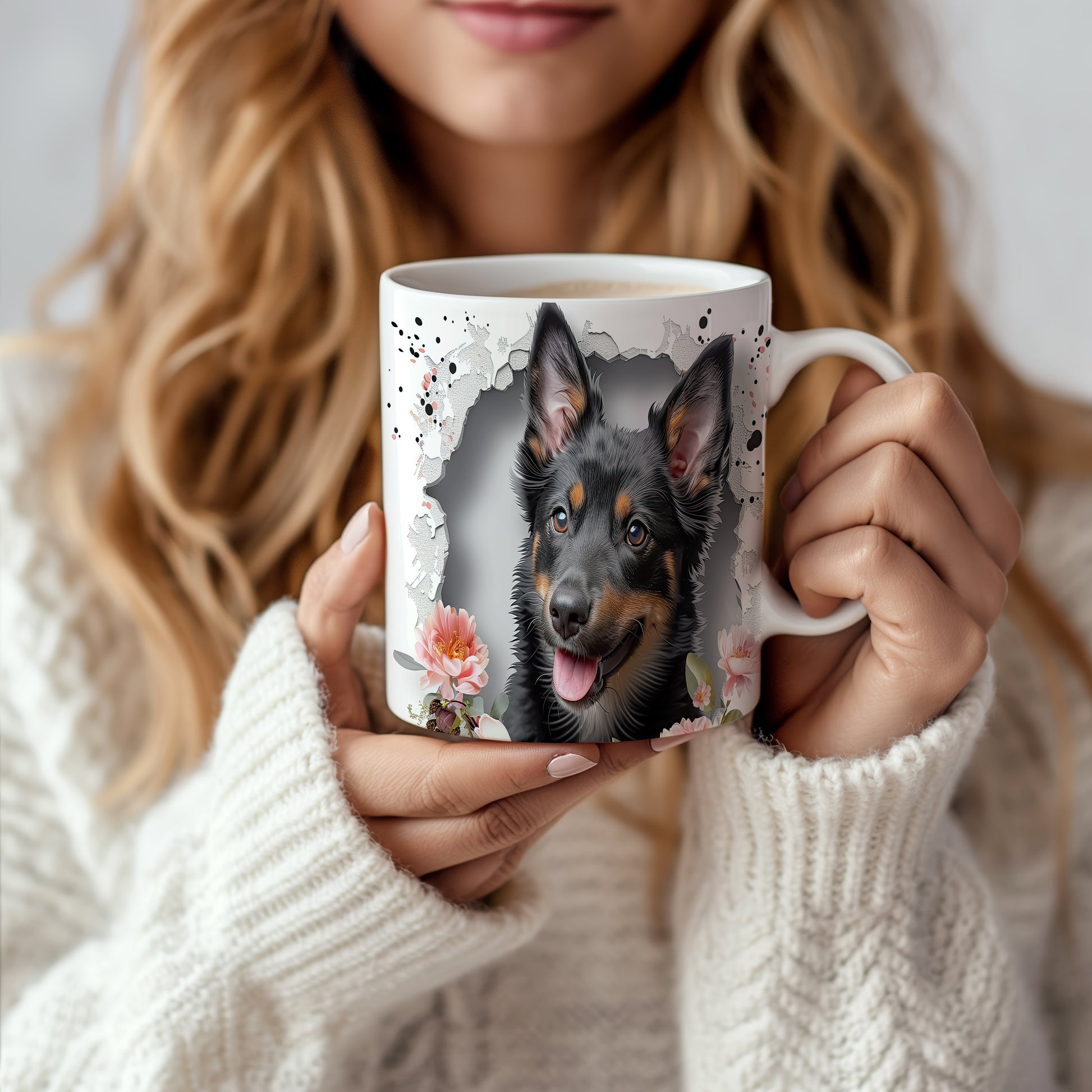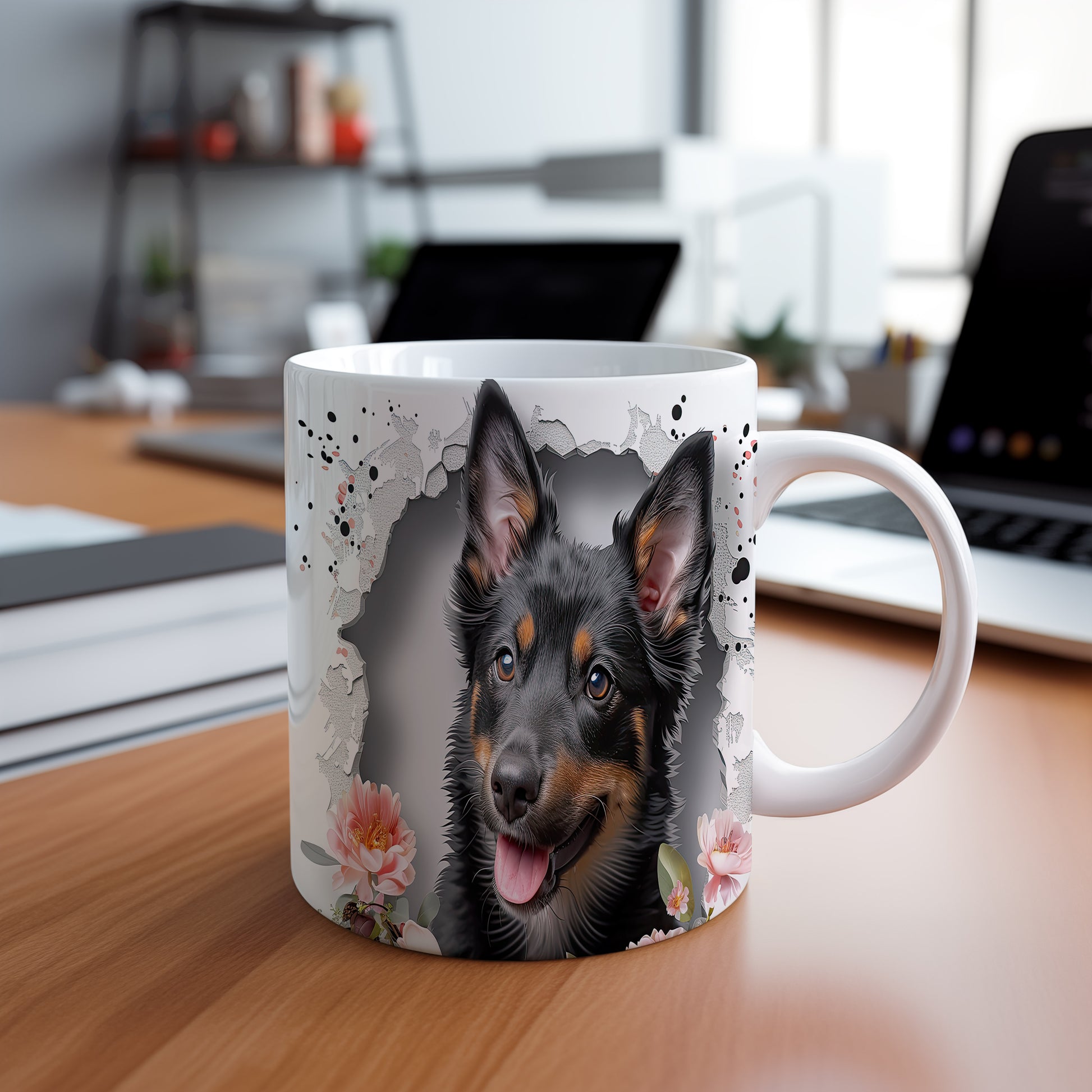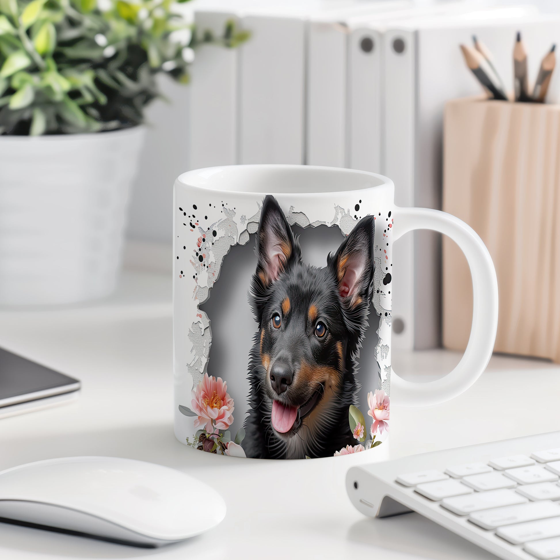 Hrnek s veselým ovčákem a květinami