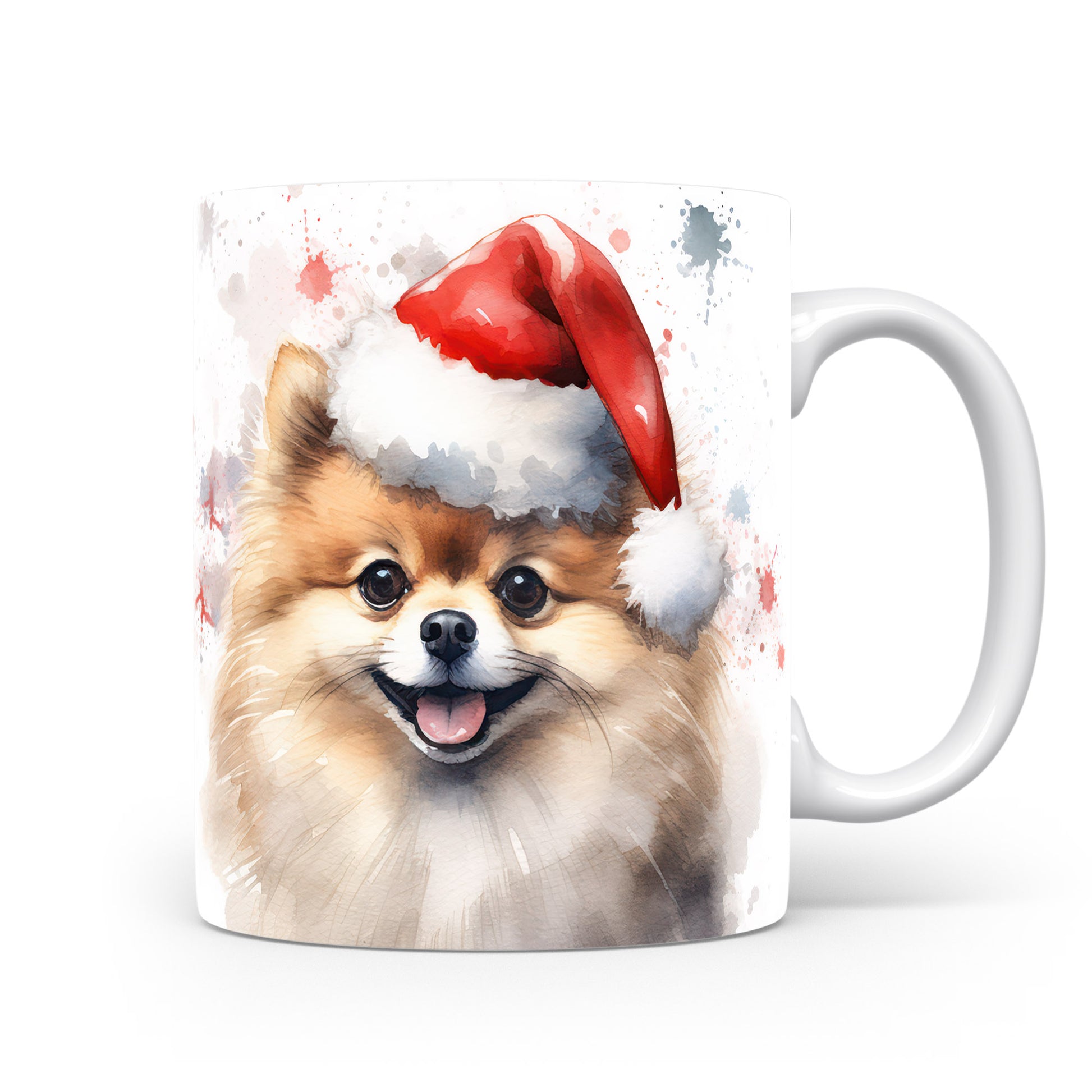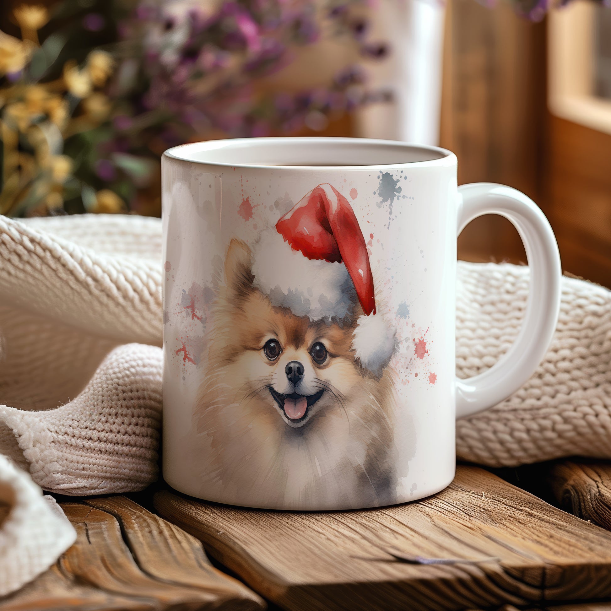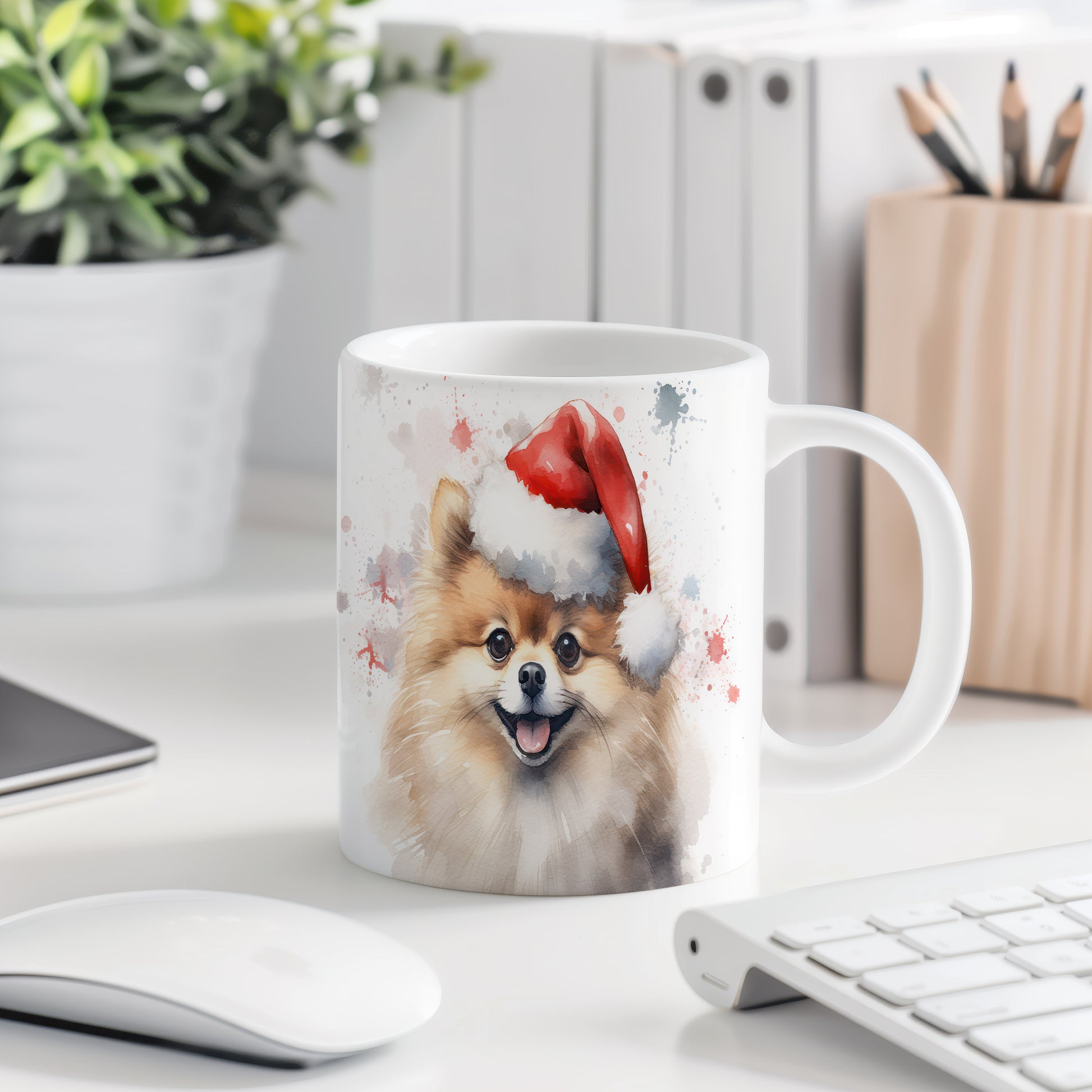 Hrnek s veselým pomeranianem v červené vánoční čepici