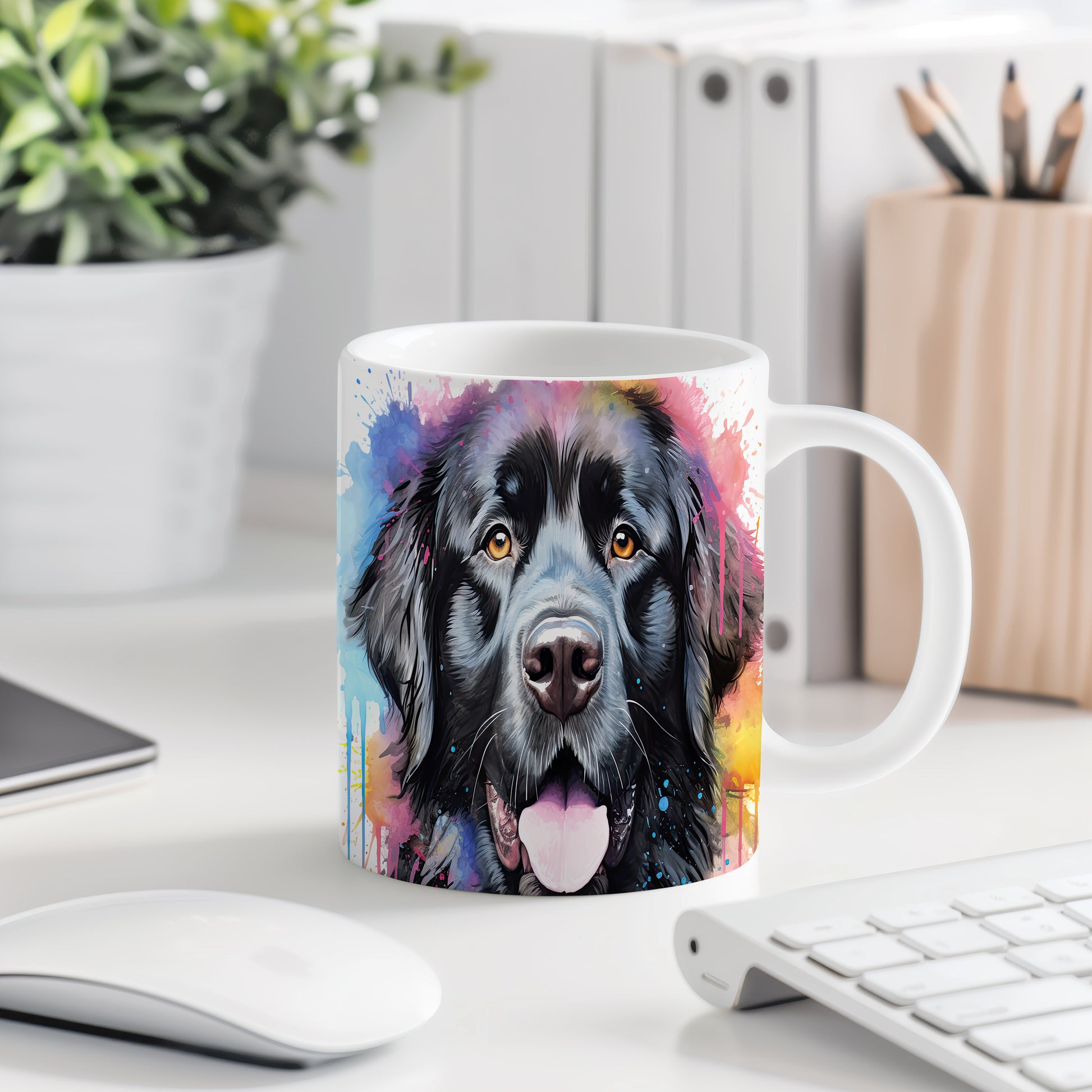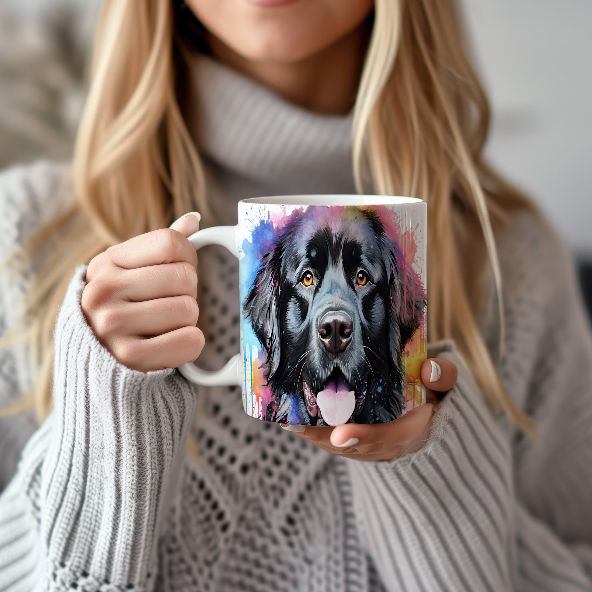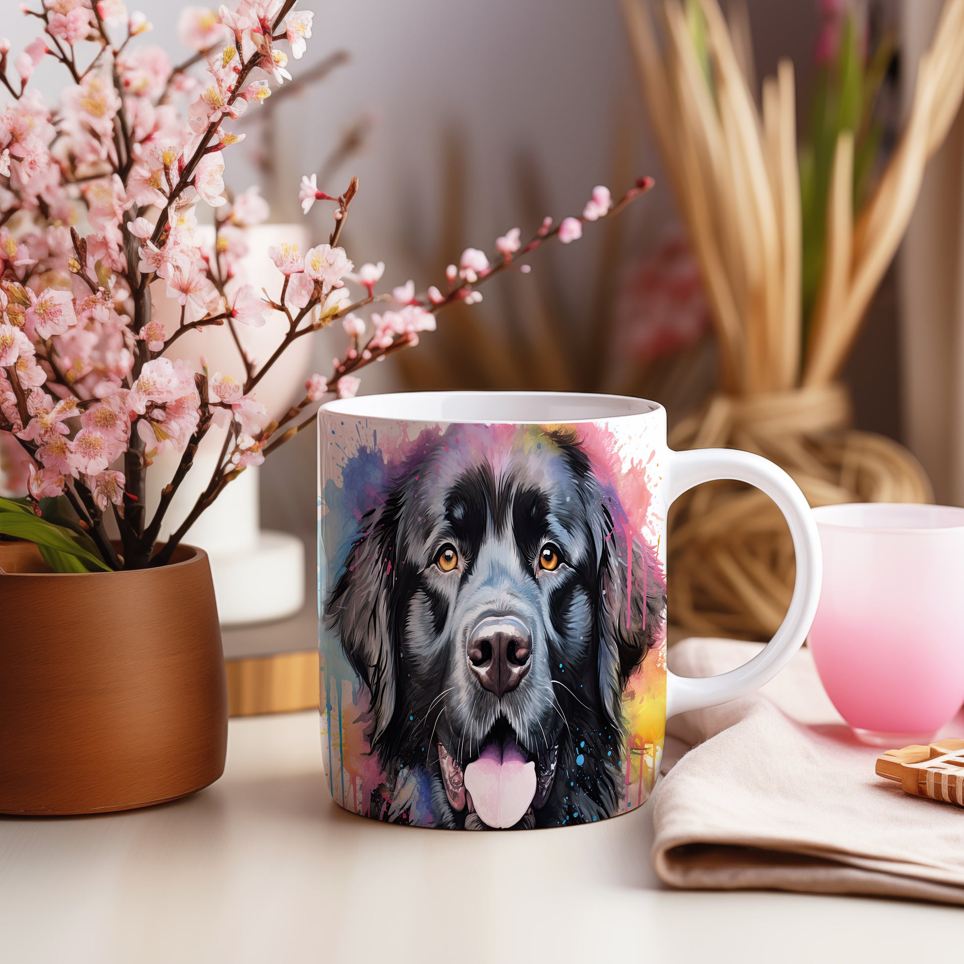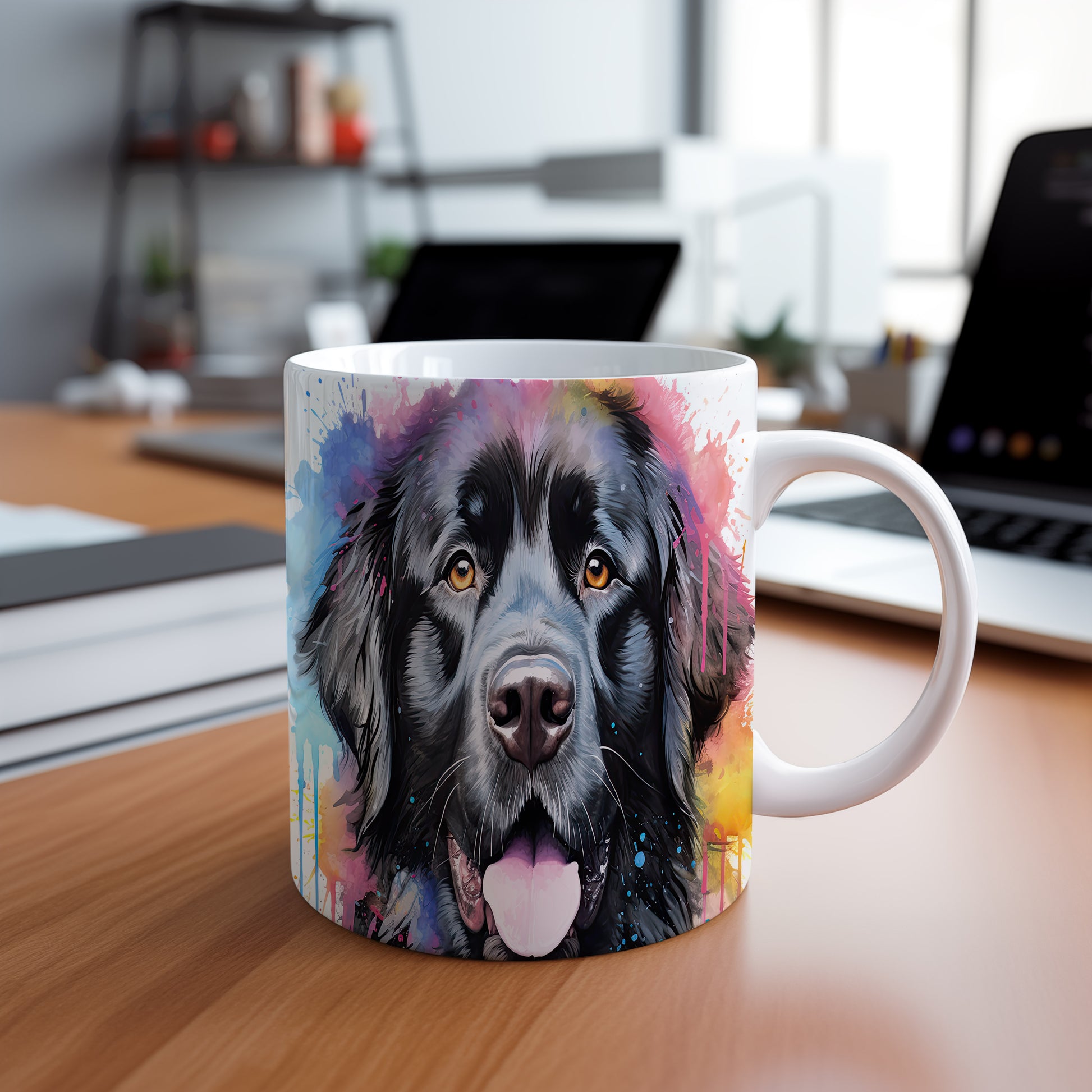 Hrnek s veselým portrétem černého psa v digitálním stylu