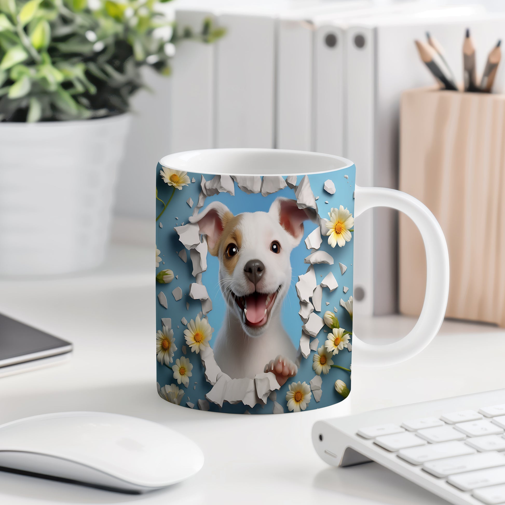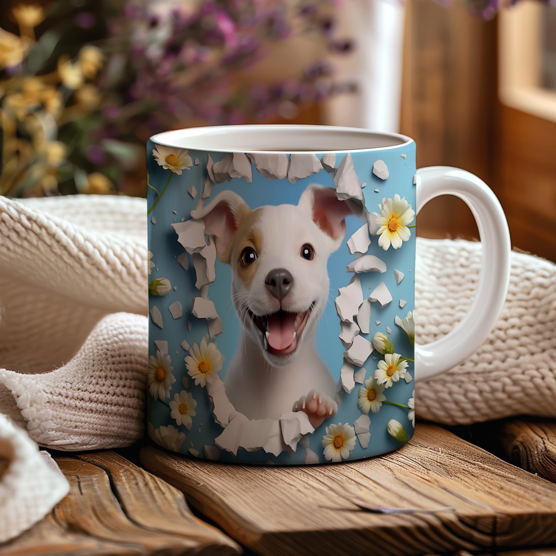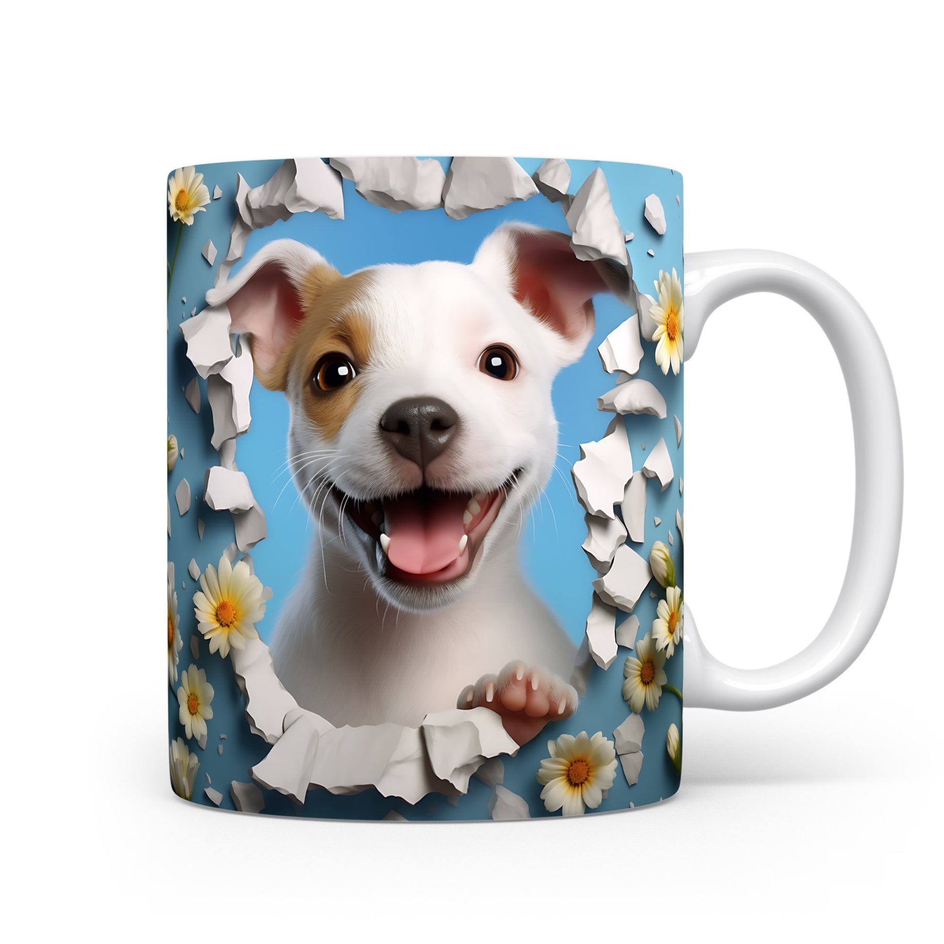 Na hrnku je veselý psík s úsměvem a vystrčenou tlapkou, obklopený květinami na modrém pozadí. Tento hrnek je ideální pro milovníky zvířat a skvělý tip na dárek pro každého, kdo si rád vychutná kávu nebo čaj. Materiál: keramika. Objem: 330 ml. Vhodné do myčky i mikrovlnky. Používání tohoto hrnku přináší radost a pozitivní energii do každého dne.
