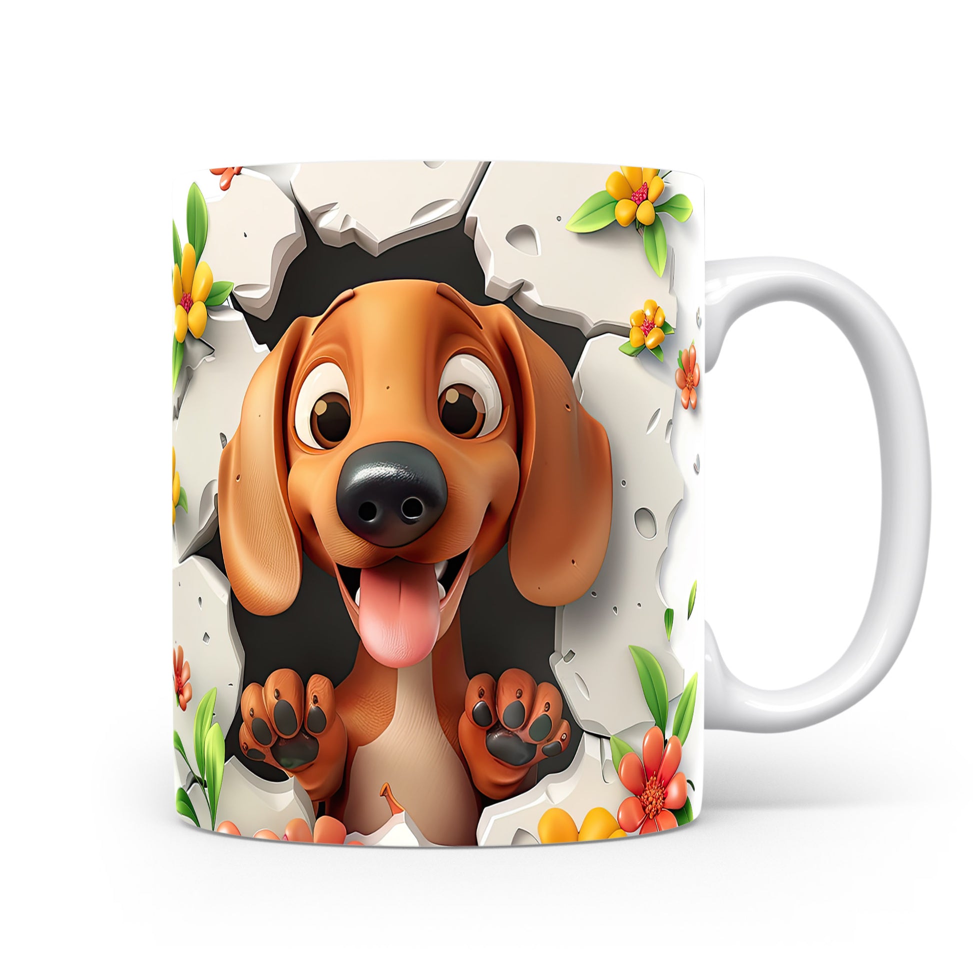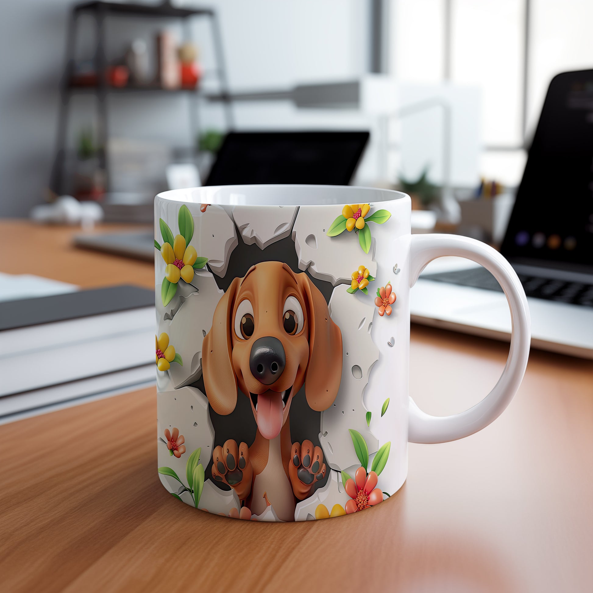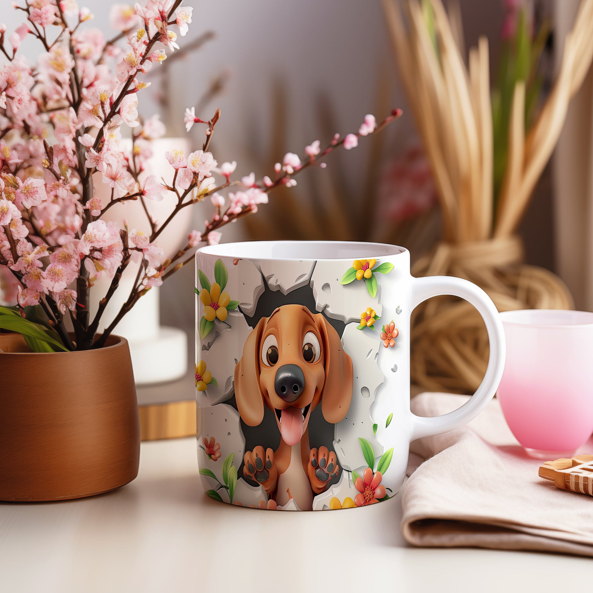 Hrnek s veselým pejskem a květinami - 3D