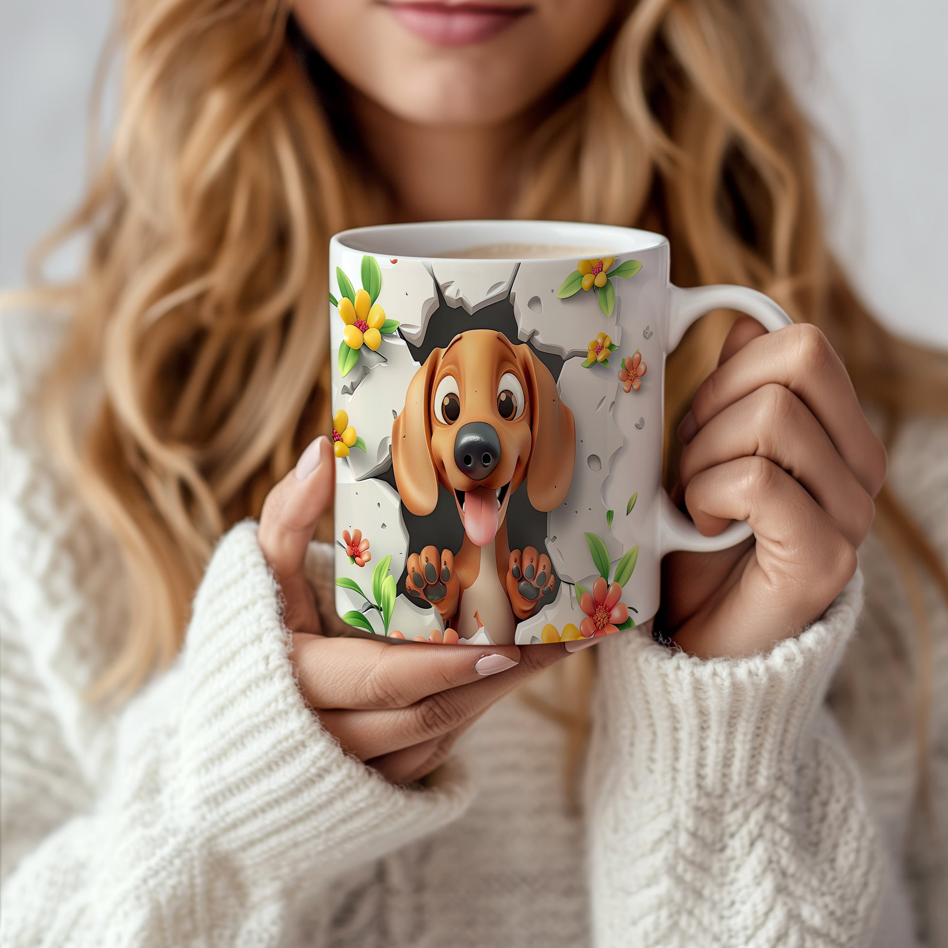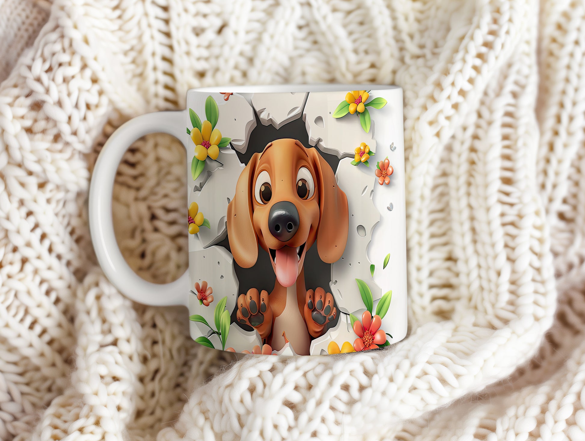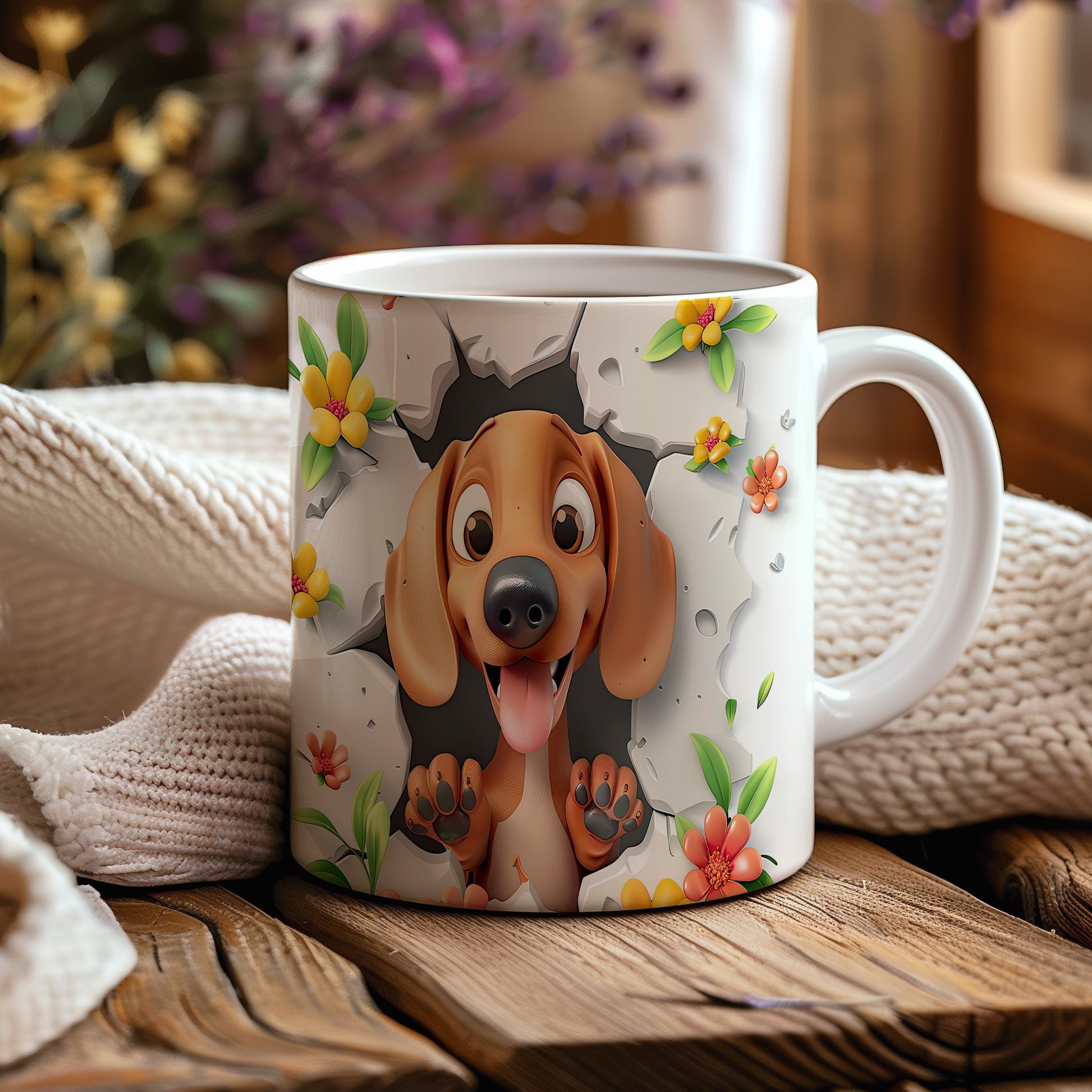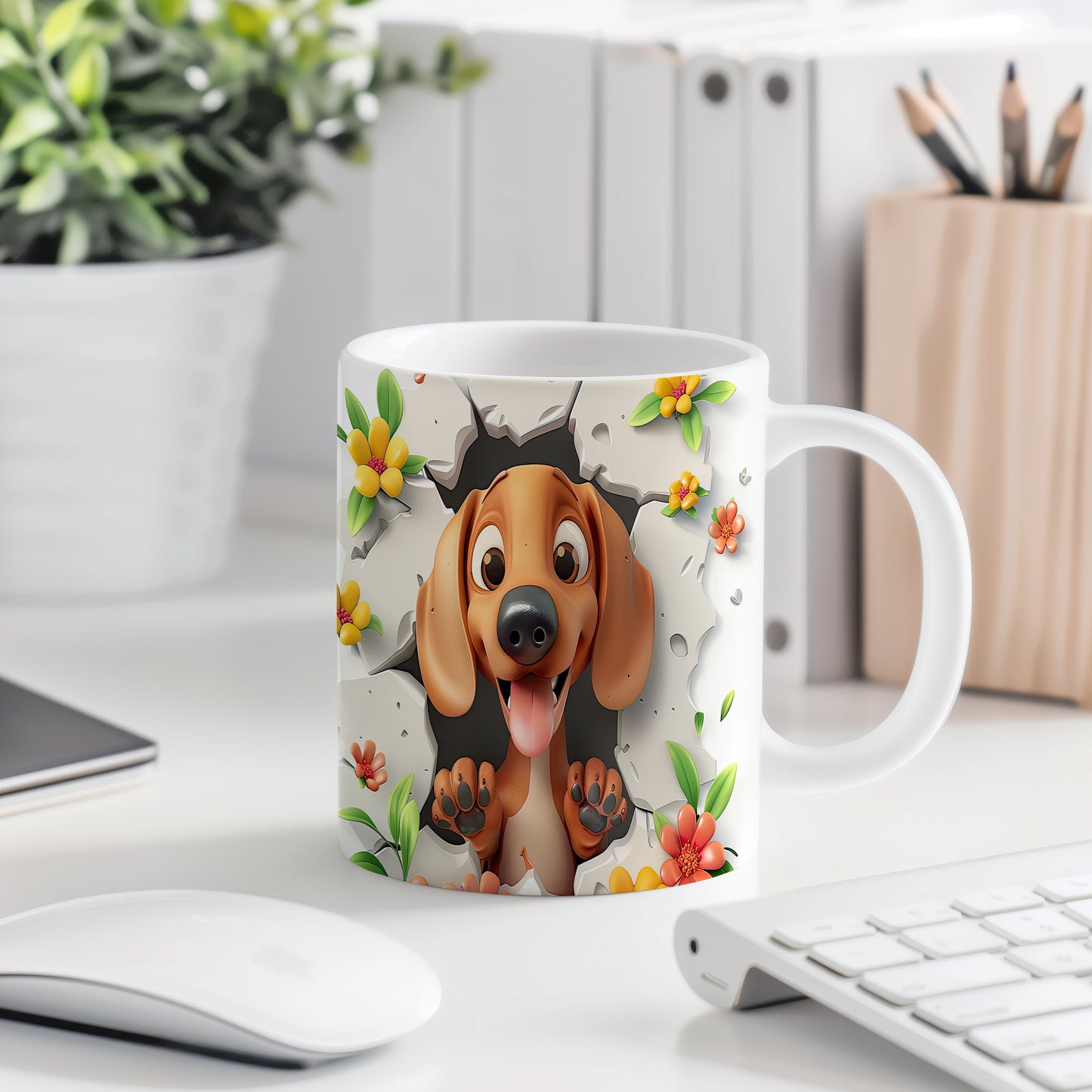 Hrnek s veselým pejskem a květinami - 3D