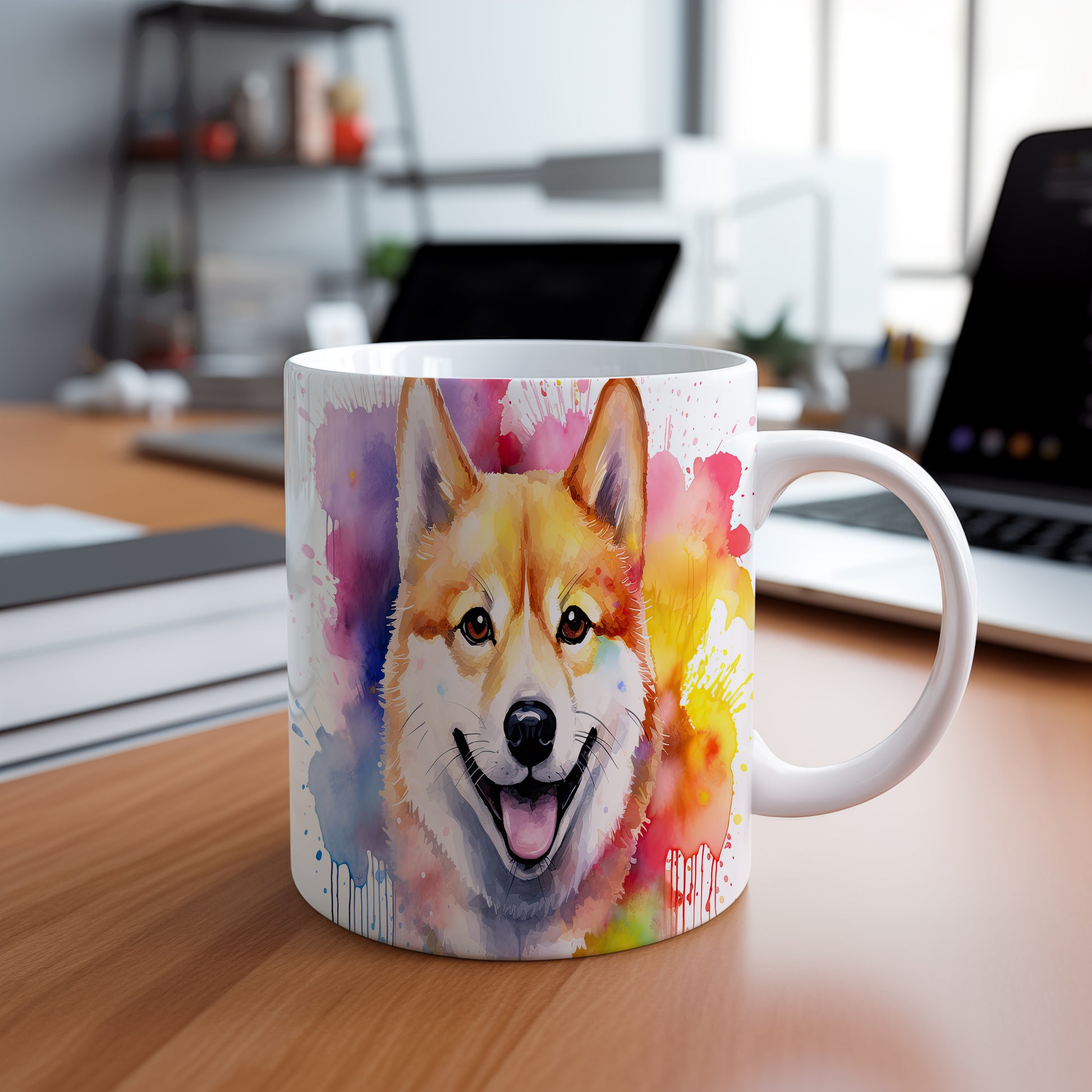 Hrnek s veselým shibainu a duhovým pozadím
