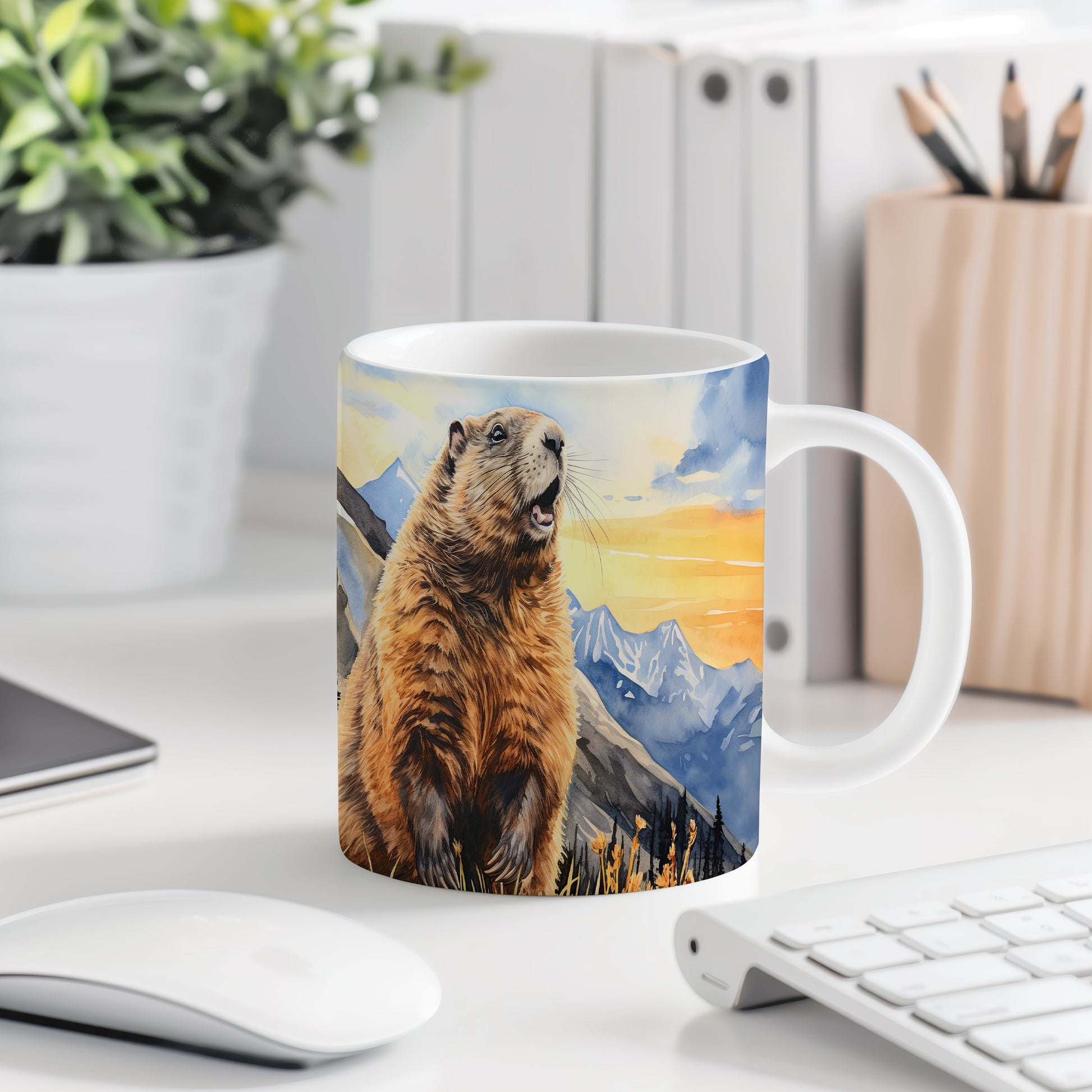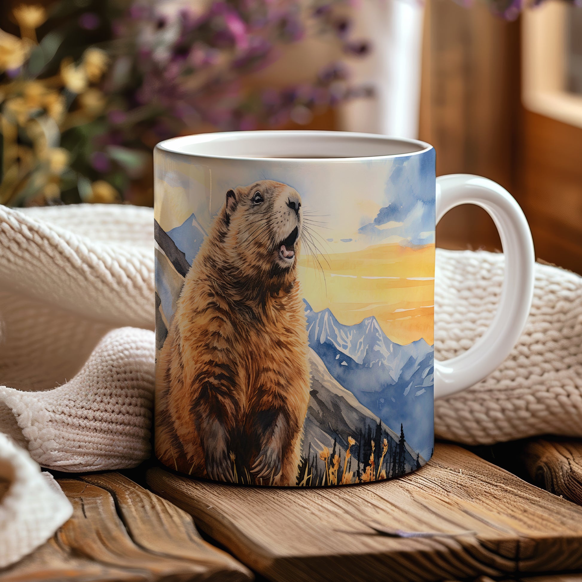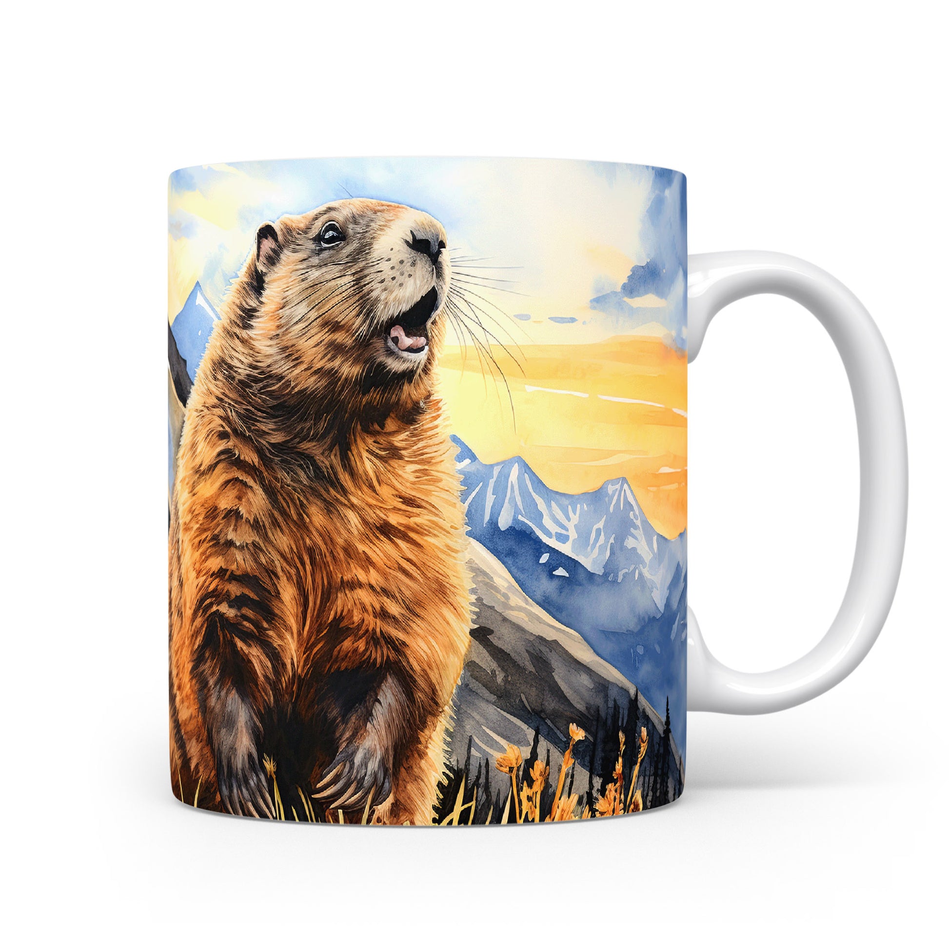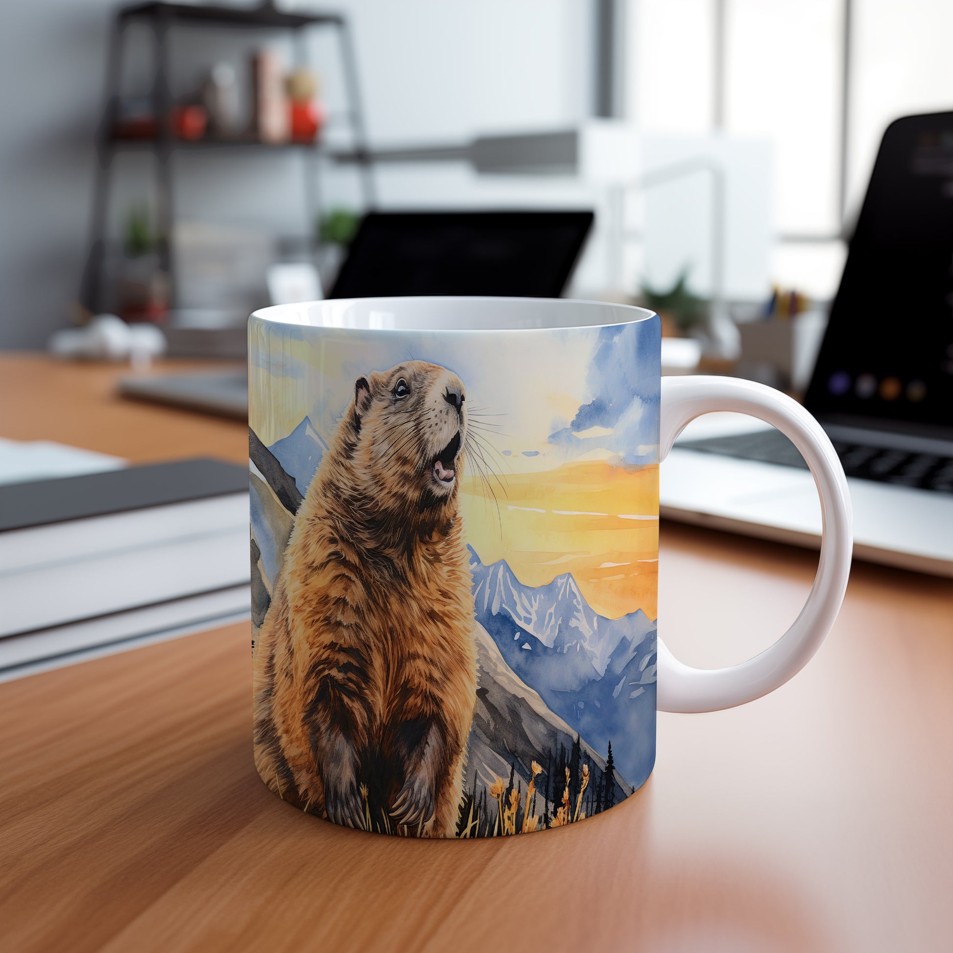 Tento originální hrnek zobrazuje veselého sviště na pozadí horské scenérie při západu slunce. Je ideální pro milovníky přírody a skvělým dárkem pro každého, kdo si rád vychutná ranní kávu nebo čaj. Materiál: keramika. Objem: 330 ml. Vhodné do myčky i mikrovlnky. Díky svému designu přináší radost do každého dne.