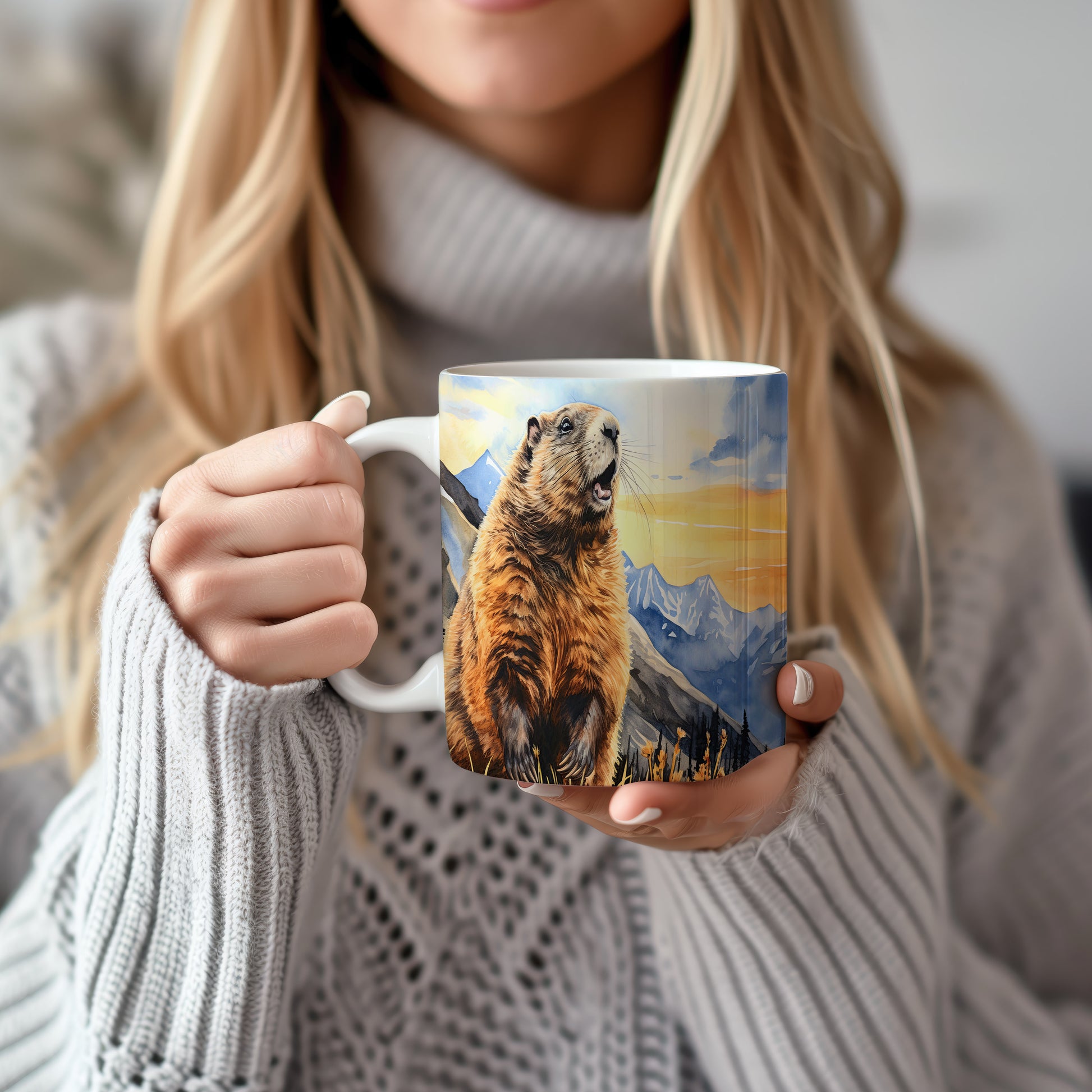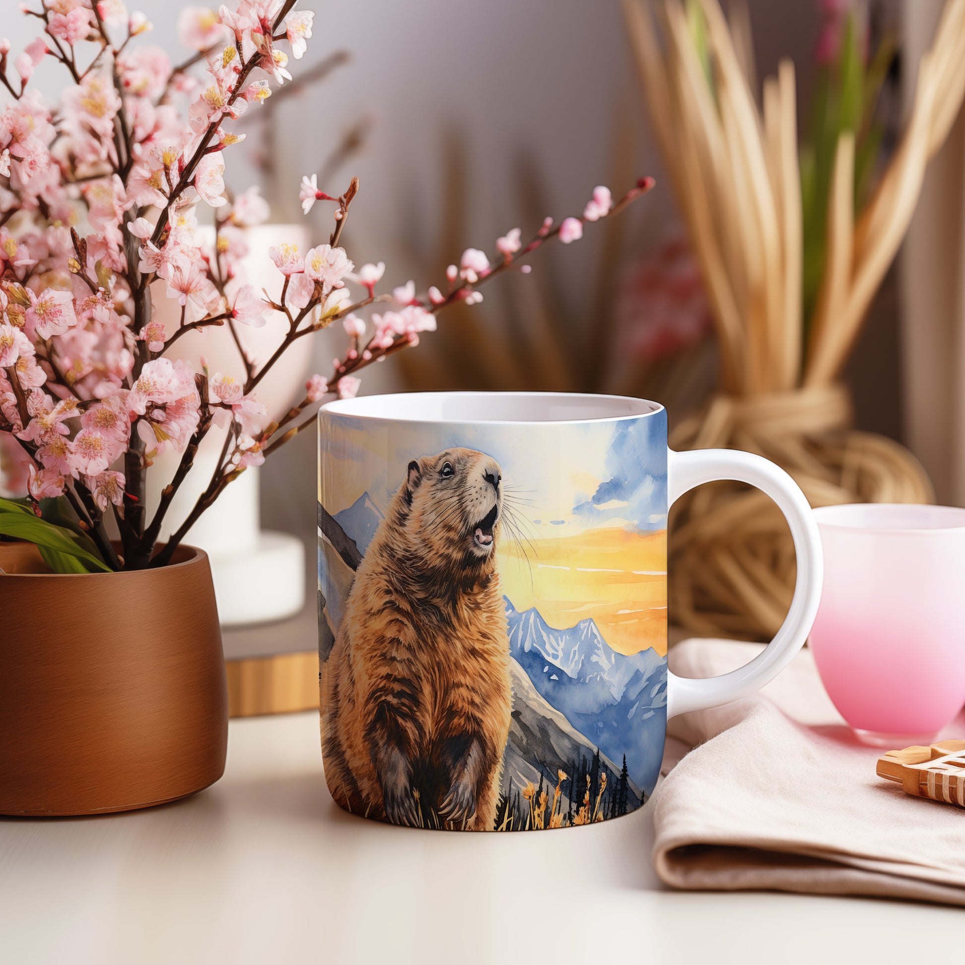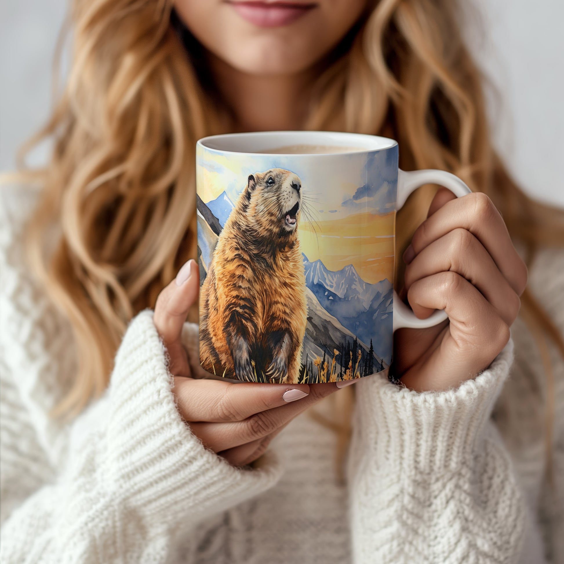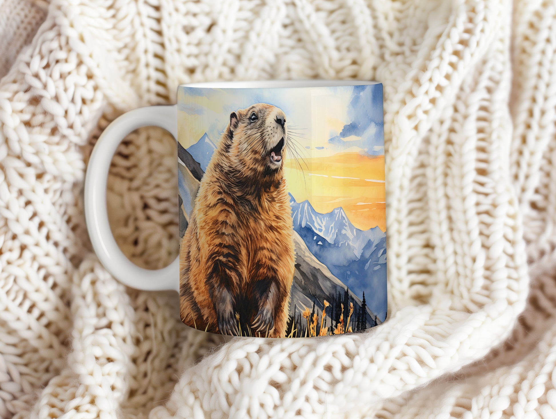 Tento originální hrnek zobrazuje veselého sviště na pozadí horské scenérie při západu slunce. Je ideální pro milovníky přírody a skvělým dárkem pro každého, kdo si rád vychutná ranní kávu nebo čaj. Materiál: keramika. Objem: 330 ml. Vhodné do myčky i mikrovlnky. Díky svému designu přináší radost do každého dne.