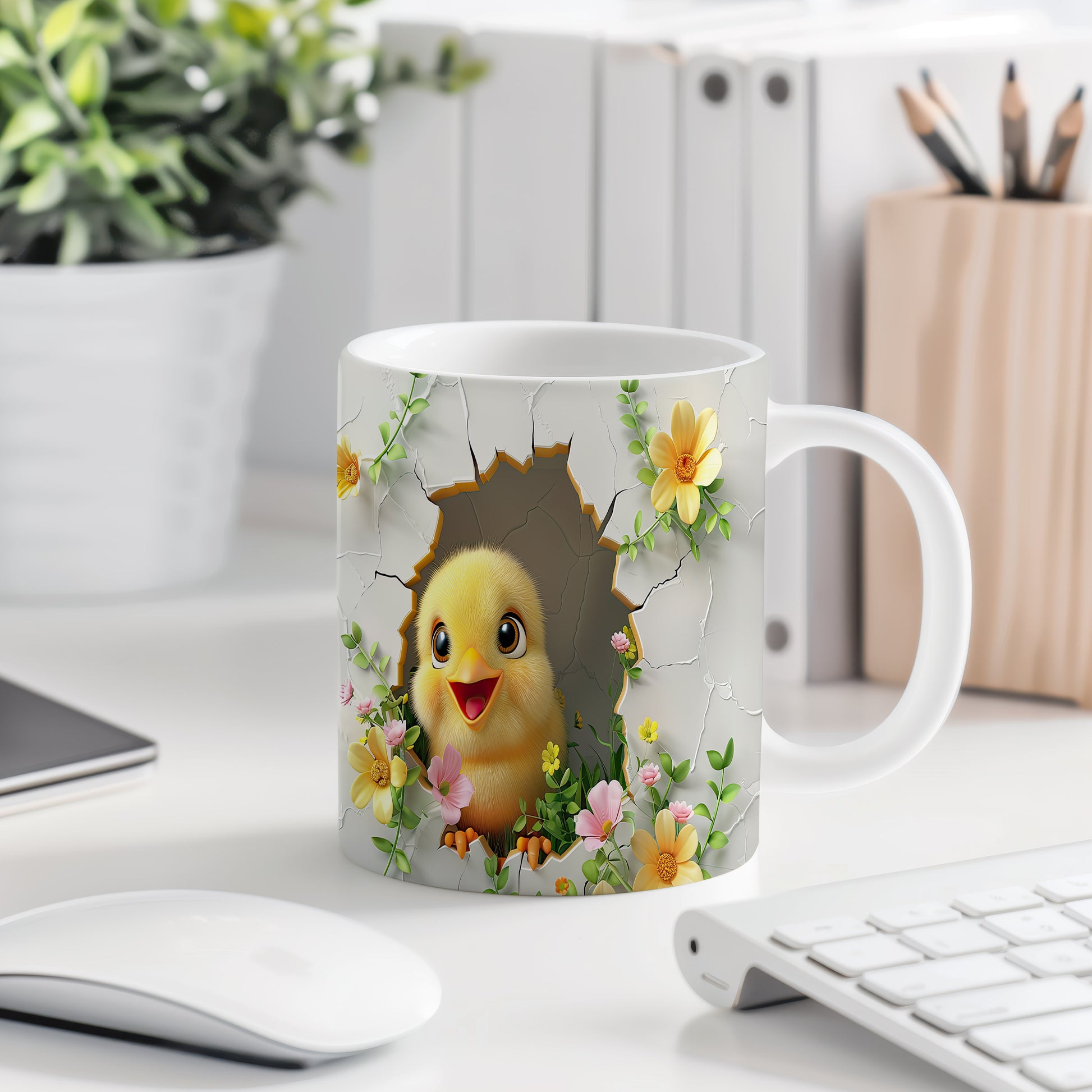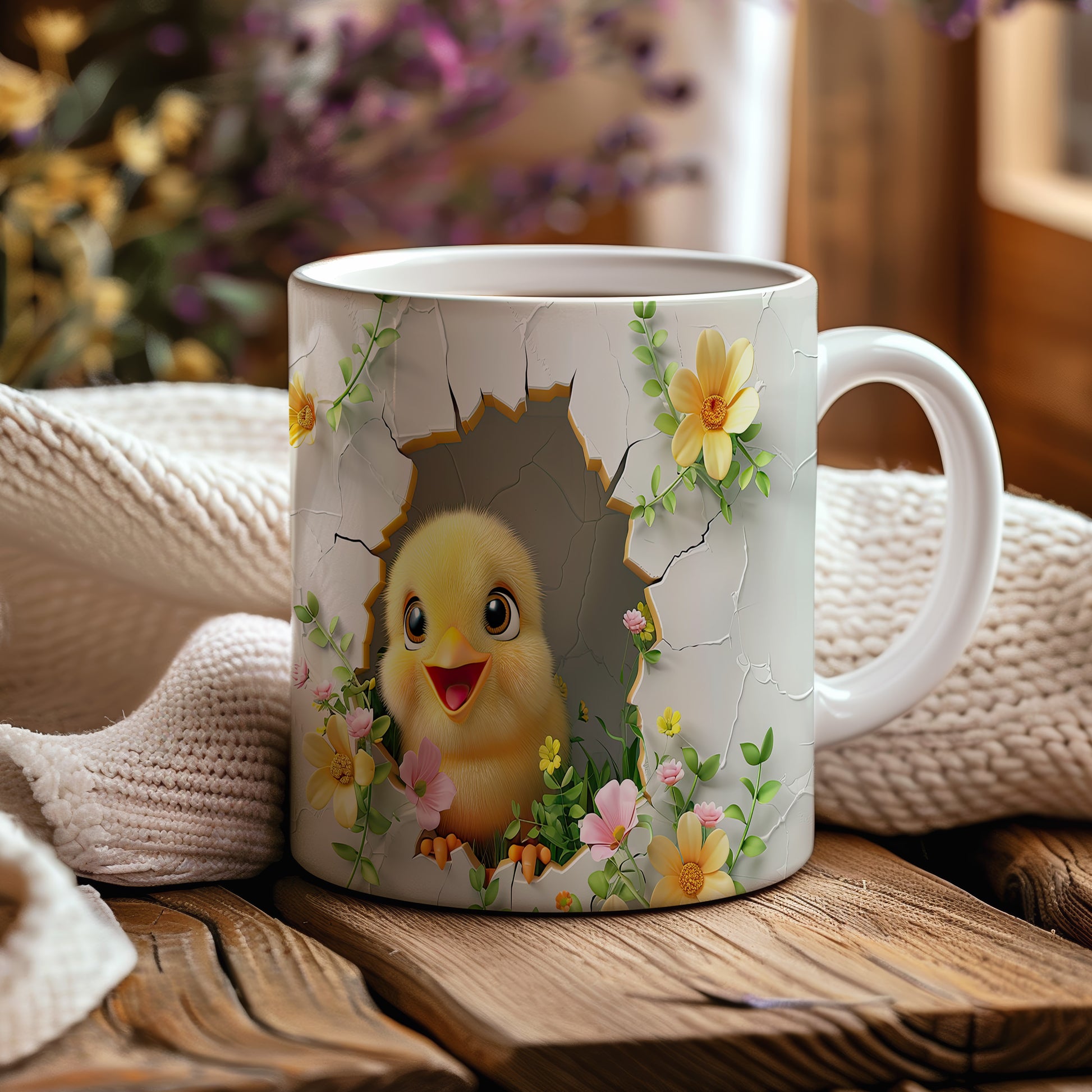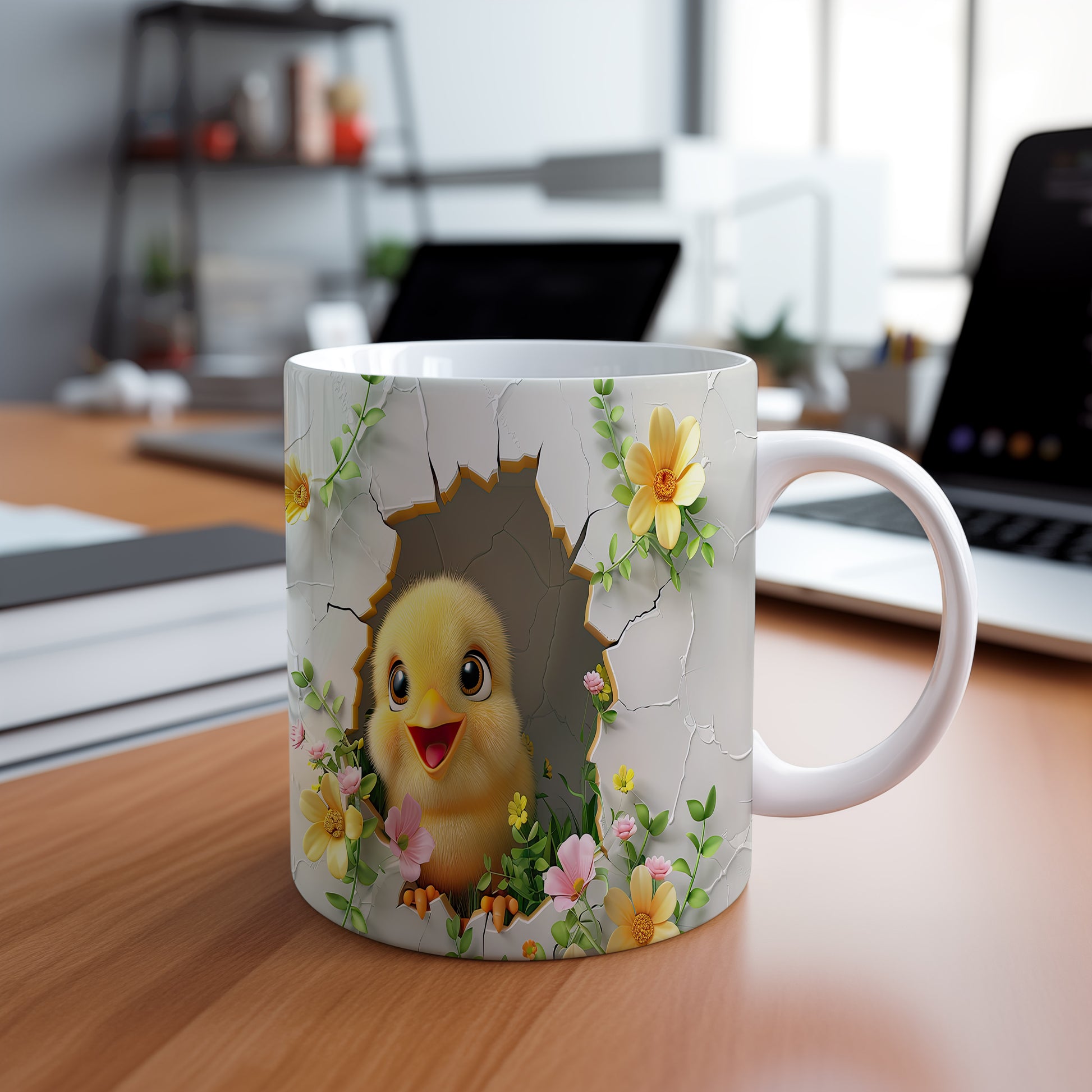Tento hrnek zobrazuje roztomilé kuřátko vycházející z vajíčka v květinovém ráji. Je ideální pro milovníky jara a přírody, skvělý tip na dárek pro přátele nebo rodinu. Materiál: keramika. Objem: 330 ml. Vhodné do myčky i mikrovlnky. Díky svému designu přináší radost do každého dne.