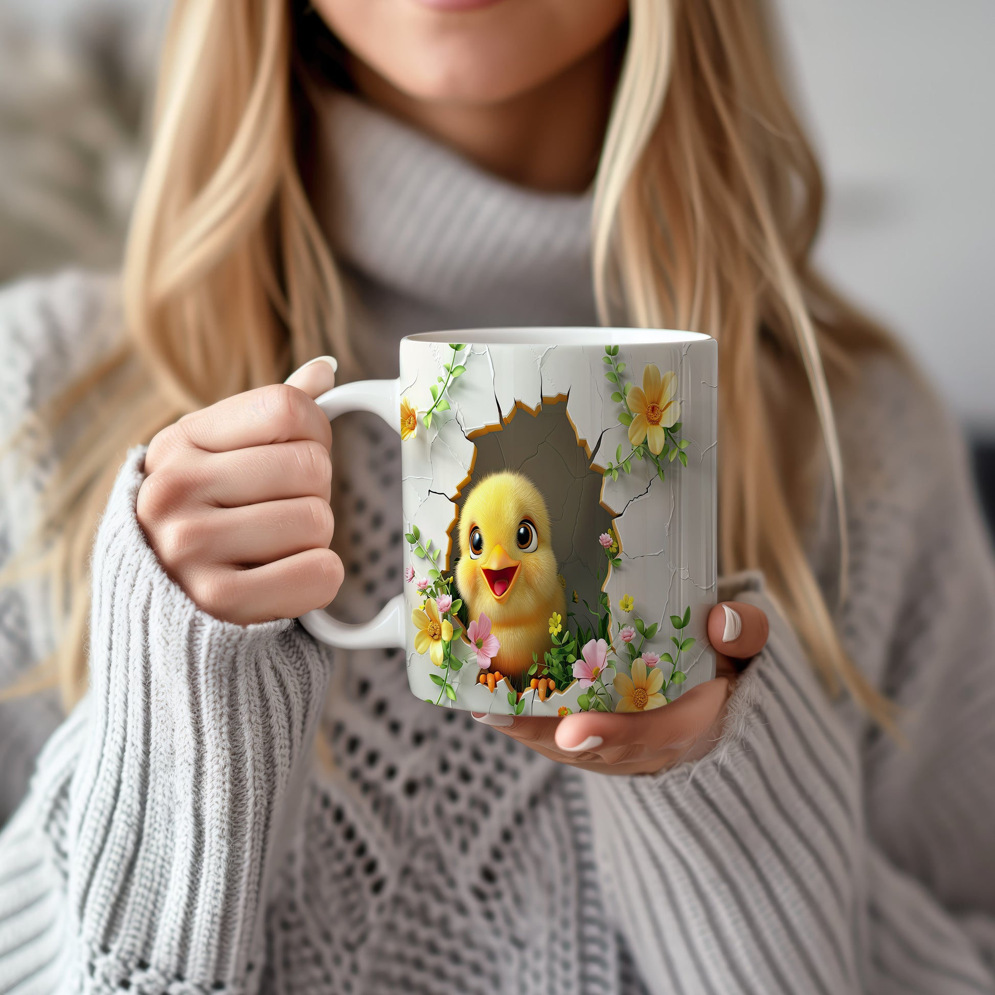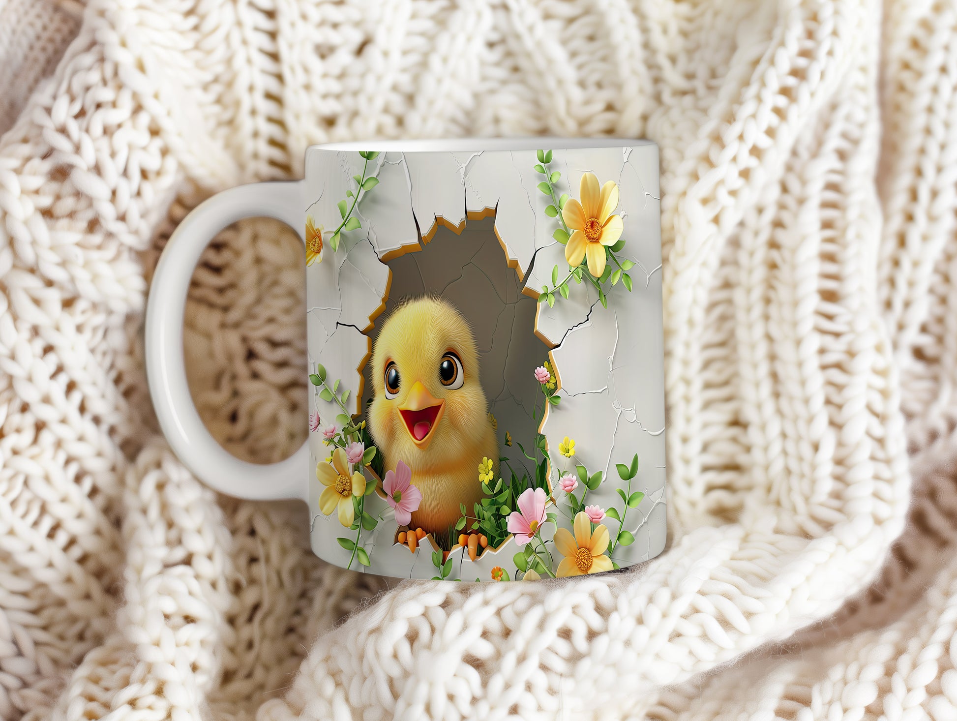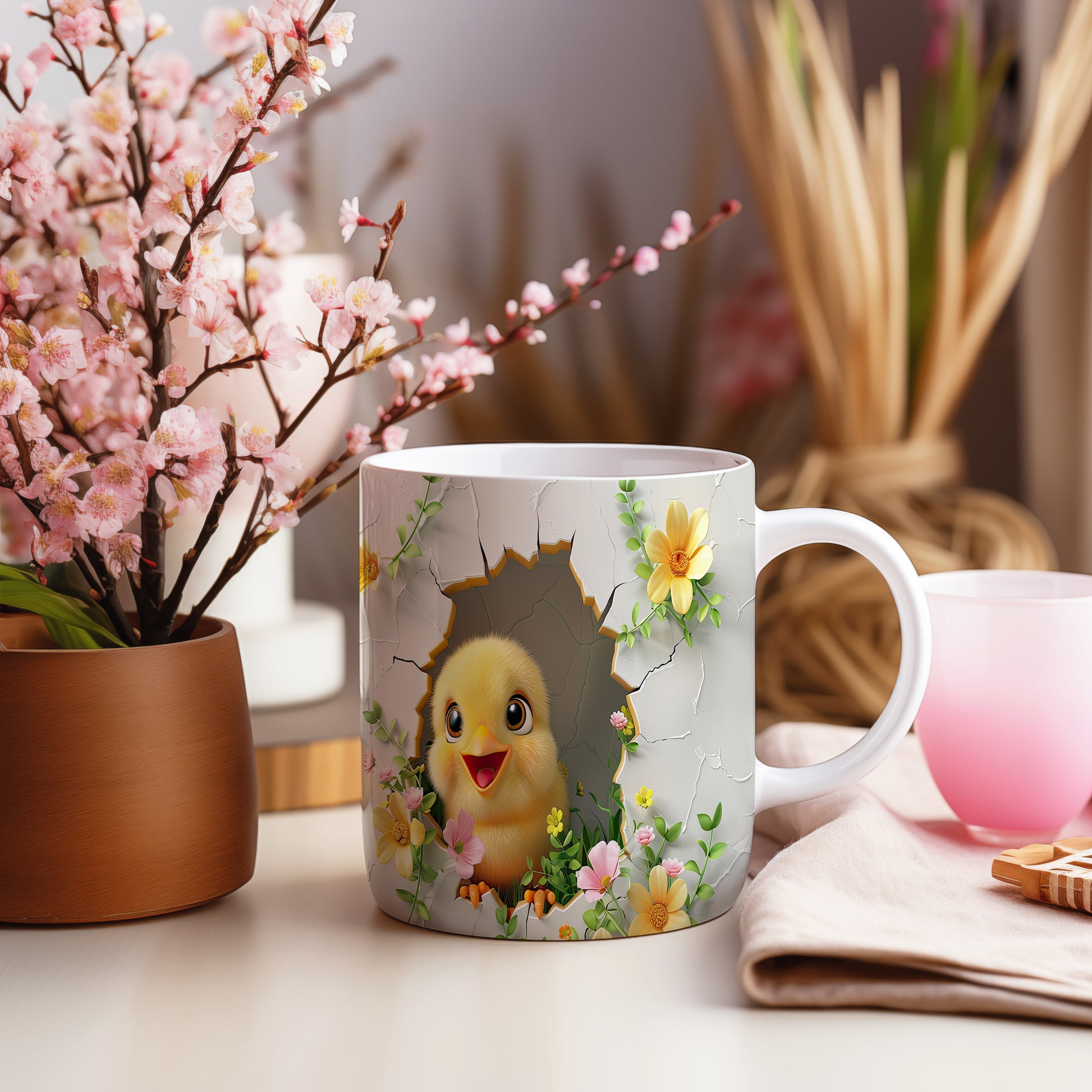 Tento hrnek zobrazuje roztomilé kuřátko vycházející z vajíčka v květinovém ráji. Je ideální pro milovníky jara a přírody, skvělý tip na dárek pro přátele nebo rodinu. Materiál: keramika. Objem: 330 ml. Vhodné do myčky i mikrovlnky. Díky svému designu přináší radost do každého dne.