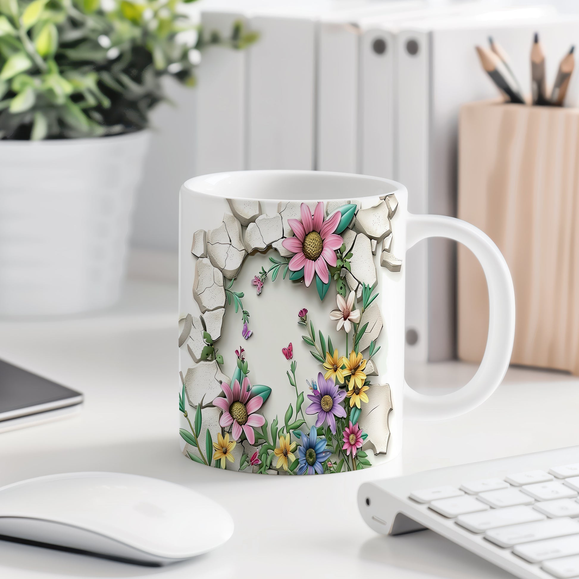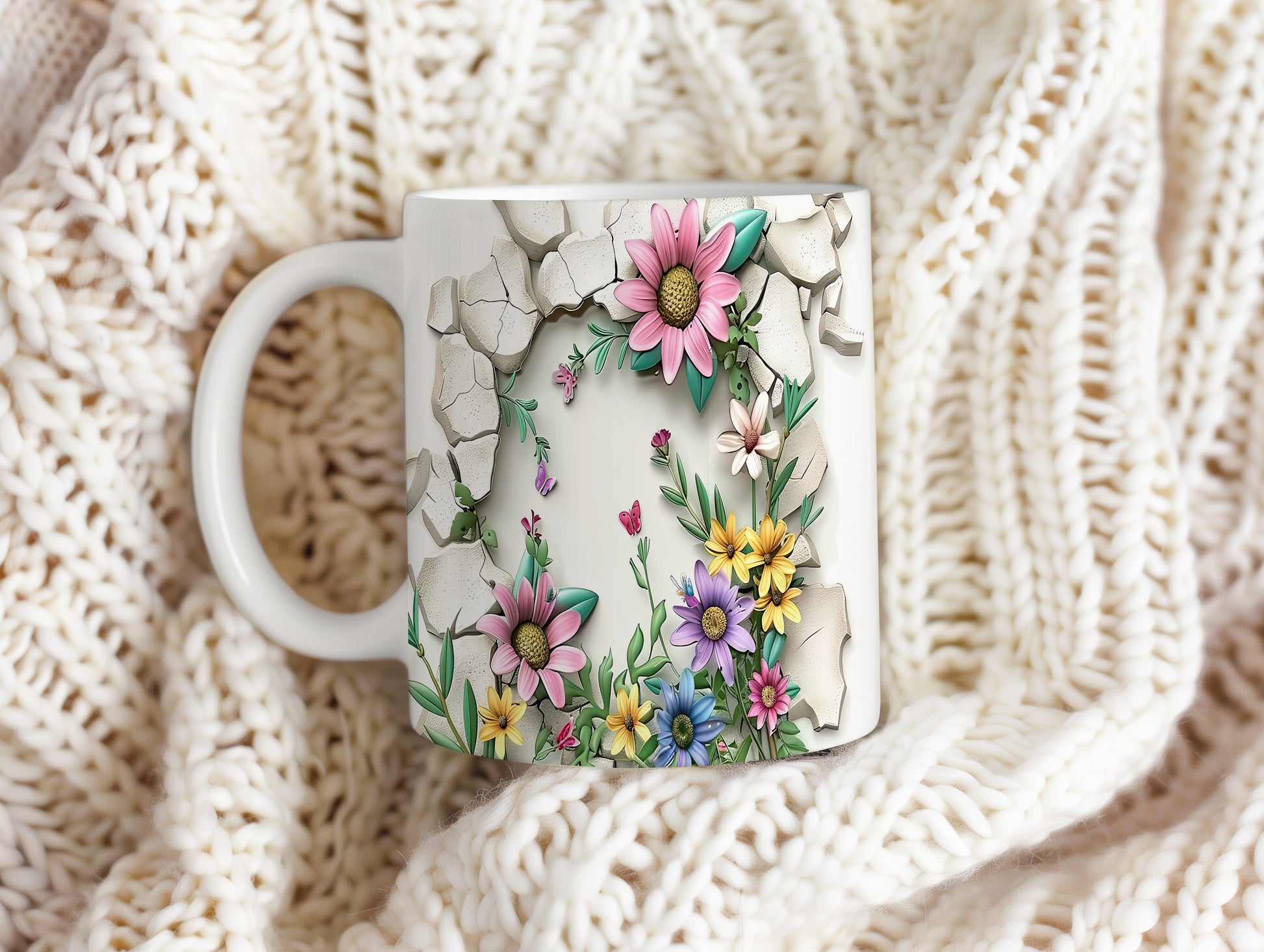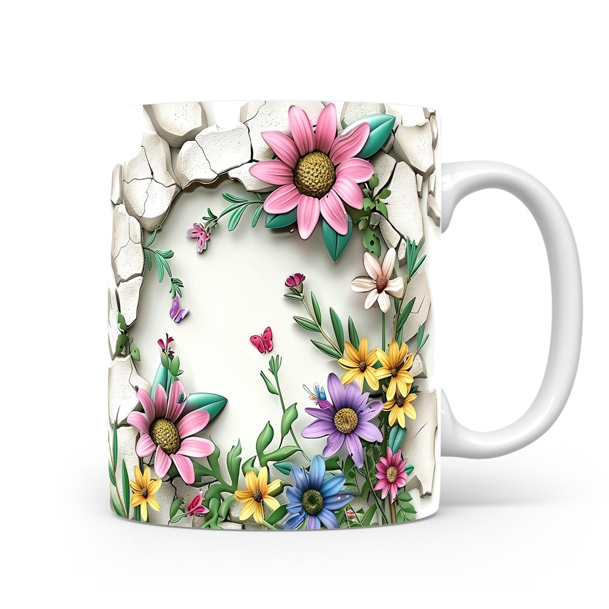 Hrnek s veselými květinami a motýlky v růžových tónech