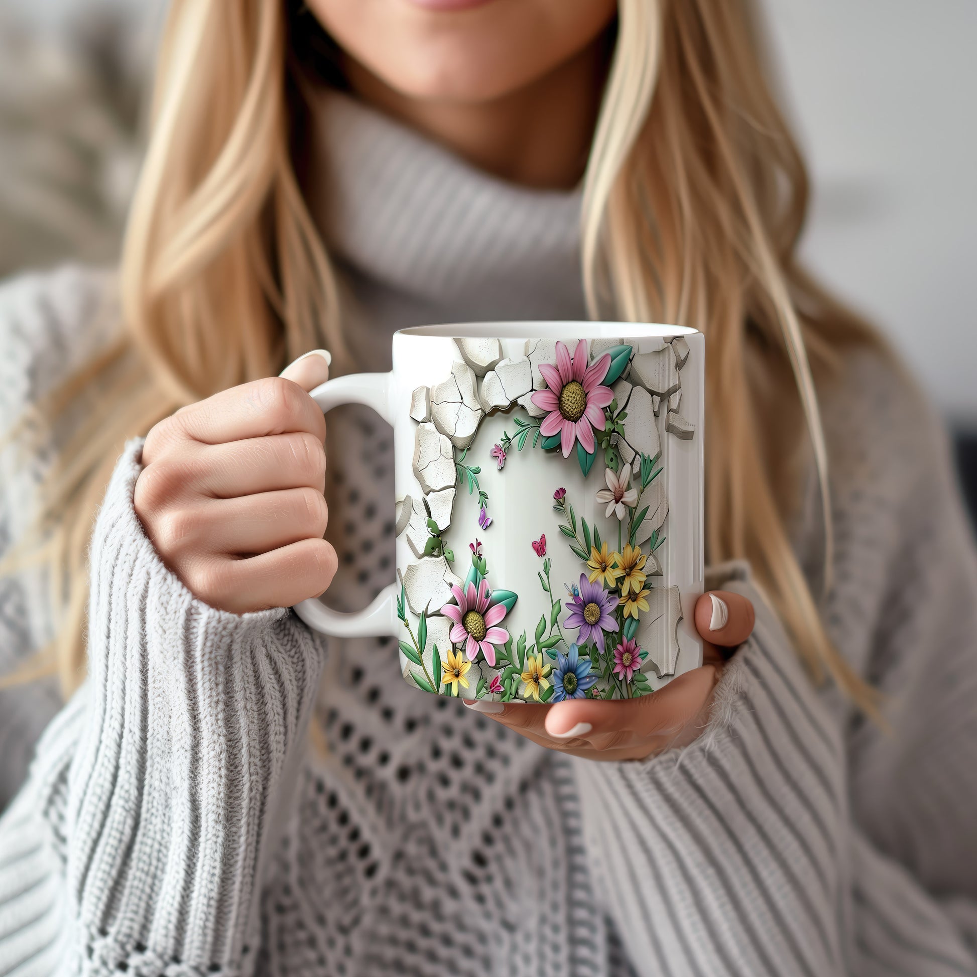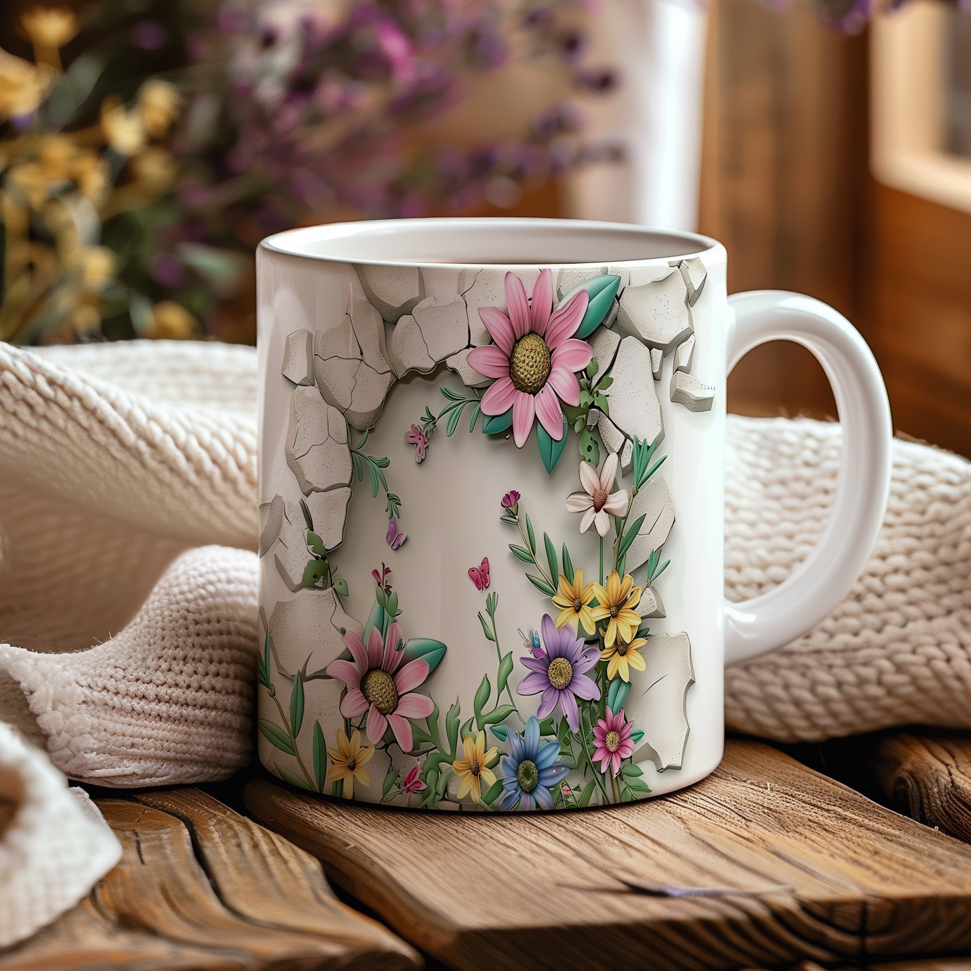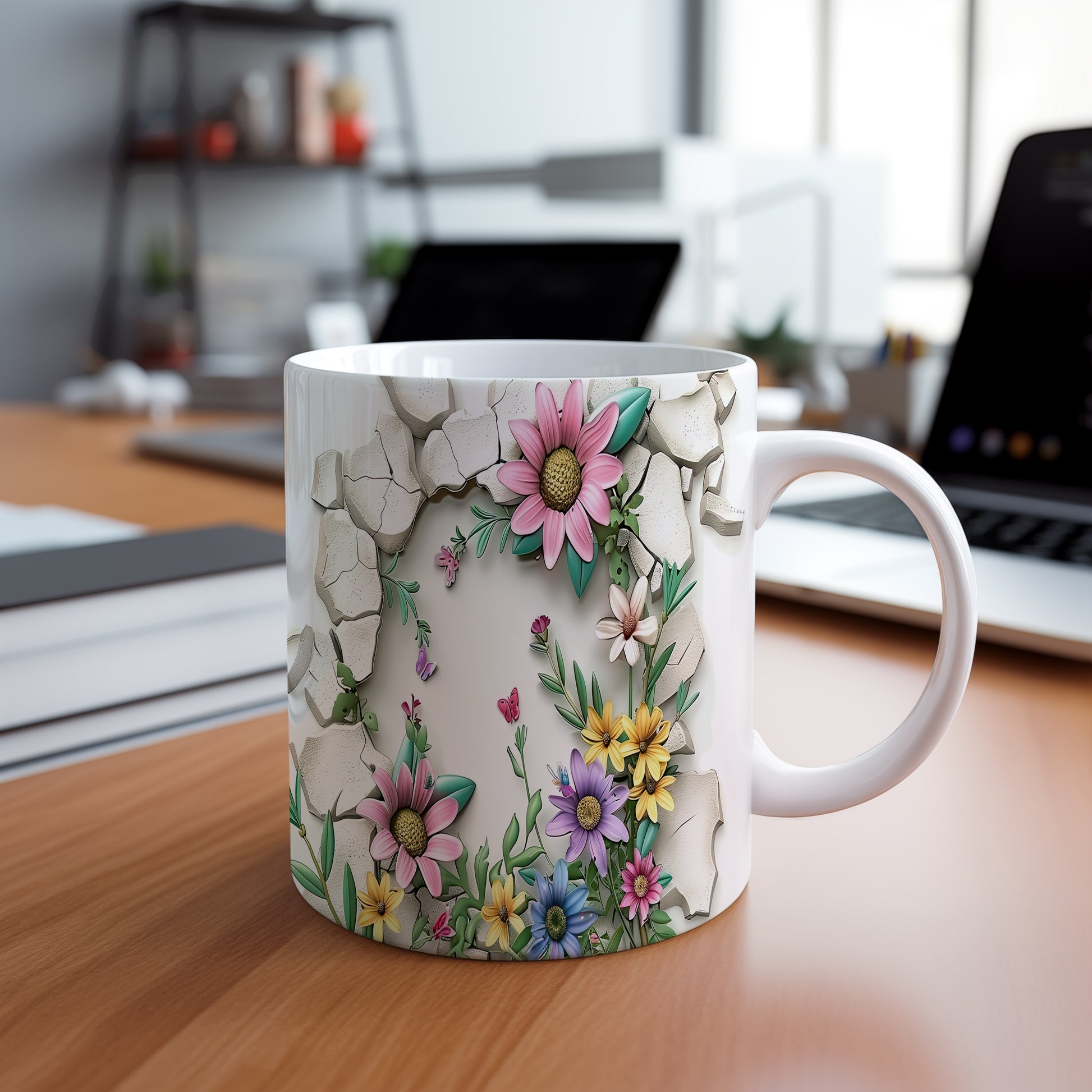 Hrnek s veselými květinami a motýlky v růžových tónech